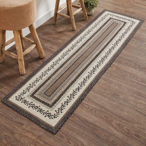 Concentric braided designs and lovely stenciled Vining Florals add true charm to this classic rectangle rug runner and your home. Filled with shades of black, cream, gray, and tawny, the jute/cotton/acrylic-blend rug features a .25" thick, machine-braided and stitched design. The included PVC rug pad provides a helpful nonslip base. Spot clean only. Imported.