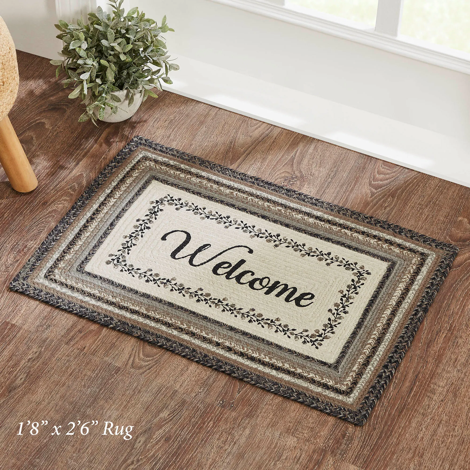 Concentric braided designs and lovely stenciled Vining Florals add true charm to this classic rectangle accent rug and your home. Filled with shades of black, cream, gray, and tawny, the jute/cotton/acrylic-blend rug features a .25" thick, machine-braided and stitched design. The center has a bold "Welcome" in script. The 2'3"x4' size includes a PVC rug pad that provides a helpful nonslip base. The 1'8"x2'6" size has a no-slip latex spray back. Indoor use only. Spot clean only. Imported.