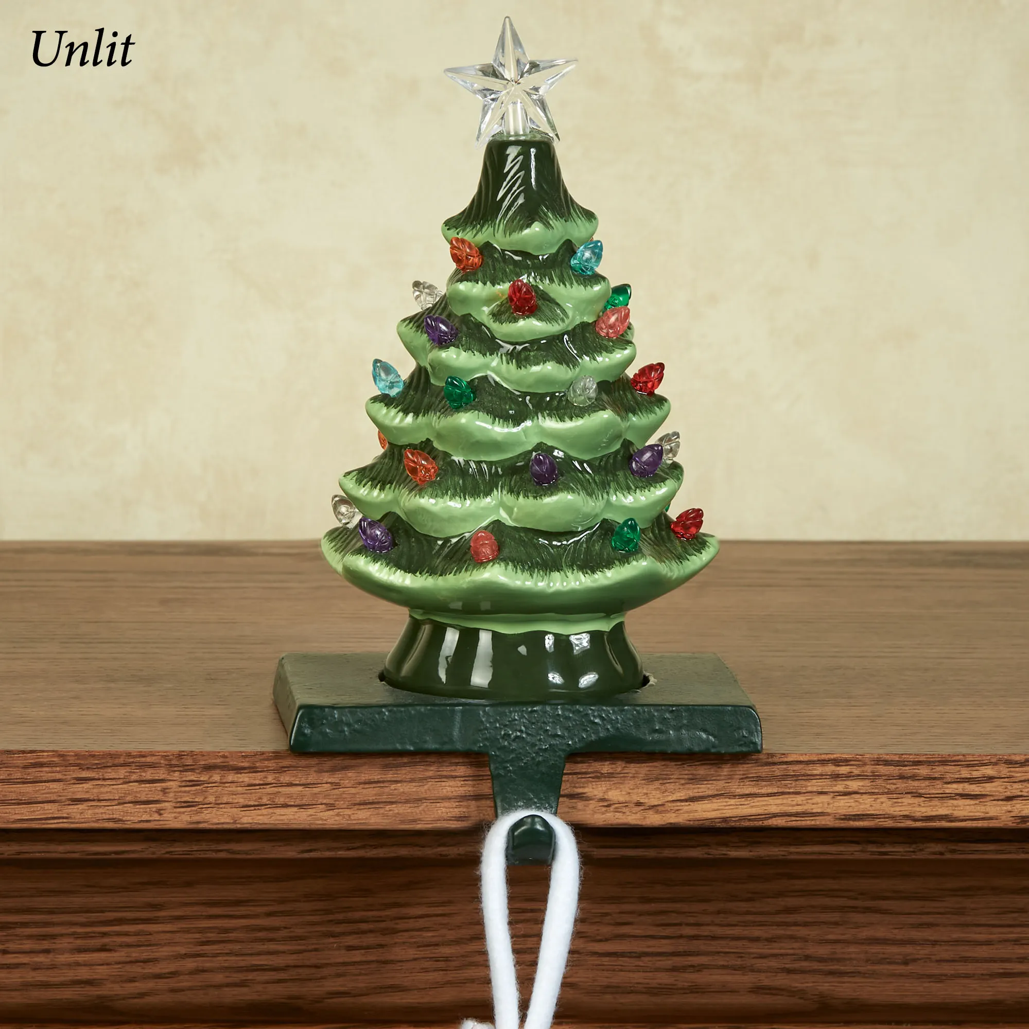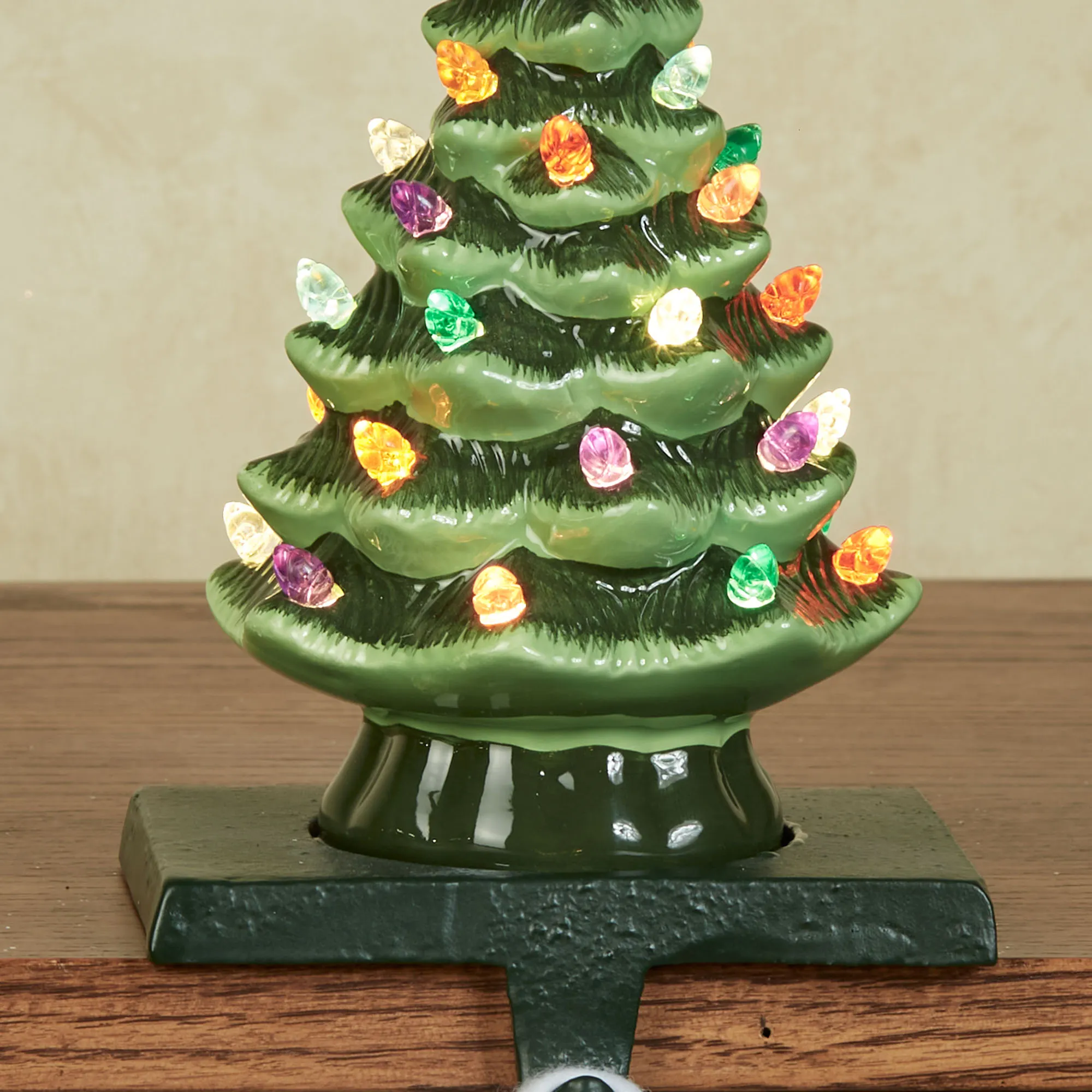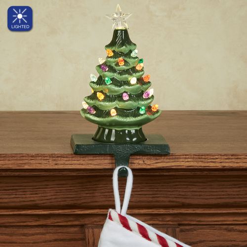 Santa can still place your goodies beneath the Christmas tree with the Vintage Tree Lighted Stocking Holder. On a metal base, the stocking holder features a green ceramic tree decorated with colorful acrylic lights and a clear star. Requires two of your AA batteries and operates from the built-in six-hour timer and on/off switch. Overall, measures 5"Wx4.5"Dx8.5"H.