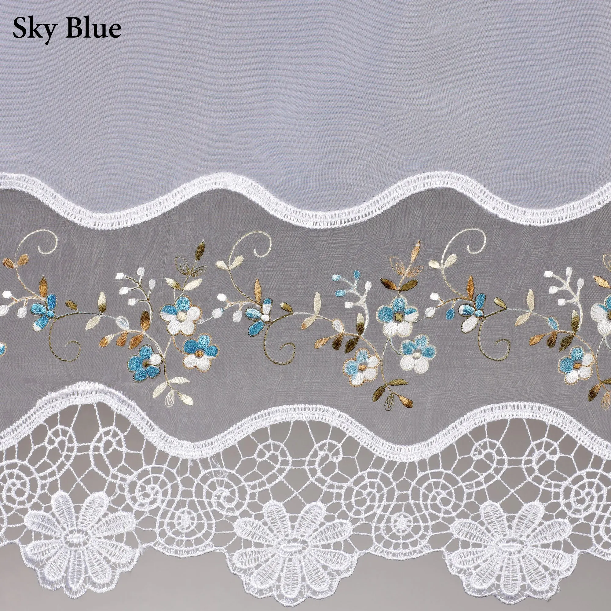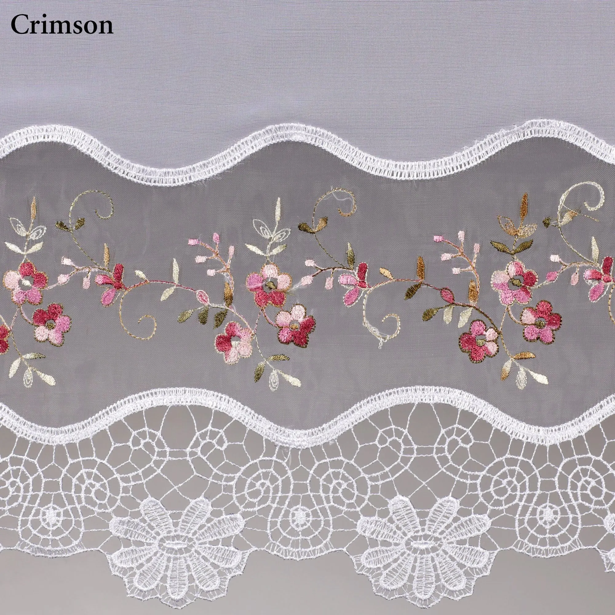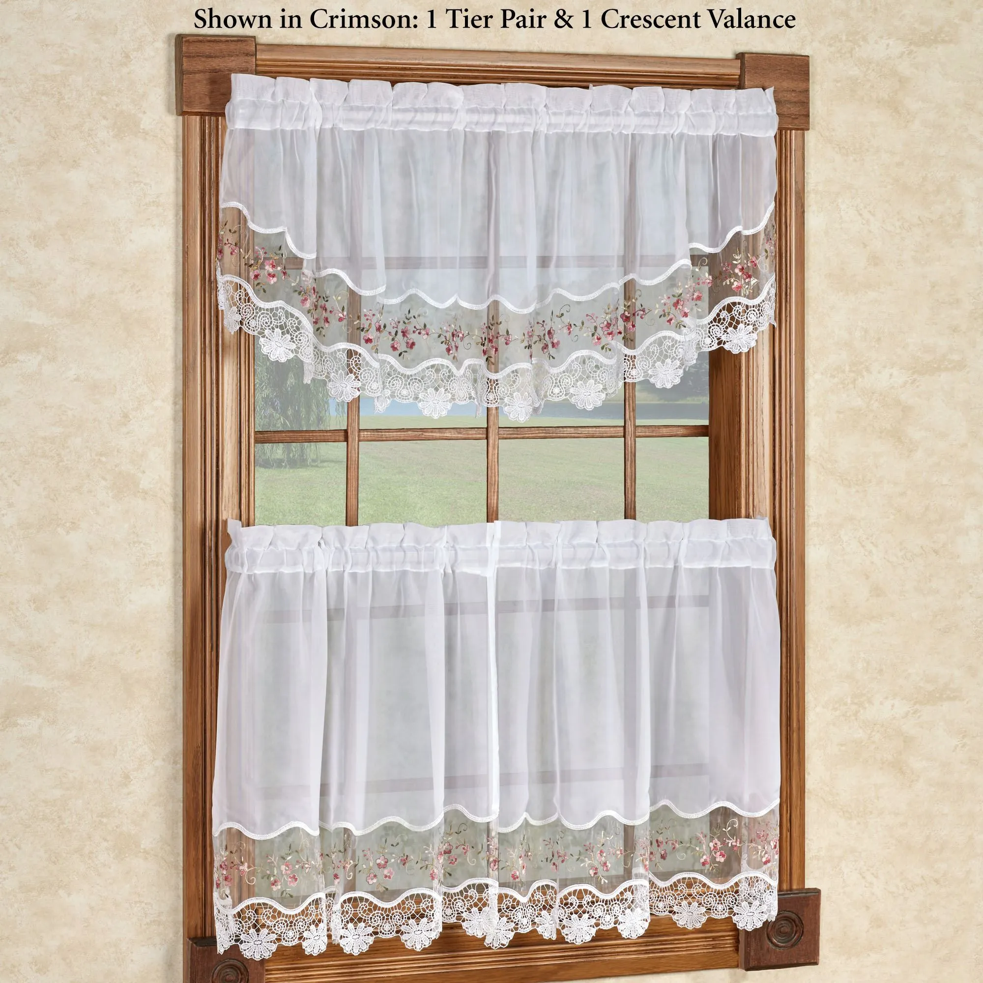 The Vintage Embroidered Macrame Tier Window Treatment has a lot to offer your decor. This semi-sheer polyester window treatment has a sheer bottom border with beautiful floral embroidery. Crimson and Sky Blue are on white; Harvest Gold is on ecru. The scalloped, bottom edge features macrame trim. Specify Tier Pair, Swag Valance Pair, Tailored Valance, or Crescent Valance. Window treatment has 1.25" rod pockets. Machine wash. Imported.