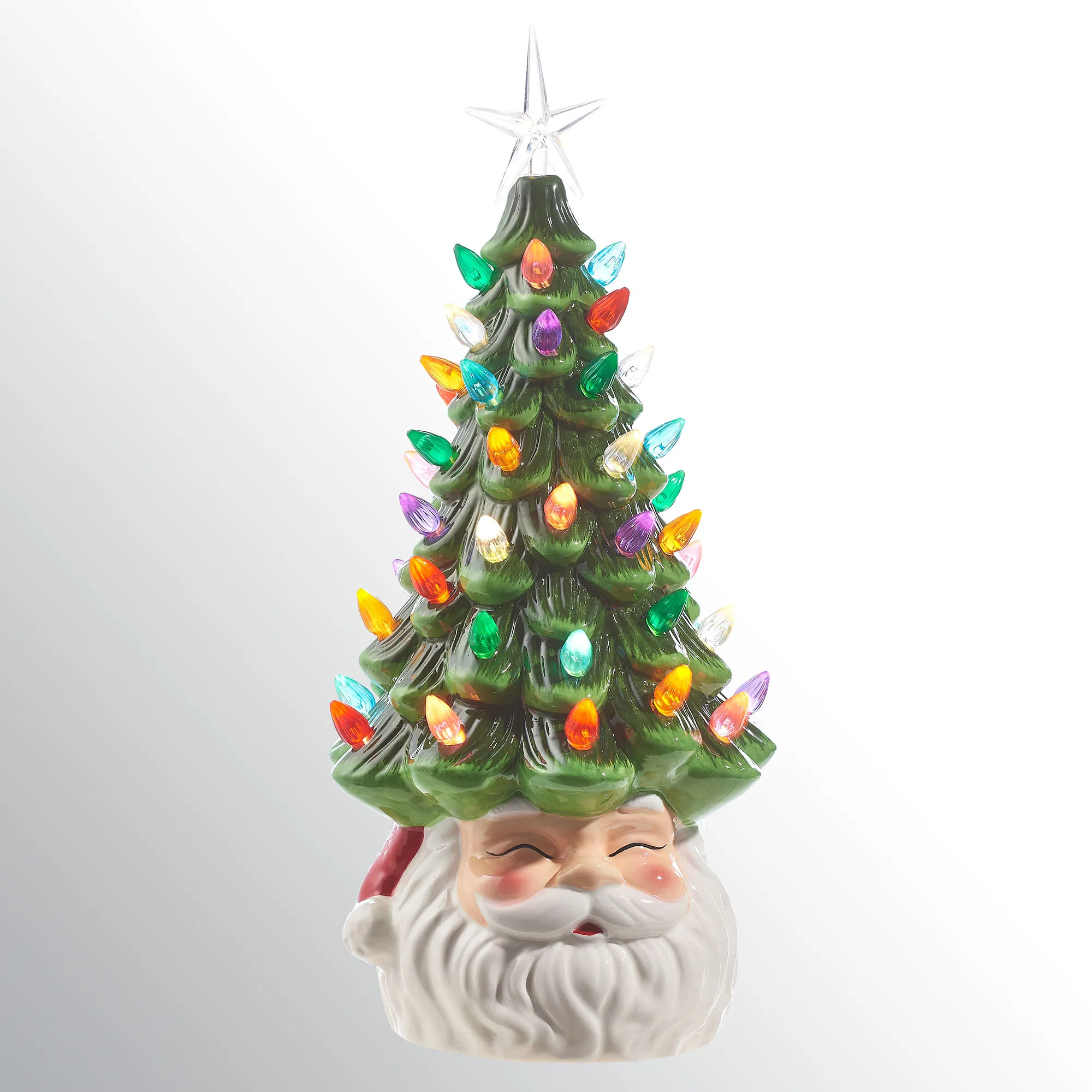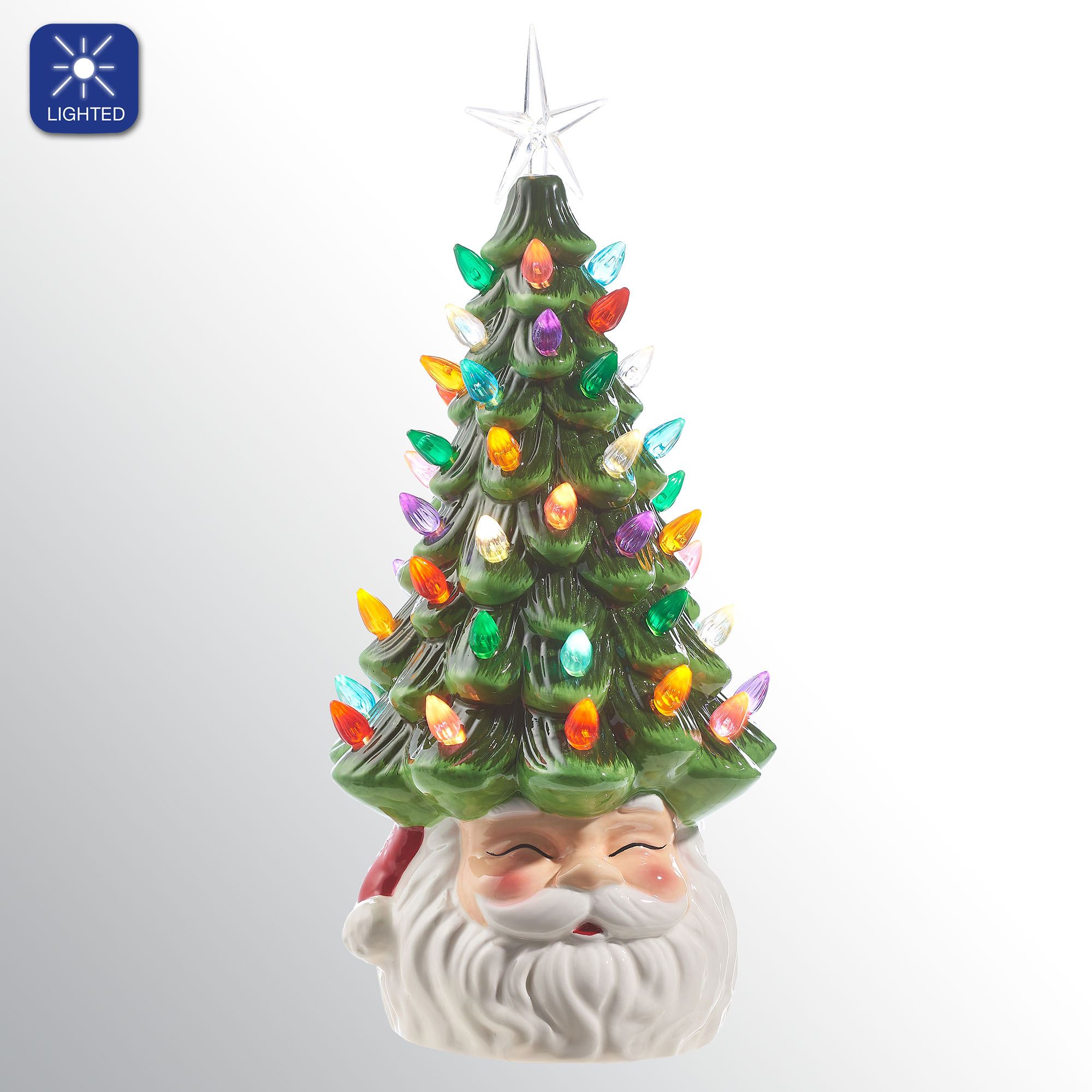 Two iconic Christmas symbols are uniquely displayed on the Vintage Lighted Santa Tree. This porcelain accent features a green tree with a clear acrylic star and colorful lights that glow when lit. Santa's jolly face is the base. Requires three AA batteries, not included. The on/off/six-hour timer switch is located on the bottom of the base. Measures 6.5"Wx6.5"Dx14"H.