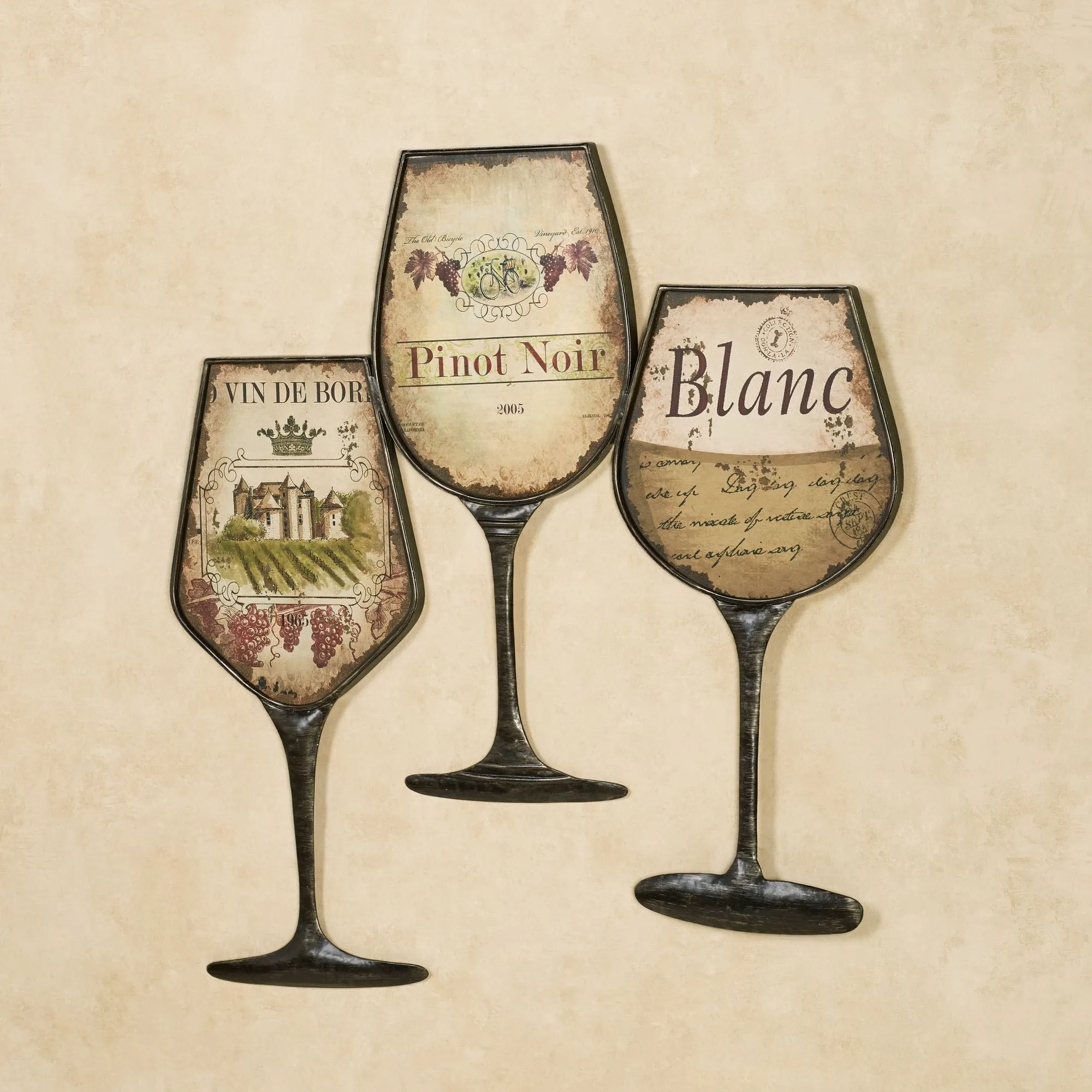 Wine lovers will want the best the Vintage Reserve has to offer. This wine wall art depicts three wine glasses; each glass has a wooden center with a beige background and a metal frame. "Vin de Bor" has a vineyard and grapes. "Pinot Noir" has grapes, and "Blanc" has cursive script. Wine wall art measures 28"Wx0.5"Dx29"H.