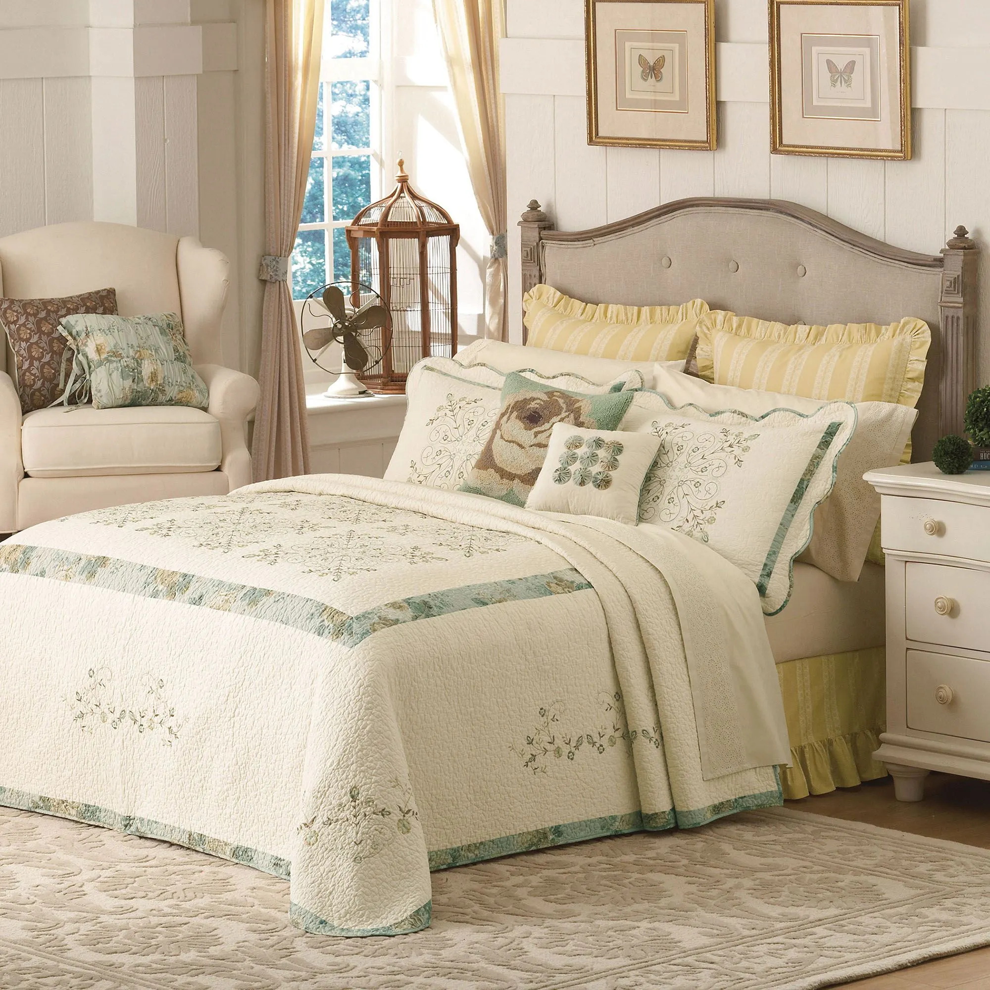 The vermicelli-quilted Bedspread has embroidered florals and medallions on light cream and bands of printed florals on faded spring green. Back is solid light cream. Full/Queen size has a 21" drop; King size has a 22" drop. Bedspread fill is cotton. For bedspread, specify Full/Queen or King.