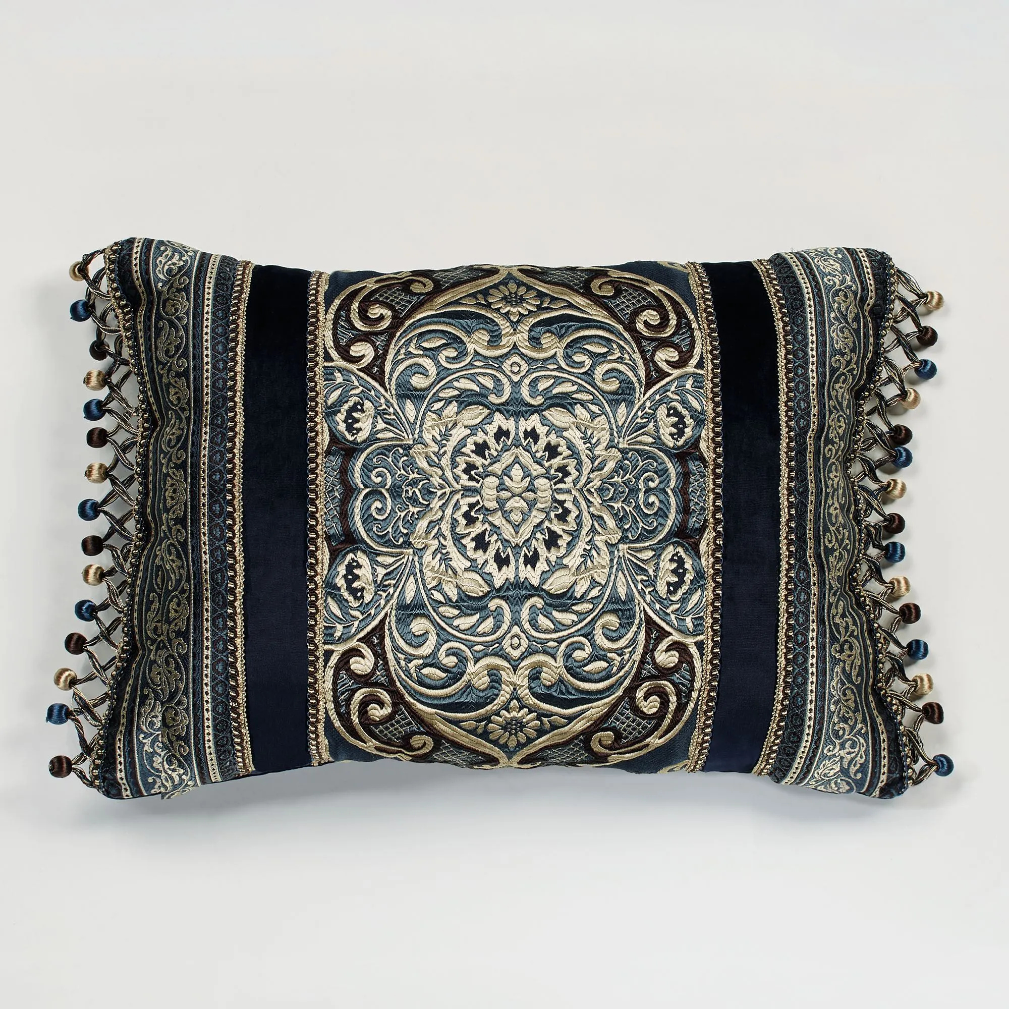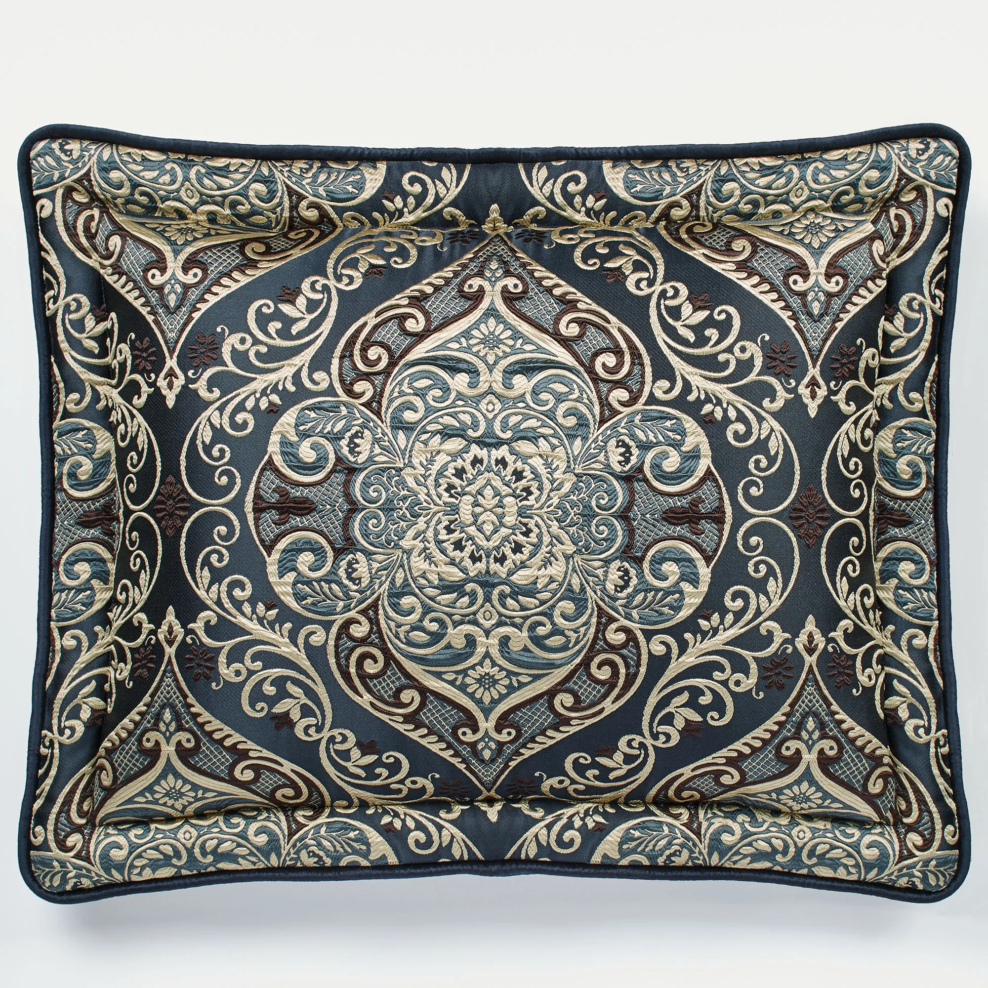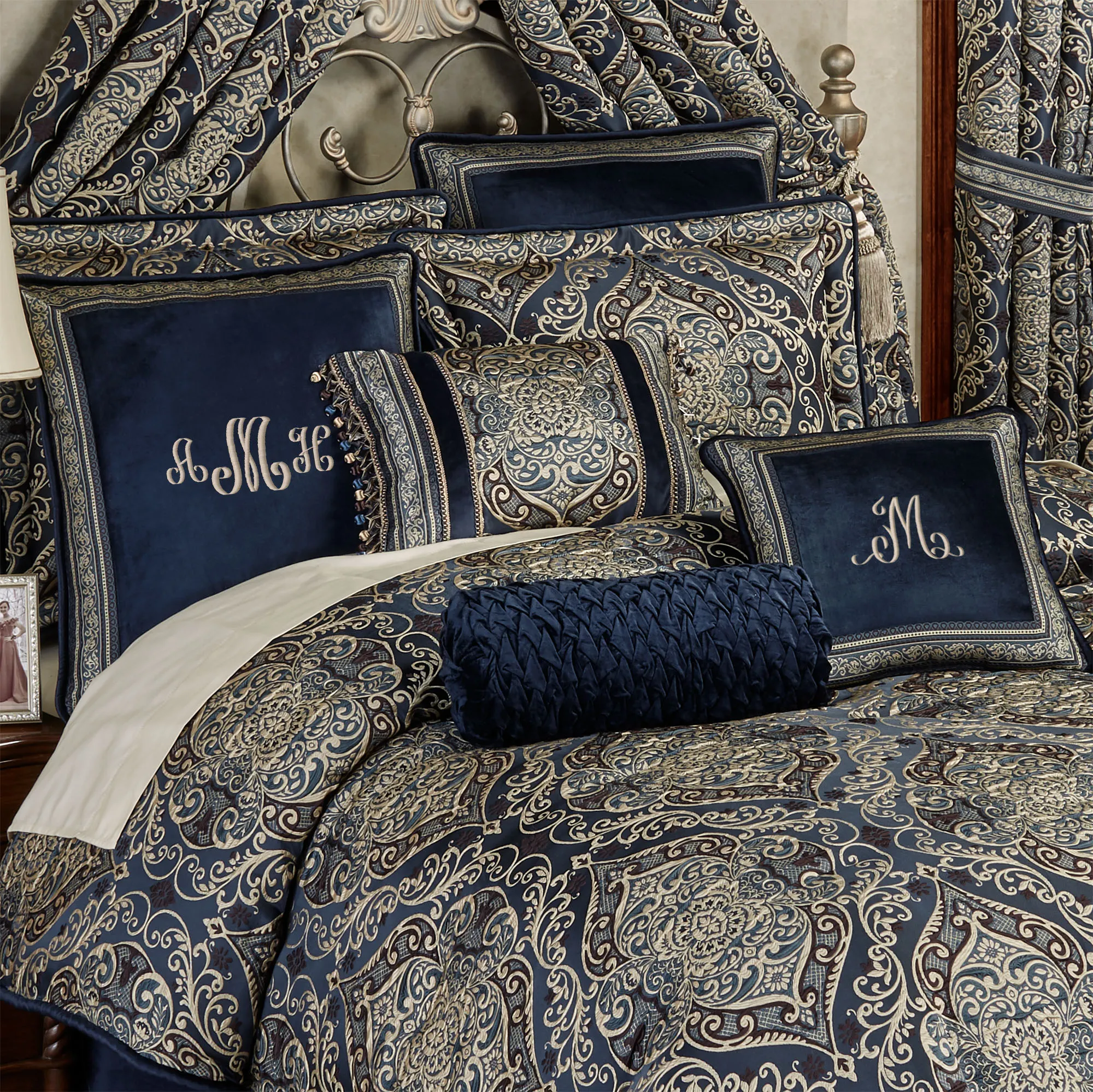 Enhance your bed ensemble with the opulent Virtuoso Bedding Accessories. These polyester accessories have jacquard-woven designs in soft champagne, eggplant, and blue shadow on midnight. The padded, flanged King Sham has a damask design. The padded, solid midnight velveteen European Sham has a mitred stripe frame. The pieced Rectangle Pillow, 14"x22", has damask designs, stripes, and solid midnight velveteen with gimp trim and beaded tassels on the length ends; fill is polyester. Dry clean the shams. Spot clean the rectangle pillow. Imported. Sorry, some accessories shown are no longer available.