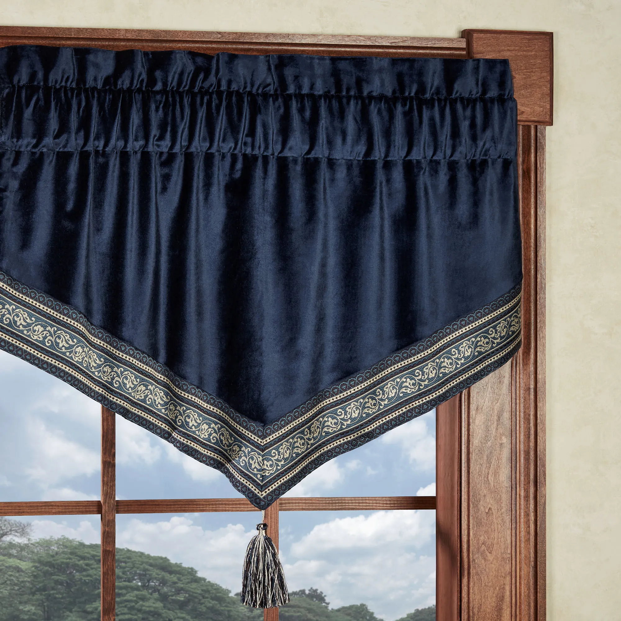 Present a classic Virtuoso in your room with this opulent window treatment. Lined, polyester window treatment has a 3" rod pocket. Specify Swag Valance Pair, Ascot Valance, or Wide Curtain Pair. Swag Valance Pair and Ascot Valance are solid midnight velveteen pieced with stripes. Each Ascot Valance has a 4"L tassel. The tailored Wide Curtains have jacquard-woven damask designs in soft champagne, eggplant, and blue shadow on a midnight background. Curtains include tiebacks. Dry clean. Imported. The curtain pair width is the total width of two panels together.