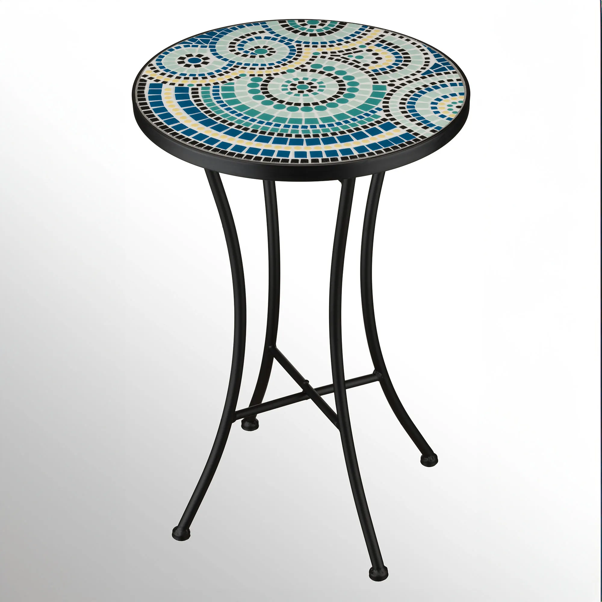 The Walker Outdoor Accent Table celebrates color with artistic flair. Patterned in blue, yellow, ivory, and green, the top features a weighted ceramic mosaic tile design with a variety of unique concentric circle patterns. A durable four-legged metal stand completes the table with a black finish. Perfect for use as a side table or plant stand indoors or outdoors year round, the accent table measures 14"dia.x21"H overall.