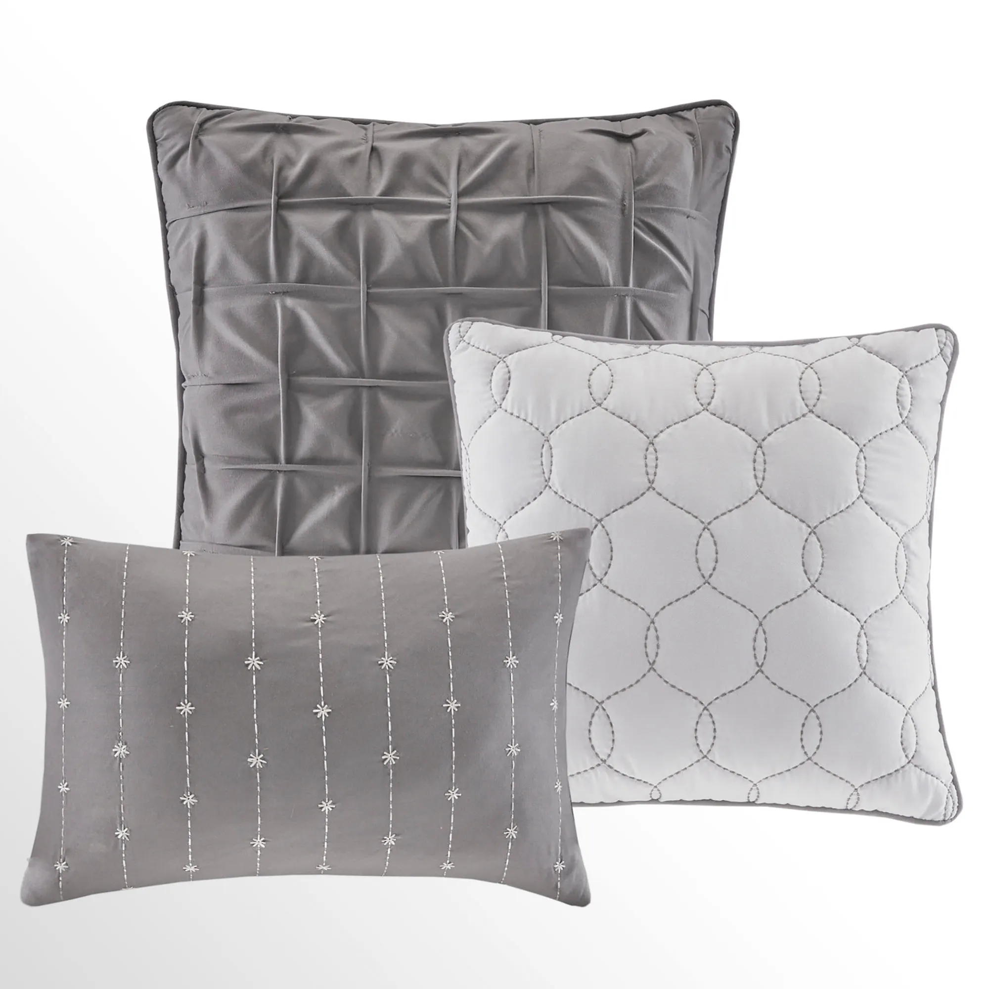 One square pillow is soft gray with overlapping ogee embroidery and piped edges. The other piped square pillow is a solid coordinating color with a square pintucked design. Rectangle pillow is a solid color with dash and star embroidered stripes and tailored edges.
