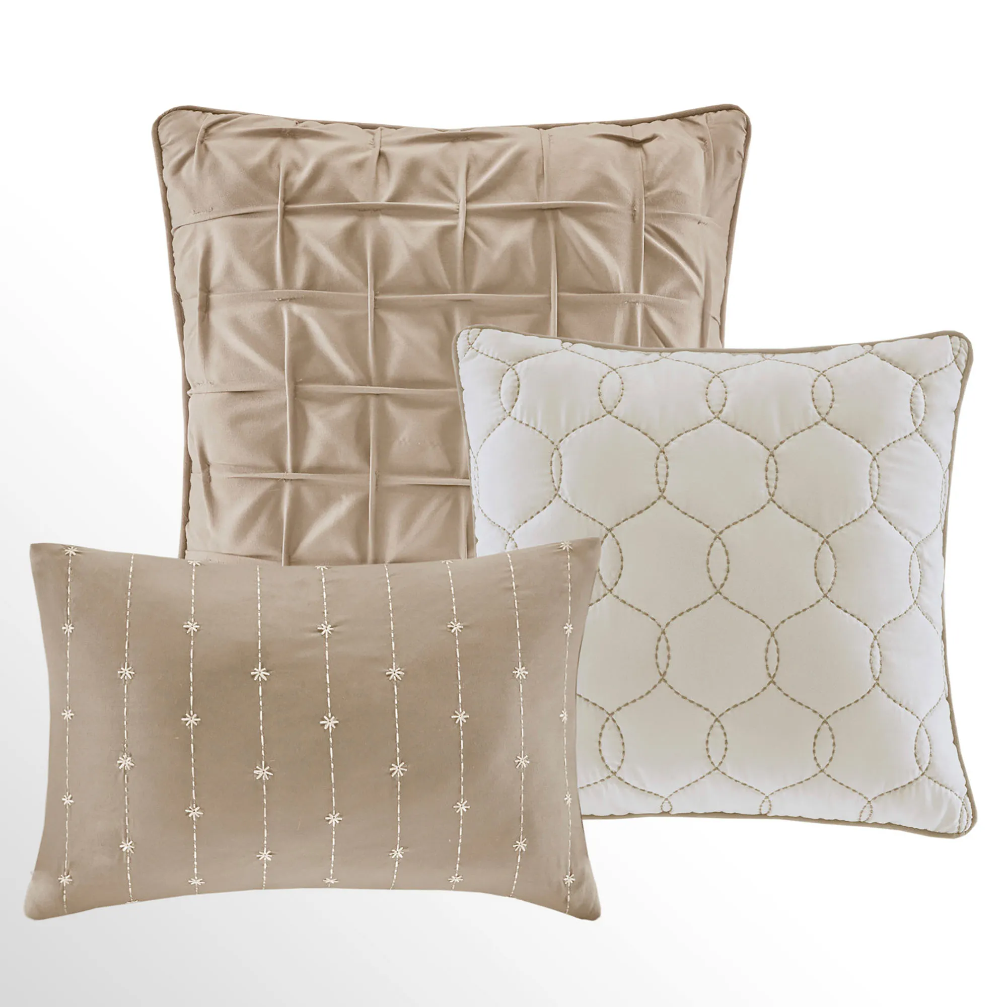 One square pillow is off-white with overlapping ogee embroidery and piped edges. The other piped square pillow is solid tan with a square pintucked design. Rectangle pillow is solid tan with dash and star embroidered stripes and tailored edges.