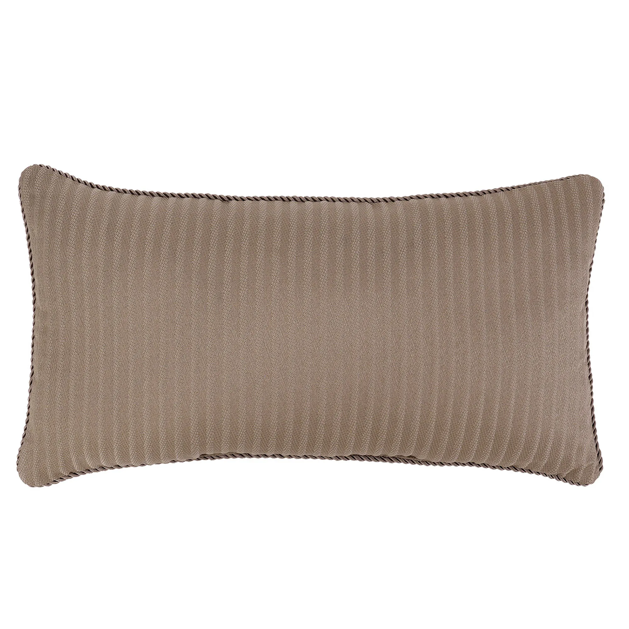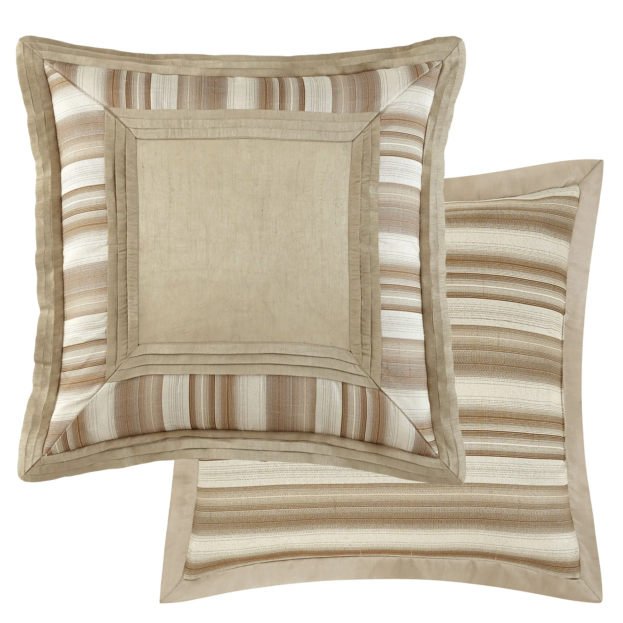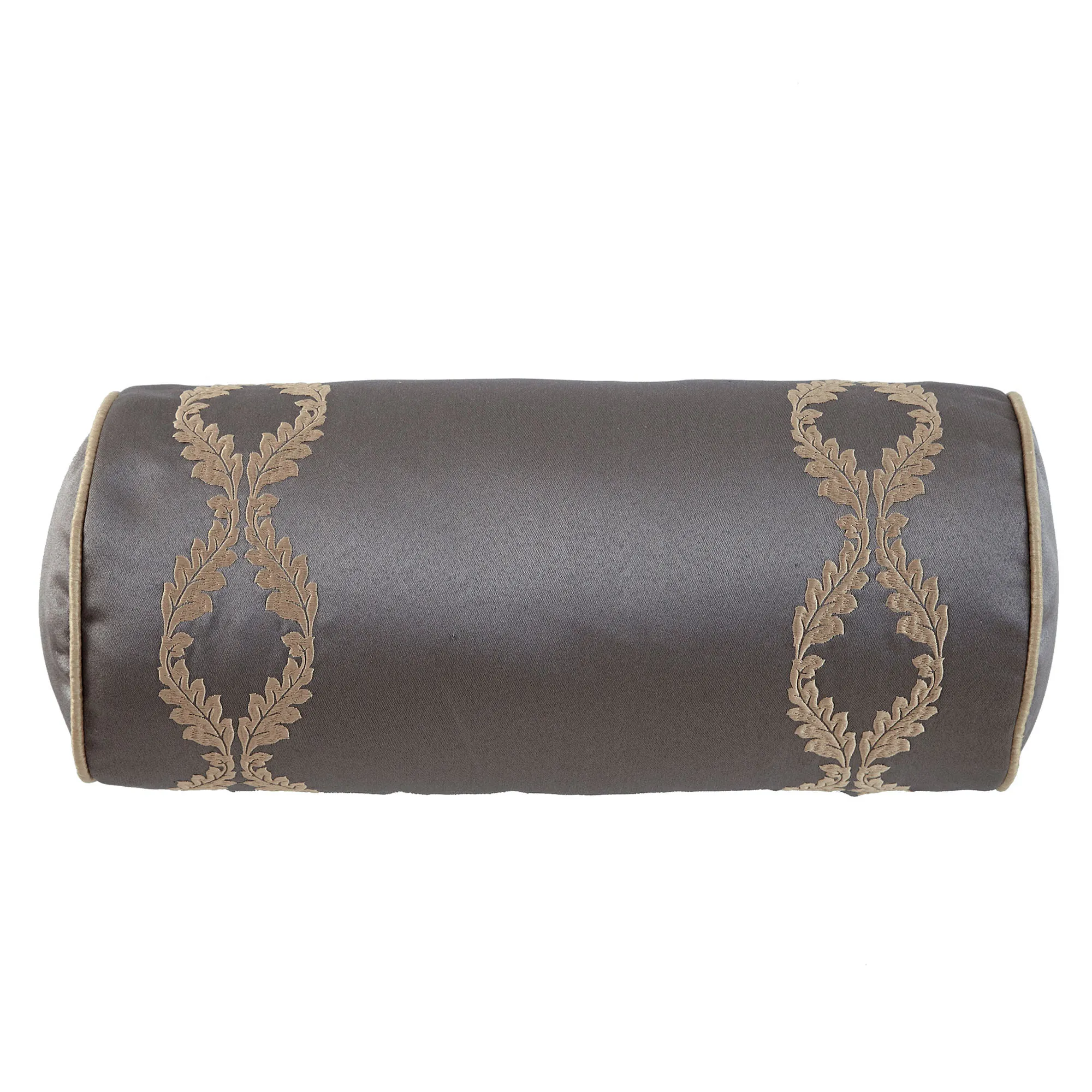 Pillows: The piped Neckroll is charcoal with dark beige embroidered leaf ogees. The pieced Square has a beige center with a mitred frame of pleats; ivory, beige, and brown stripes; and pleated flanged edges; reverses to all-over stripes. The reversible Rectangle has woven light taupe stripes and twist cording edges.