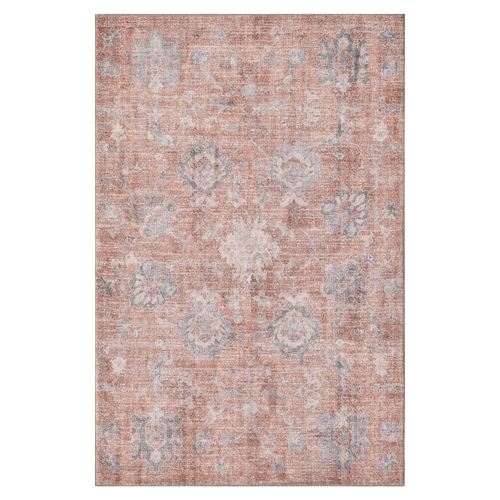 The Elba Rug looks great in any space. This power-loomed polyester and cotton area rug, .25" thick, features a printed floral and vine motif with an antique look. Colors include shades of sienna brown, gray, cream, green, and ivory. Backing is cotton. Machine washable. Imported.