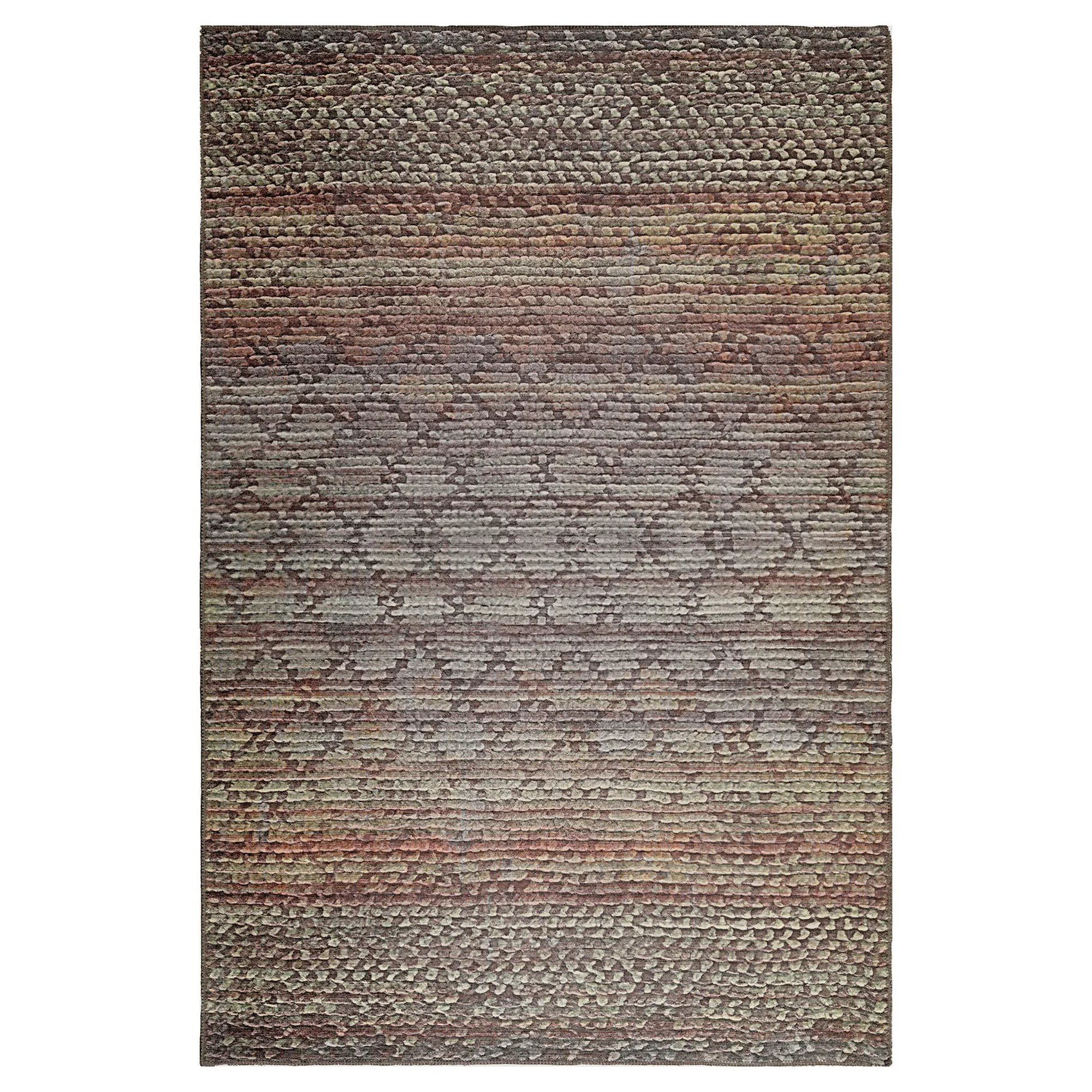 Geometrics are styled with modern flair on the Elystan Rug. This power-loomed polyester and cotton area rug, .25" thick, has diamond designs. Colors include shades of green, brown, charcoal, maroon, violet, mint, and coral. Backing is cotton. Machine washable. Imported.