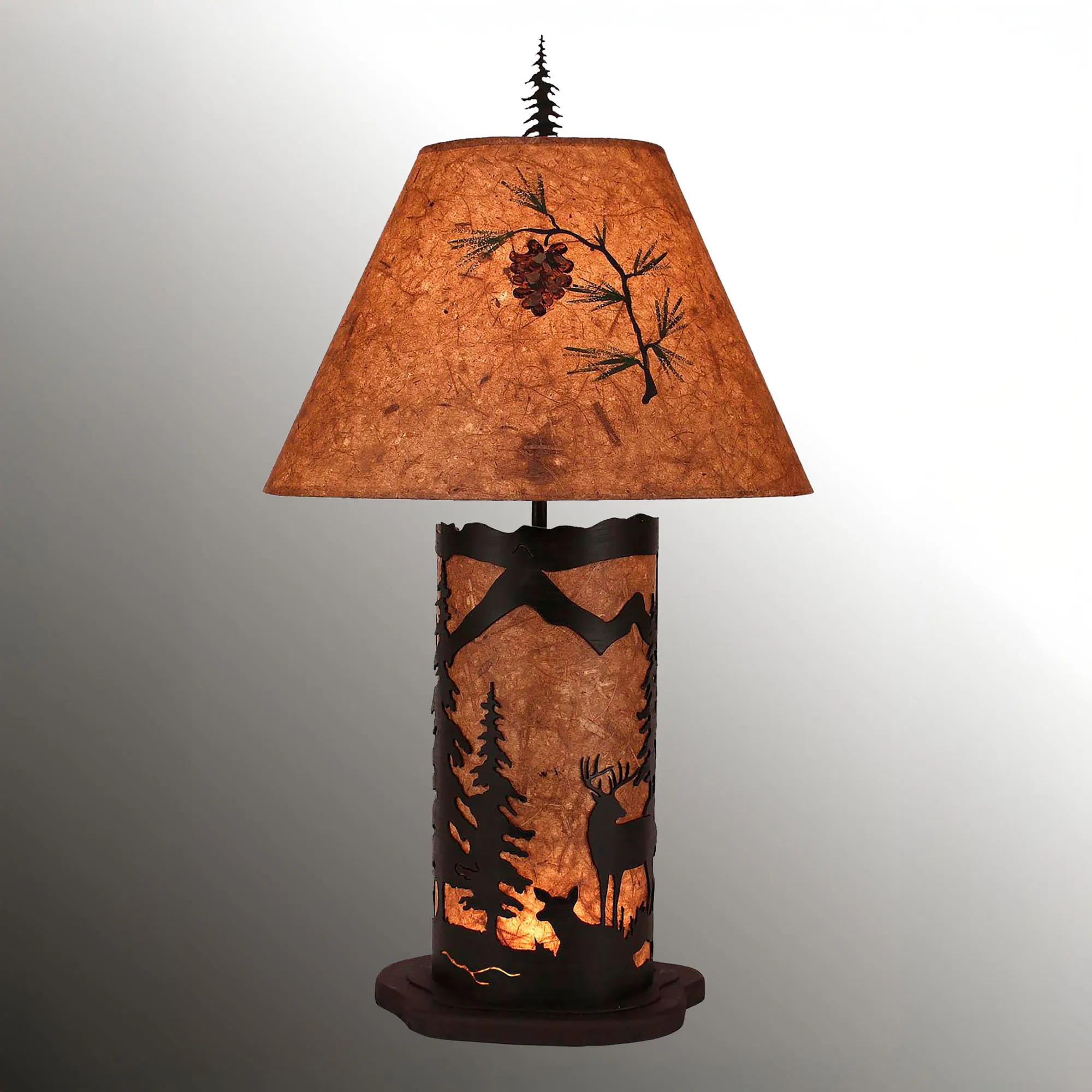 Watchful Deer take in the wild sights throughout the forest, mountains, and your home from this classically rustic table lamp. Proudly made in the USA, the handcrafted lamp features dark brown metal silhouettes of two deer, pine trees, and mountaintops backed in brown parchment. The backing allows light from the included 15W nightlight bulb to emit a soft glow. The oval parchment shade is handpainted with a brown pine branch, pine cone, and green pine needles that lead the eye to the matching pine tree silhouette finial. UL listed. Requires one 100W max. bulb to operate the three-way lighting (top, bottom nightlight, or both). Overall, the deer table lamp measures 18"Wx13"Dx32"H and weighs approx. 10 lbs.