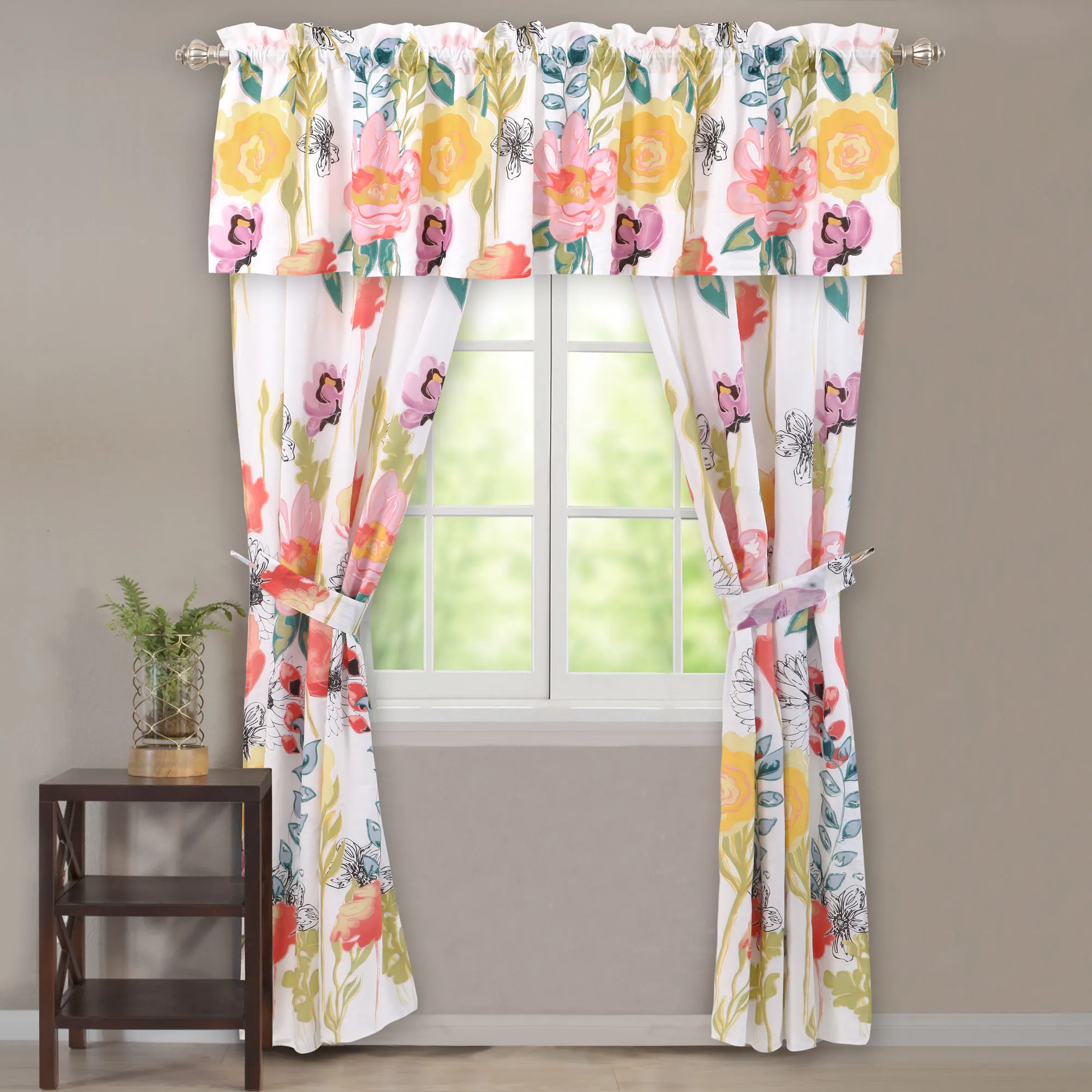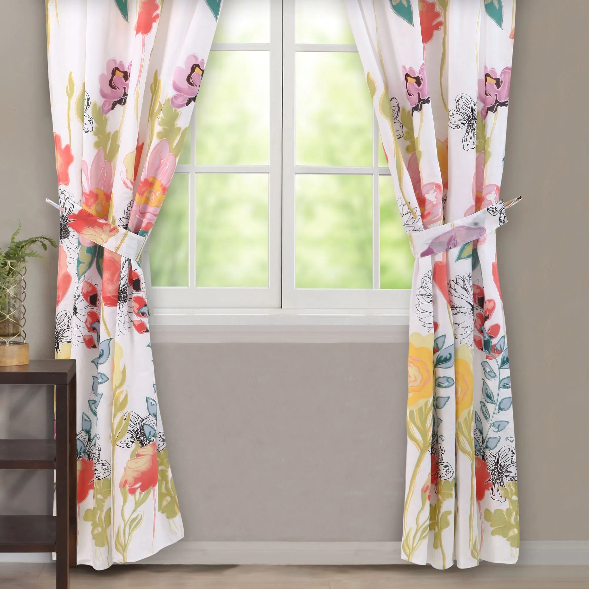 The beautifully vibrant Watercolor Dream Floral Window Treatment features gorgeous watercolor florals in shades of blue, green, pink, purple, orange, yellow, coral, gold, black, and teal with black stenciled accent flowers on a white ground. The lined, polyester window treatment has tailored edges and a 3" rod pocket. Specify Curtain Pair or Valance. Curtains include tiebacks. Machine washable. Imported. The curtain pair width is the total width of two panels together.