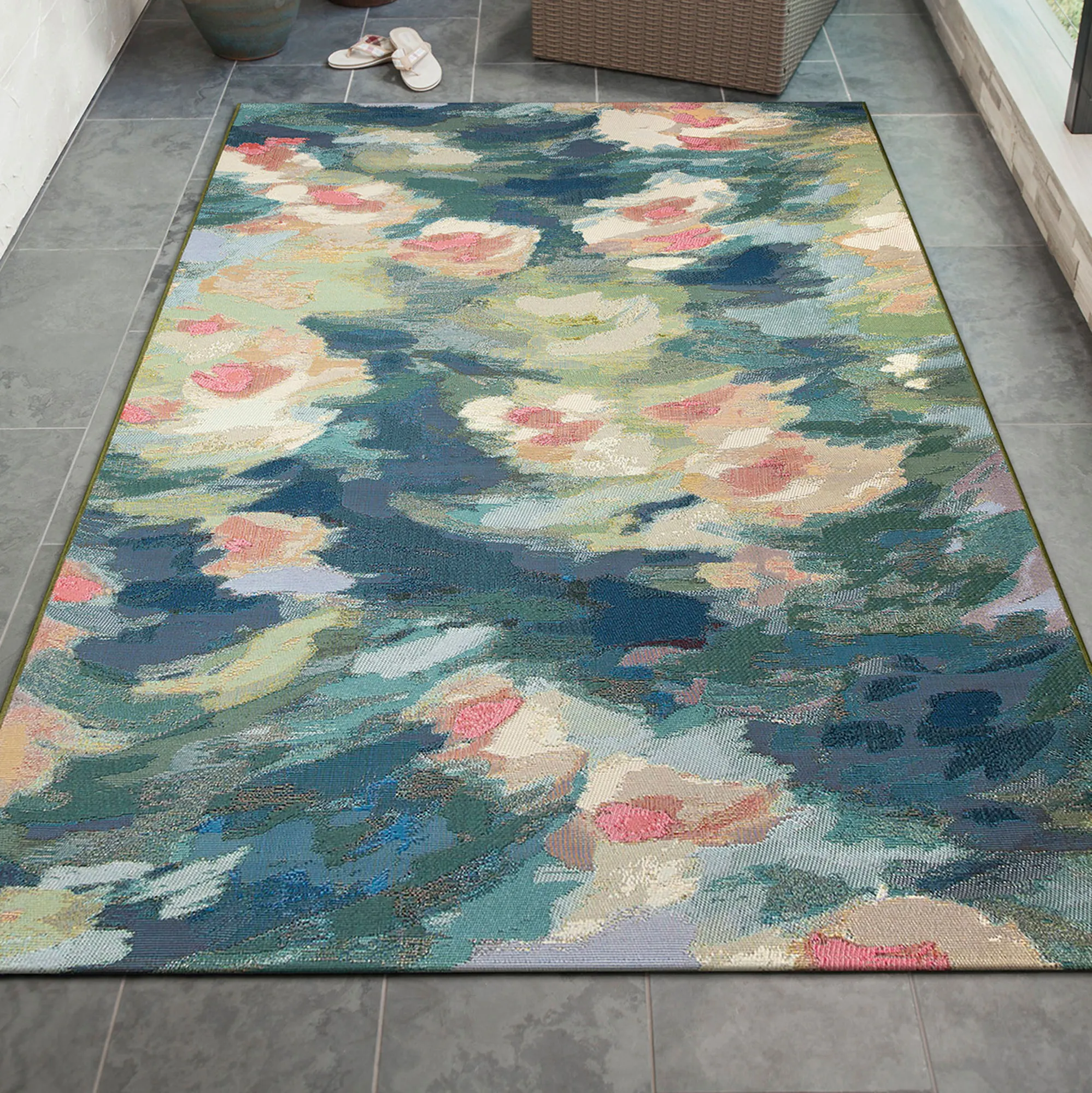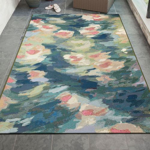 Imagine yourself among the waterlilies of the Watercolor Pond with this artistically inspired rug. Designed by Liora Manne, the abstract style features painterly swatches of UV-stabilized, fade-resistant soft pastel color. Power-loomed from a polypropylene/polyester blend, the .12" thick, flat-woven, low-profile rug offers a weather-resistant, durable design ideal for high-traffic areas. Outdoor seasonal use; do not expose this rug to freezing temperatures. Spot clean and rinse with a garden hose; for stubborn stains, we recommend professional cleaning by a rug cleaner. Imported.