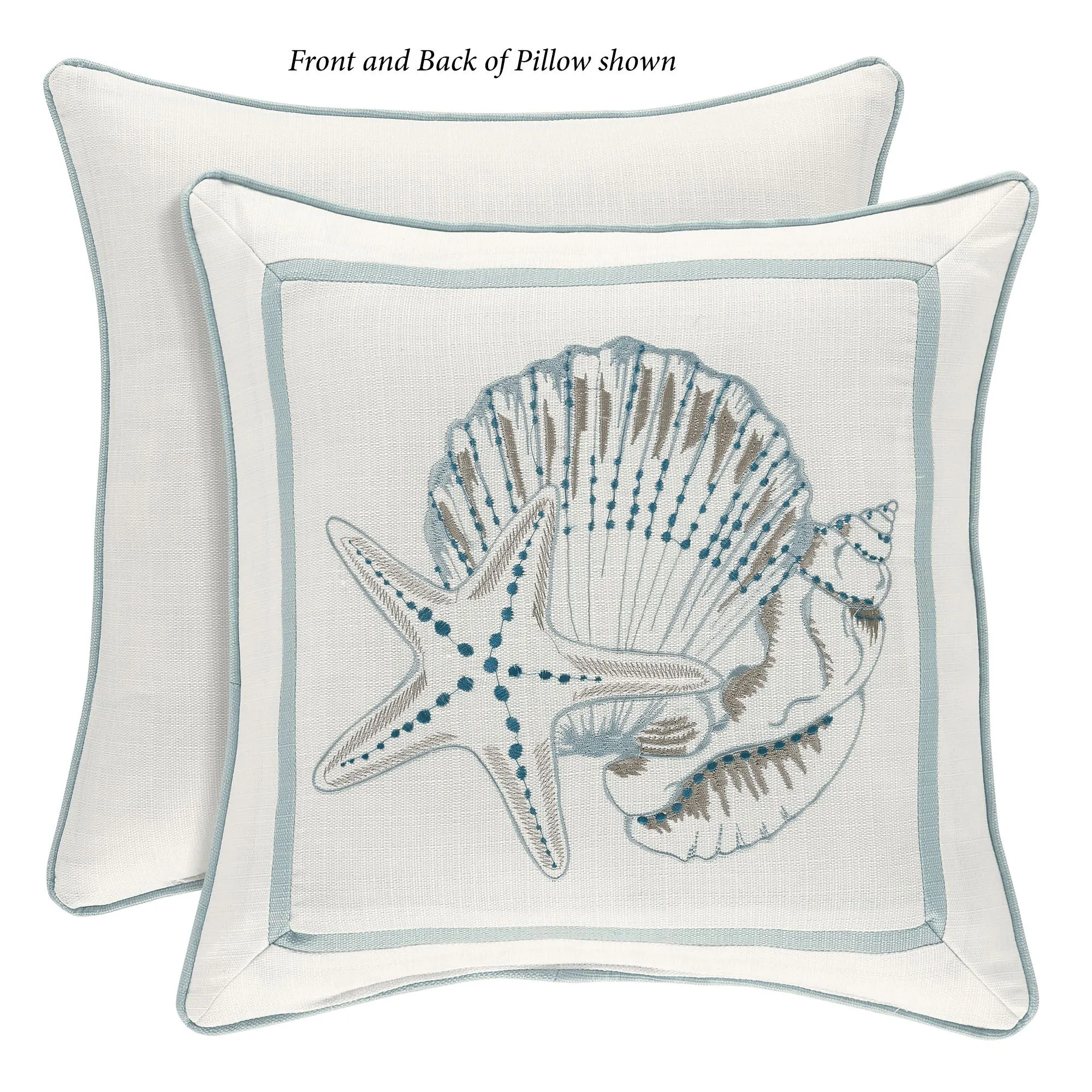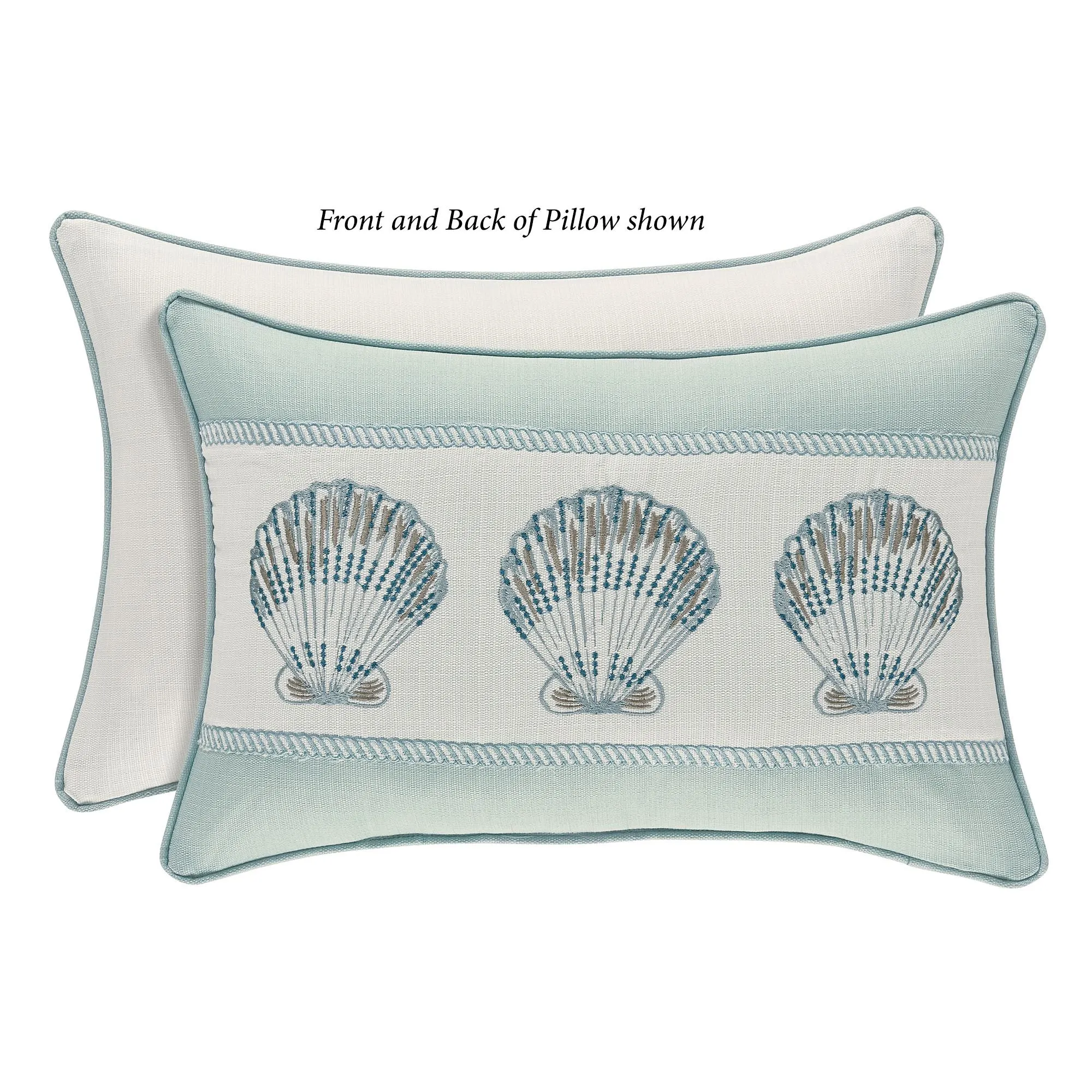 Pillows have center embroidered shells and piped edges. Spot clean. Square is off-white with a pale blue frame and mitred corners. Rectangle has an off-white center, rope-like embroidered accents, and a pale blue top and bottom.