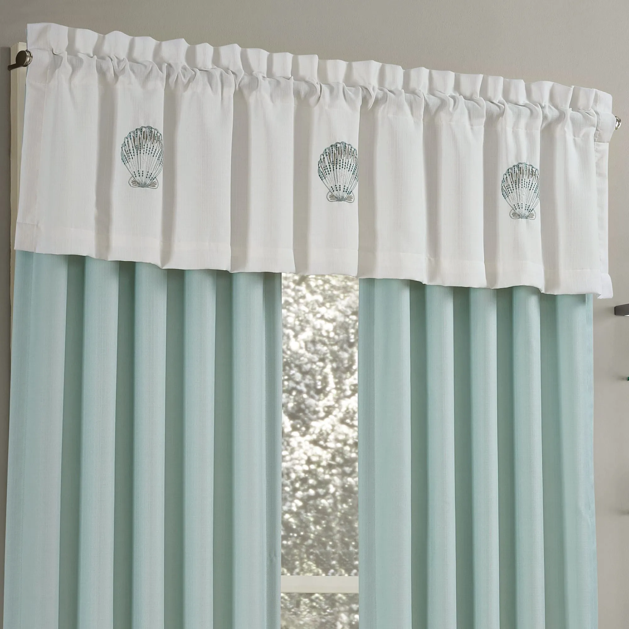 Window Treatments have tailored edges and 3" rod pockets. Lined Curtain Pair is pale blue and includes tiebacks. Valance is off-white embroidered with scallop shells.