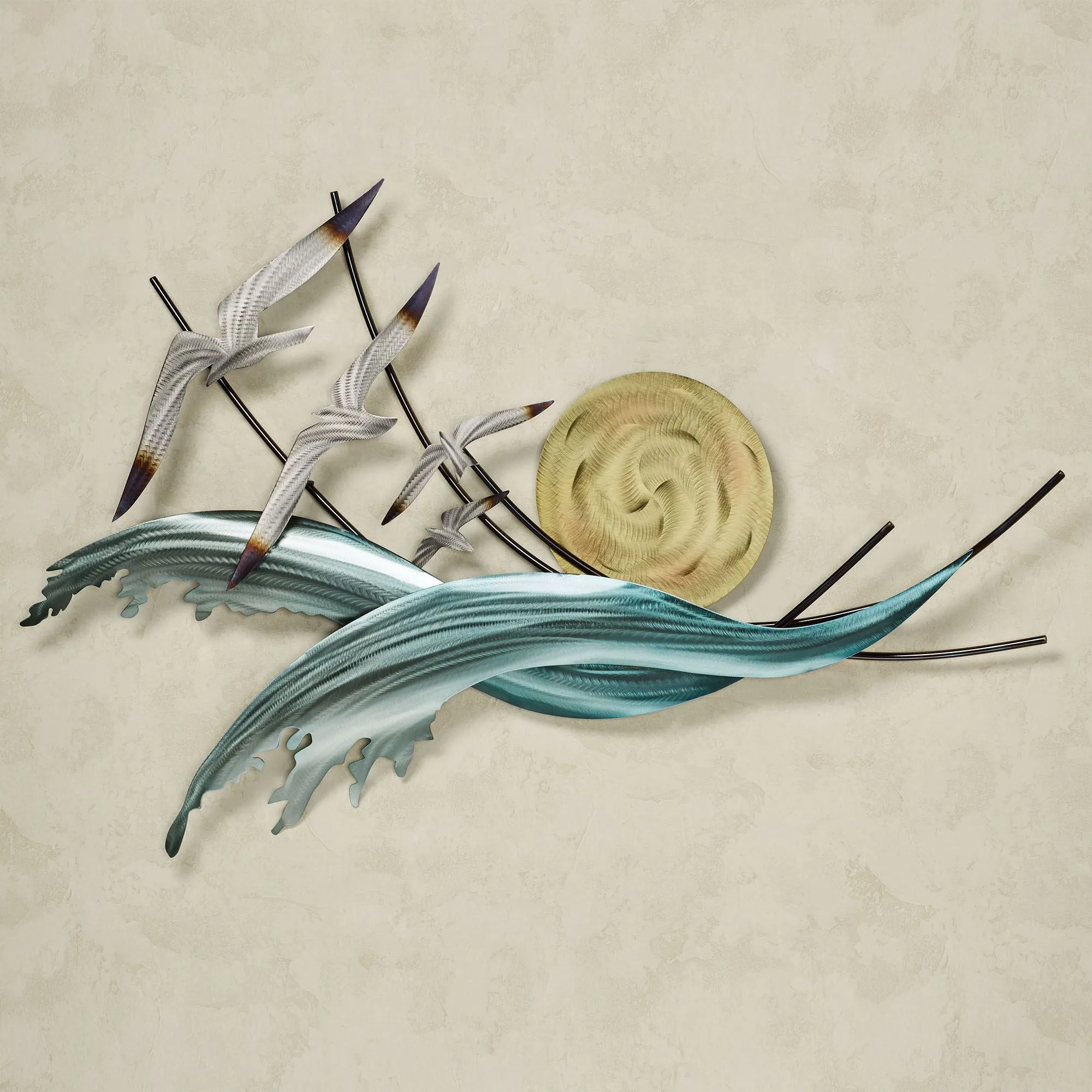 Four Wave Riders fly away from the golden sun and soar above the cool blue ocean currents. Handcrafted of steel and stainless steel, this hand-grinded, hand-flamed, and hand-finished wall sculpture is by artist M. Malizia. Wall art may be used indoors or outdoors under a covered area. Measures 50"Wx3.5"Dx30"H.