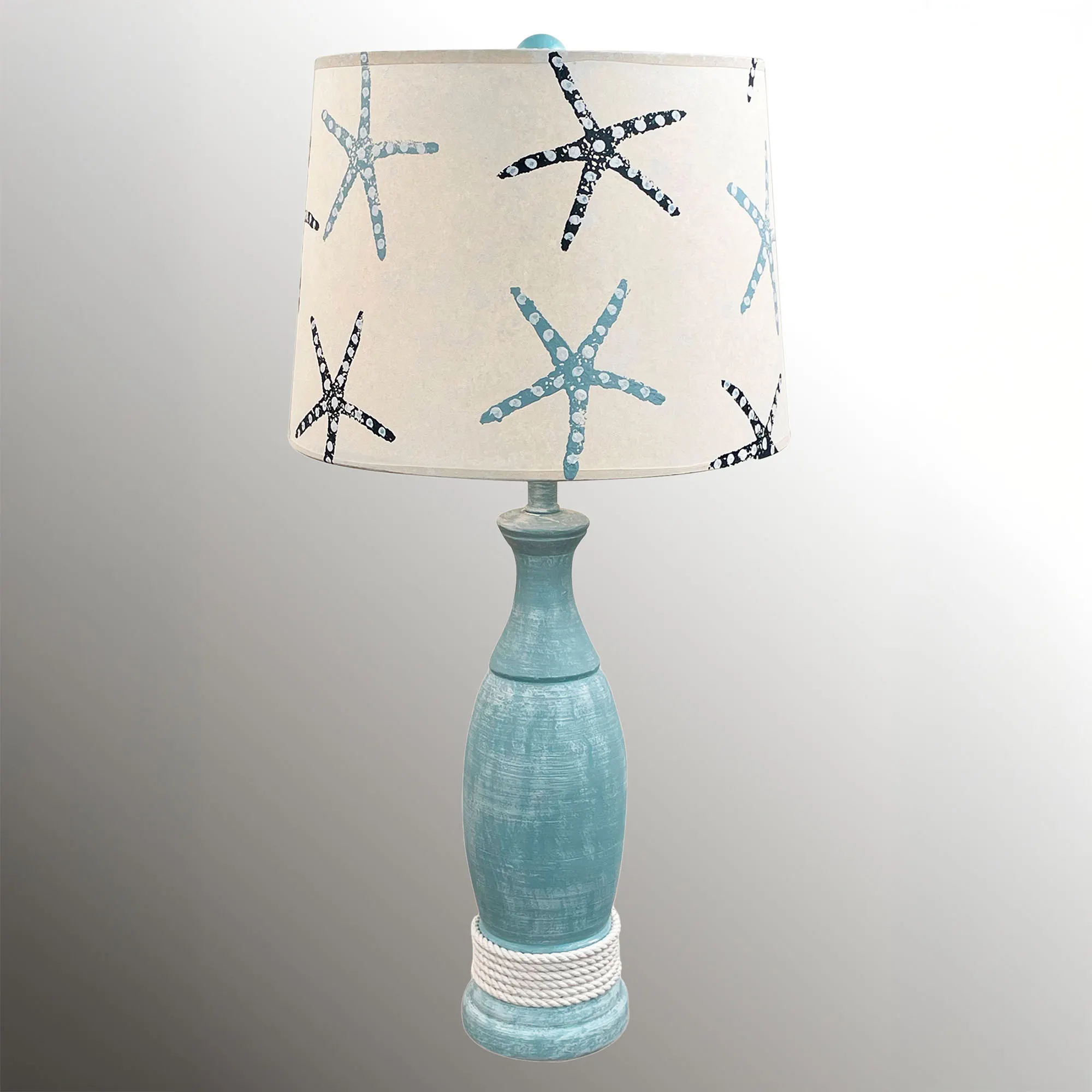 The Weathered Blue Starfish Table Lamp offers a carefree coastal vibe to your space. Handcrafted in the USA with weathered charm, the fibercast lamp features a seaside blue hue and coiled white rope accent. Handpainted light blue and dark blue dotted starfish decorate the ivory drum shade for added beach whimsy. UL listed. Requires one 3-way 100W max. bulb. Overall, the coastal table lamp measures 14"dia.x30.5"H, including the 1.5"H wooden ball finial, and weighs approx. 10 lbs.