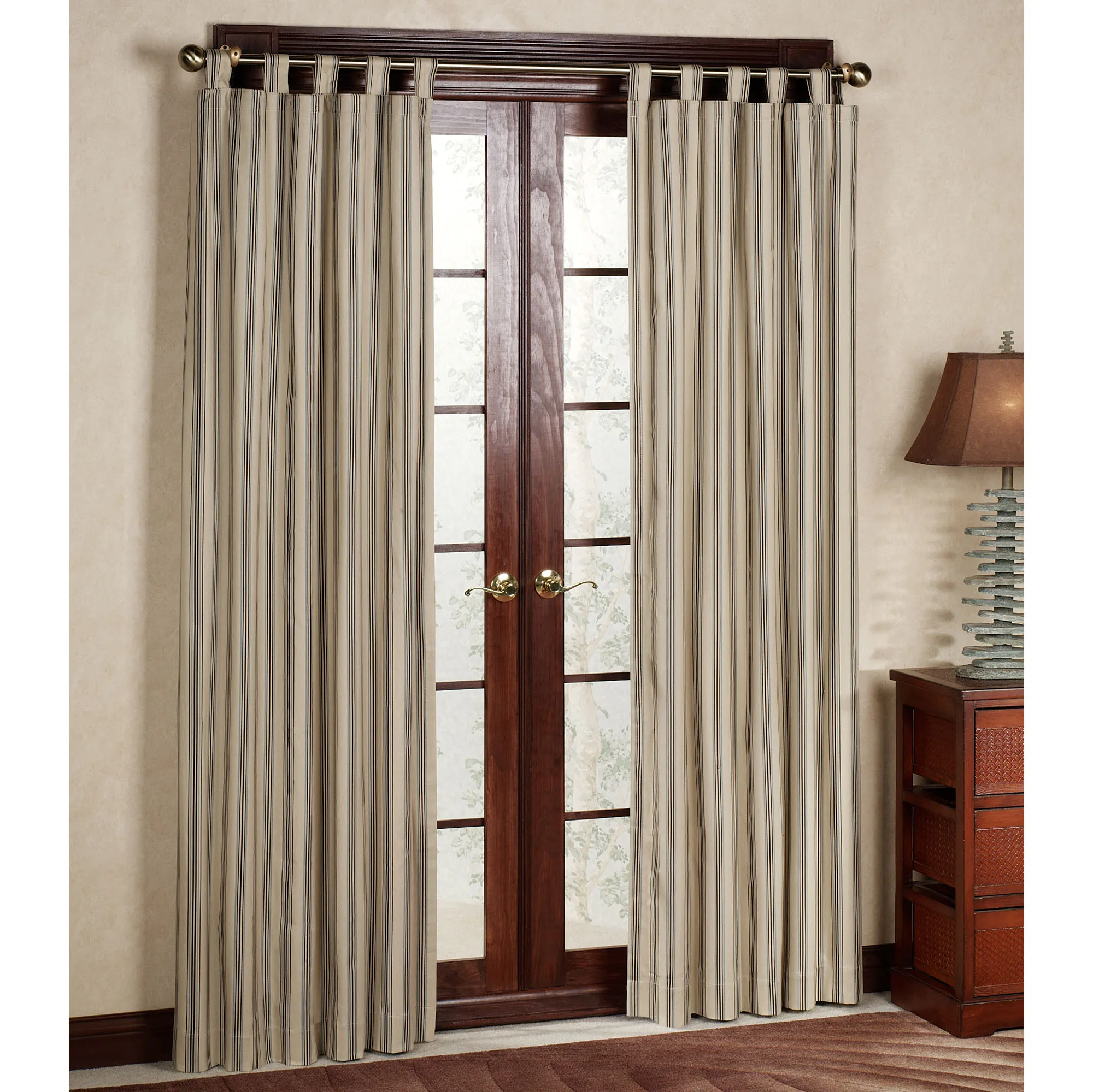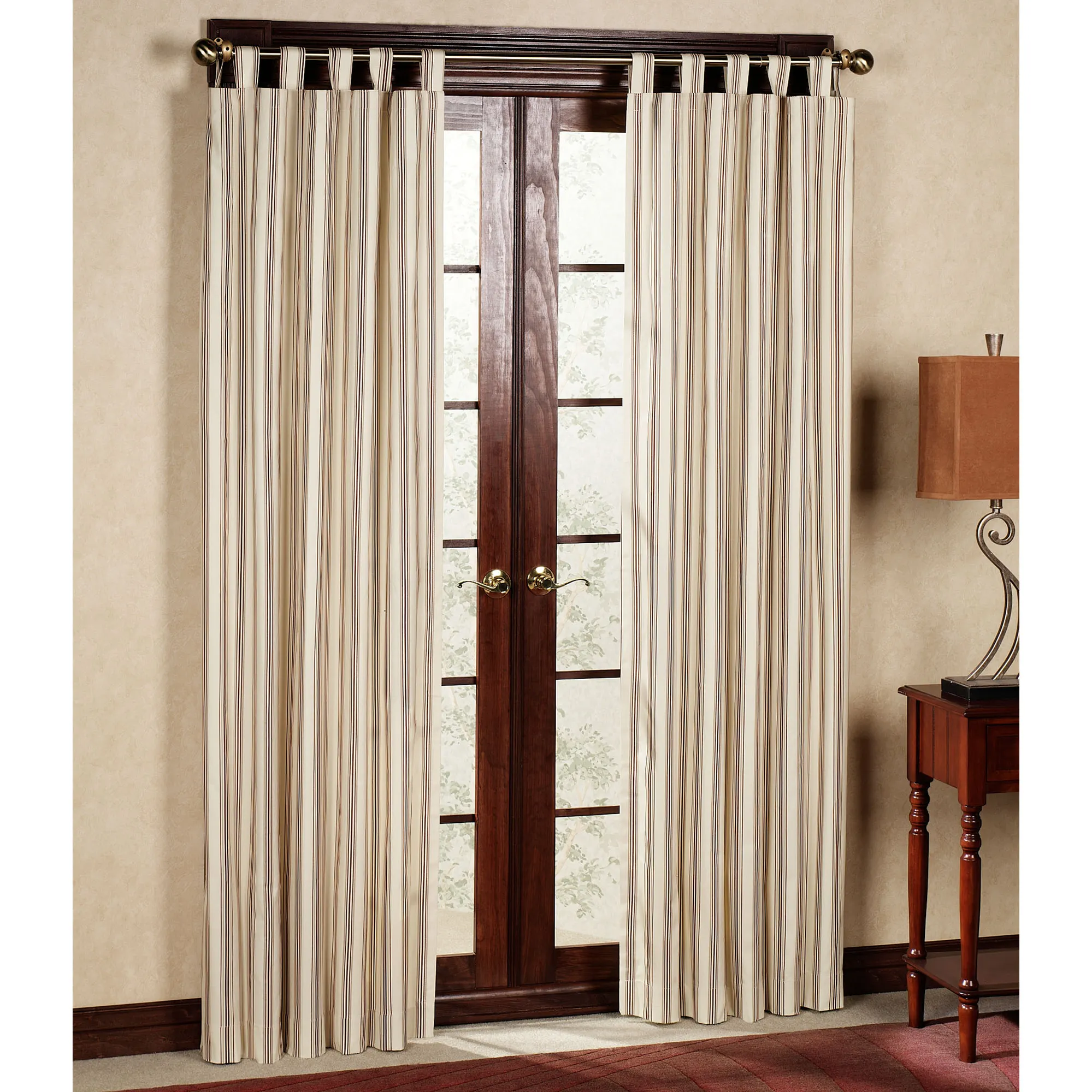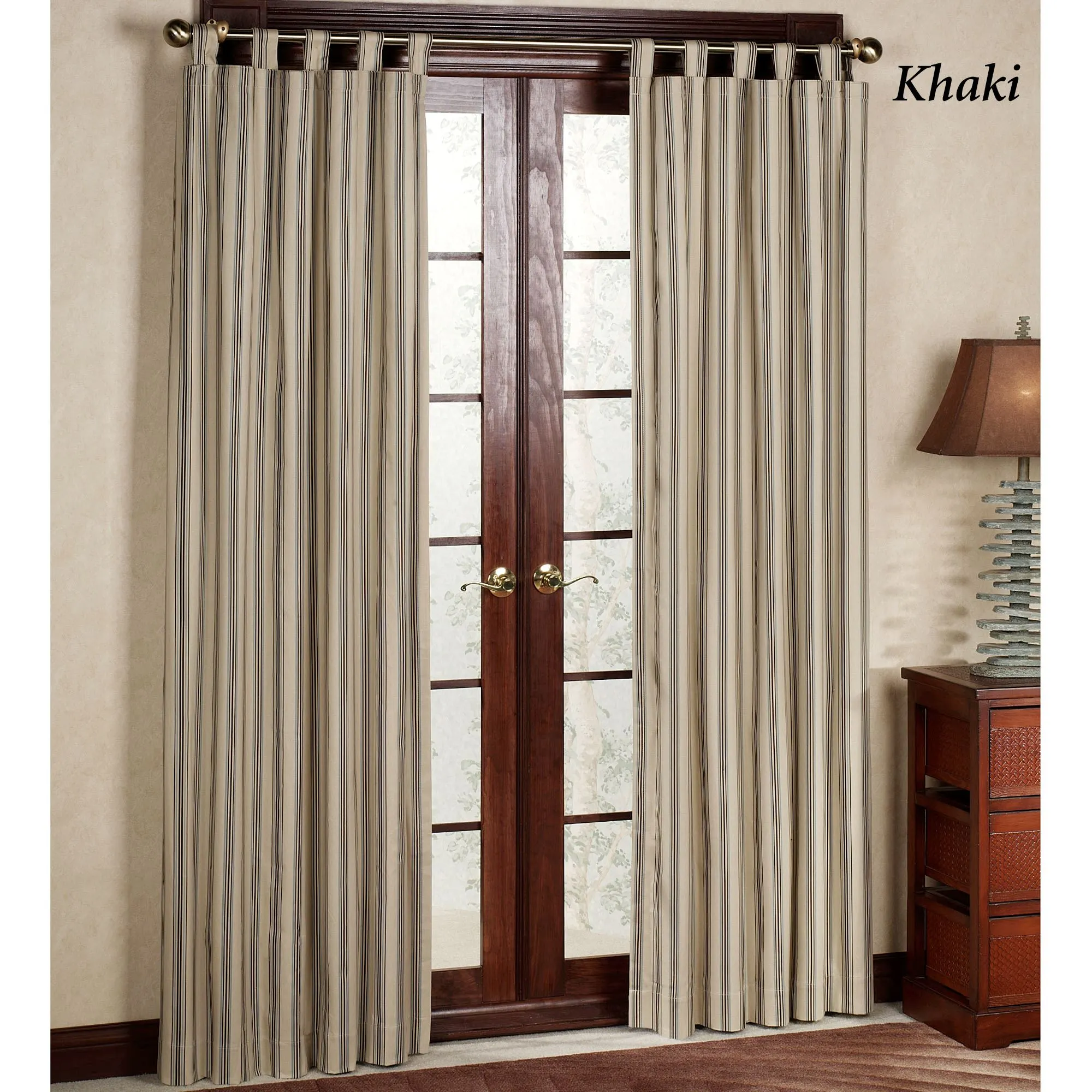 Help block out the sun, heat, or cold and save energy with the cotton duck Weathermate Stripe Tab-Top Curtains. Using Thermalogic(TM) technology, these insulated tab curtains have energy-efficient thermal shade backing made of 100% acrylic suede. Curtains come in a variety of different colorations. Small stripes are paired with a wider stripe in natural or khaki. Room darkening window treatment has 3.5" tabs. Sold as a curtain pair. Washable. Imported. The curtain pair width is the total width of two panels together.