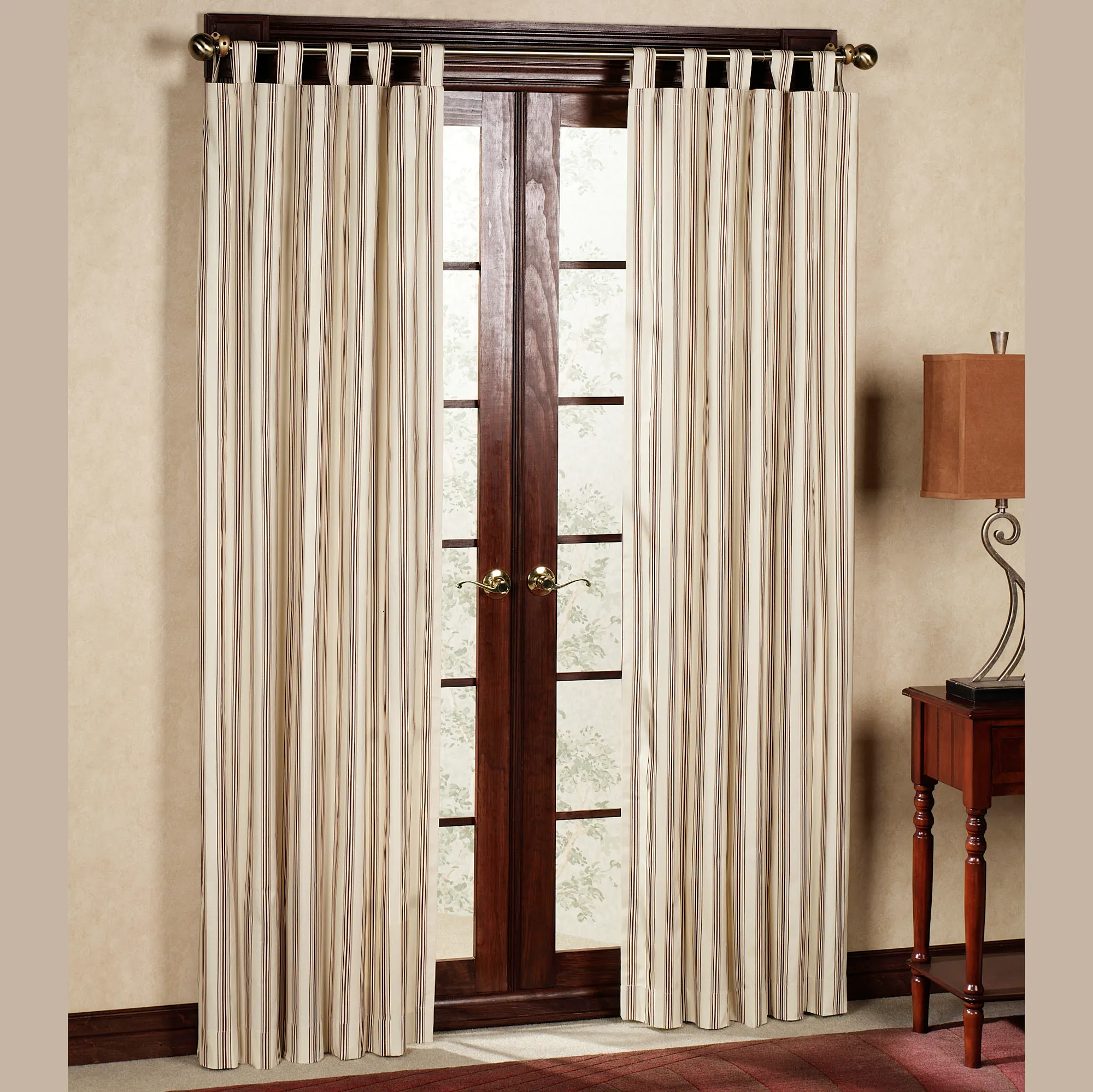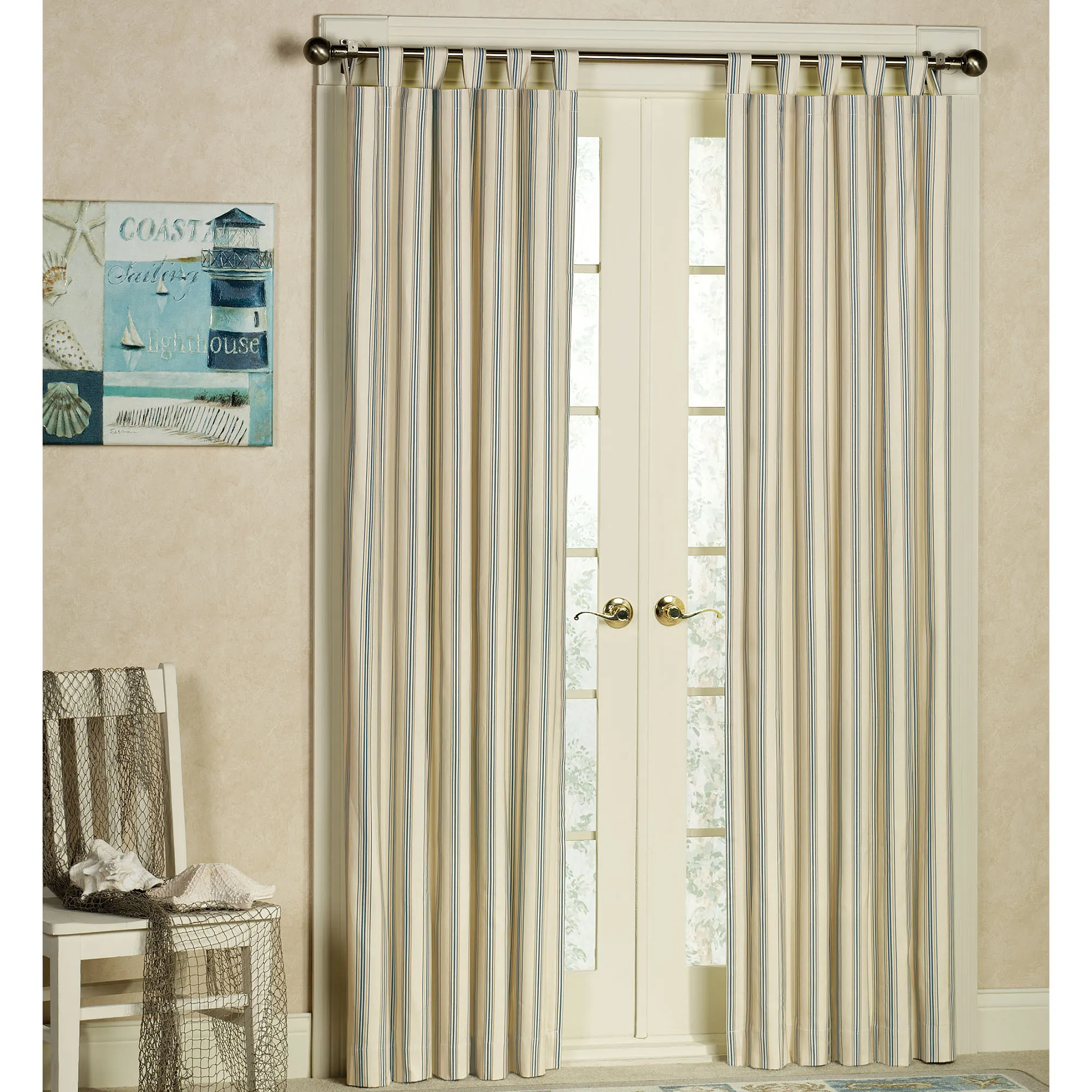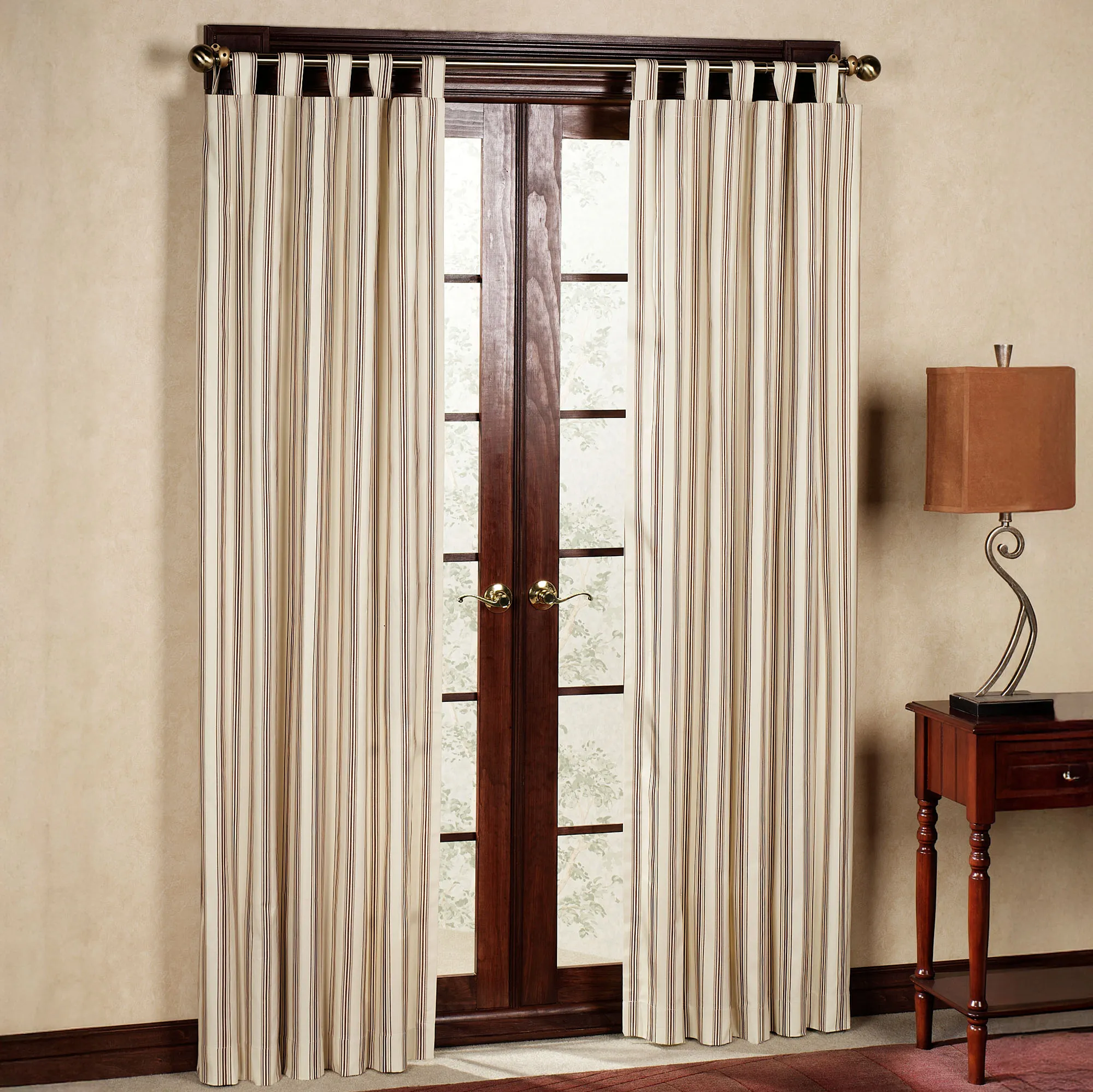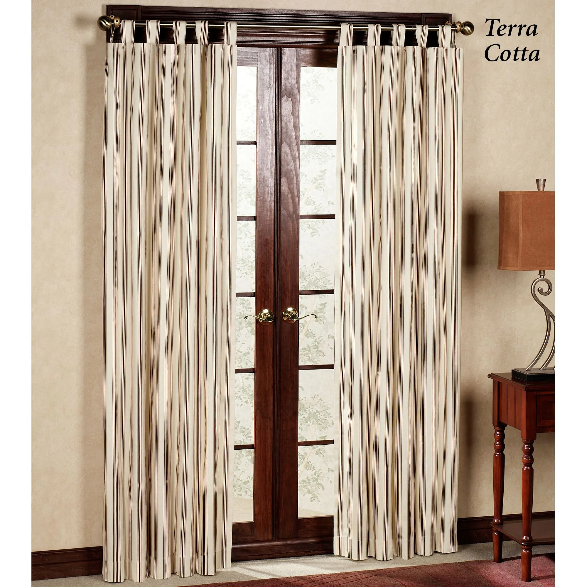 Help block out the sun, heat, or cold and save energy with the cotton duck Weathermate Stripe Tab-Top Curtains. Using Thermalogic(TM) technology, these insulated tab curtains have energy-efficient thermal shade backing made of 100% acrylic suede. Curtains come in a variety of different colorations. Small stripes are paired with a wider stripe in natural or khaki. Room darkening window treatment has 3.5" tabs. Sold as a curtain pair. Washable. Imported. The curtain pair width is the total width of two panels together.