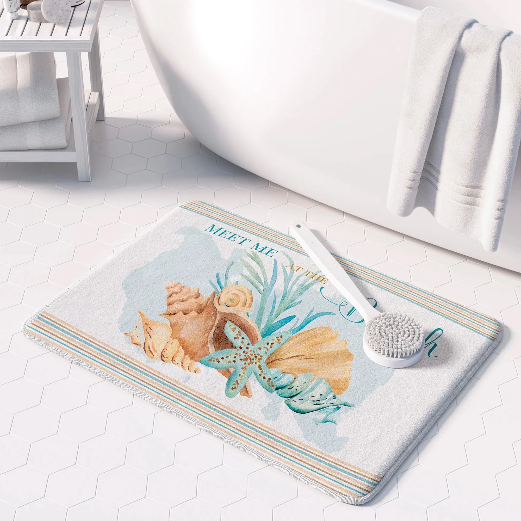 Transform your bath space into a Weekend Getaway with this charming coastal bath rug. Presented by Laural Home(R) with artwork by Deane Beasley, the ultra-soft polyester bath mat features a cluster of a starfish, scallop shell, conch, and seaweed beneath the phrase "Meet Me At The Beach." Watercolor-like printed shades of blue, aqua, beige, and tan pattern the white ground, while stripes decorate the top and bottom. With a memory foam core and nonskid backing, the bath rug measures 34"x21". Machine washable. USA/Imported.