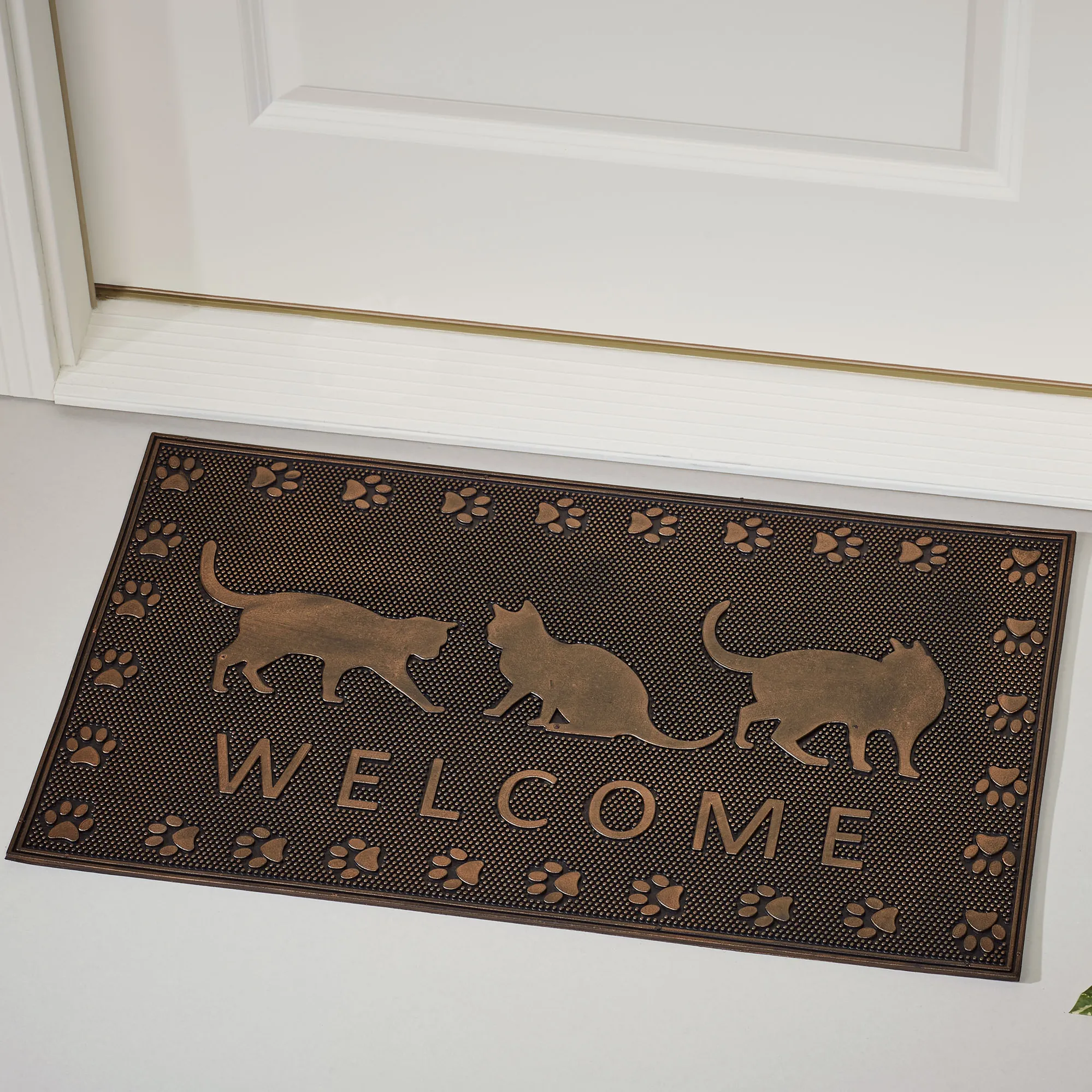 Welcome Cats and people too with this charming doormat. The all-weather rubber mat features copper painted cats and the word "Welcome" framed with paw prints on a textured black background. The cat doormat, .25" thick, is mildew-resistant and has an anti-slip backing. Measures 30"x18". Outdoor year-round use. Hose off with water to clean. Imported.