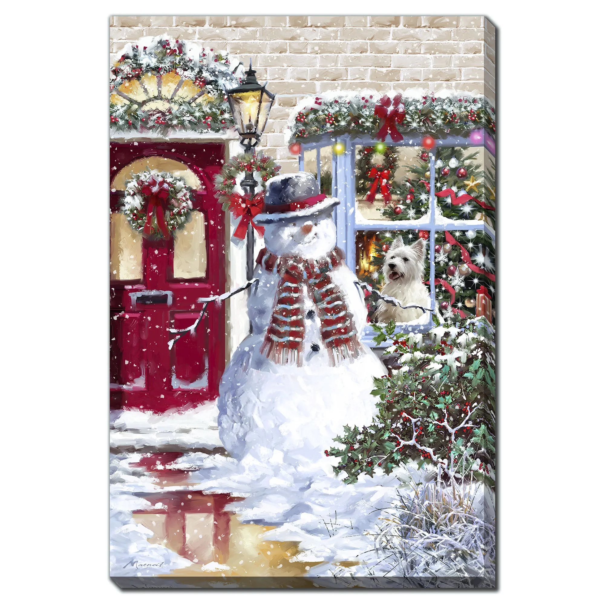 The best of friends, this Westie and Snowman watch the winter days go by outside their festive house. Originally from artwork by (C)The Macneil Studio, the canvas wall art features a snowman outside a beautifully decorated brick home with a red door, wreaths, garland, lamppost, and holly. A Westie pup and lovely Christmas tree can be glimpsed through the window. Gallery-wrapped over a wooden frame, the canvas wall art is embellished with handpainted gel accents. Measures 24"Wx1.5"Dx36"H.