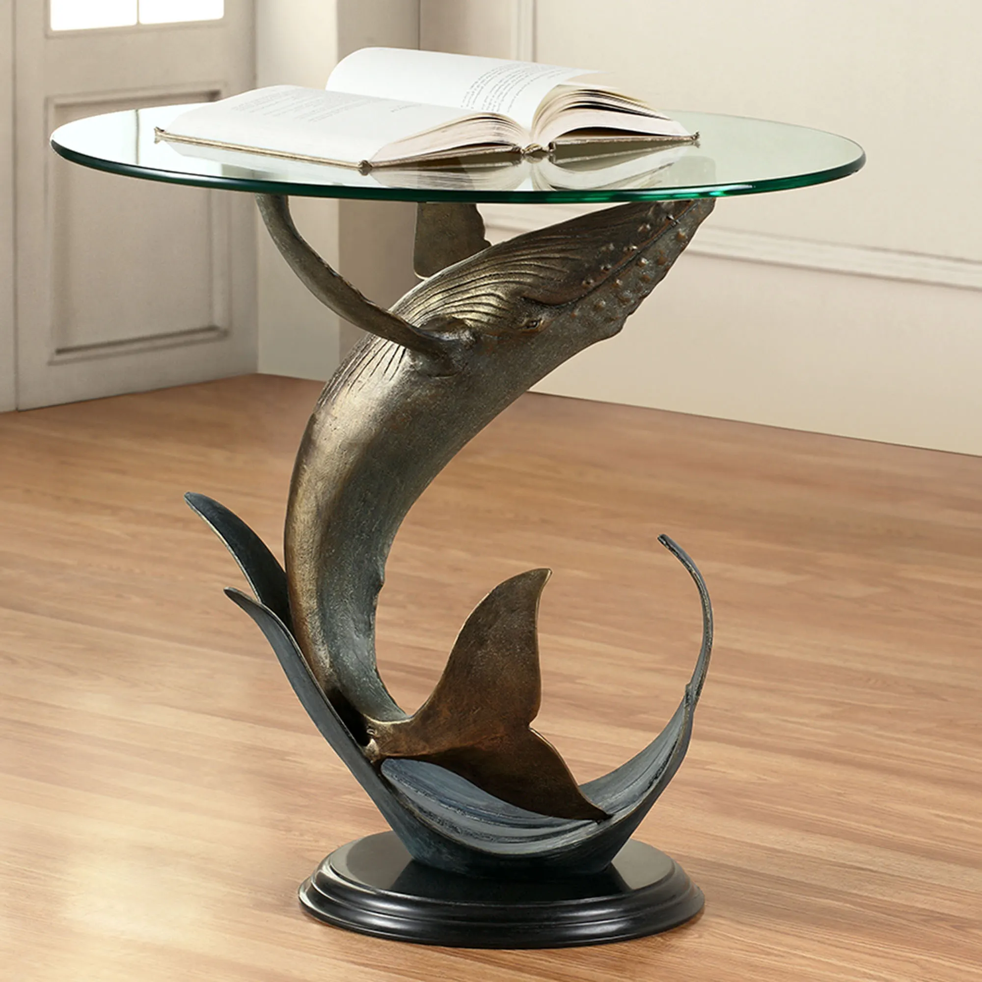 The unique Whale Art Accent Table will make for an interesting conversation piece. The hand-cast aluminum table features a whale swimming upwards with a hand-rubbed antique gold finish, waves with a dark verdi finish, a clear glass top, and a black marble base. Measures 24"dia.x23"H; weighs 36 lbs.
