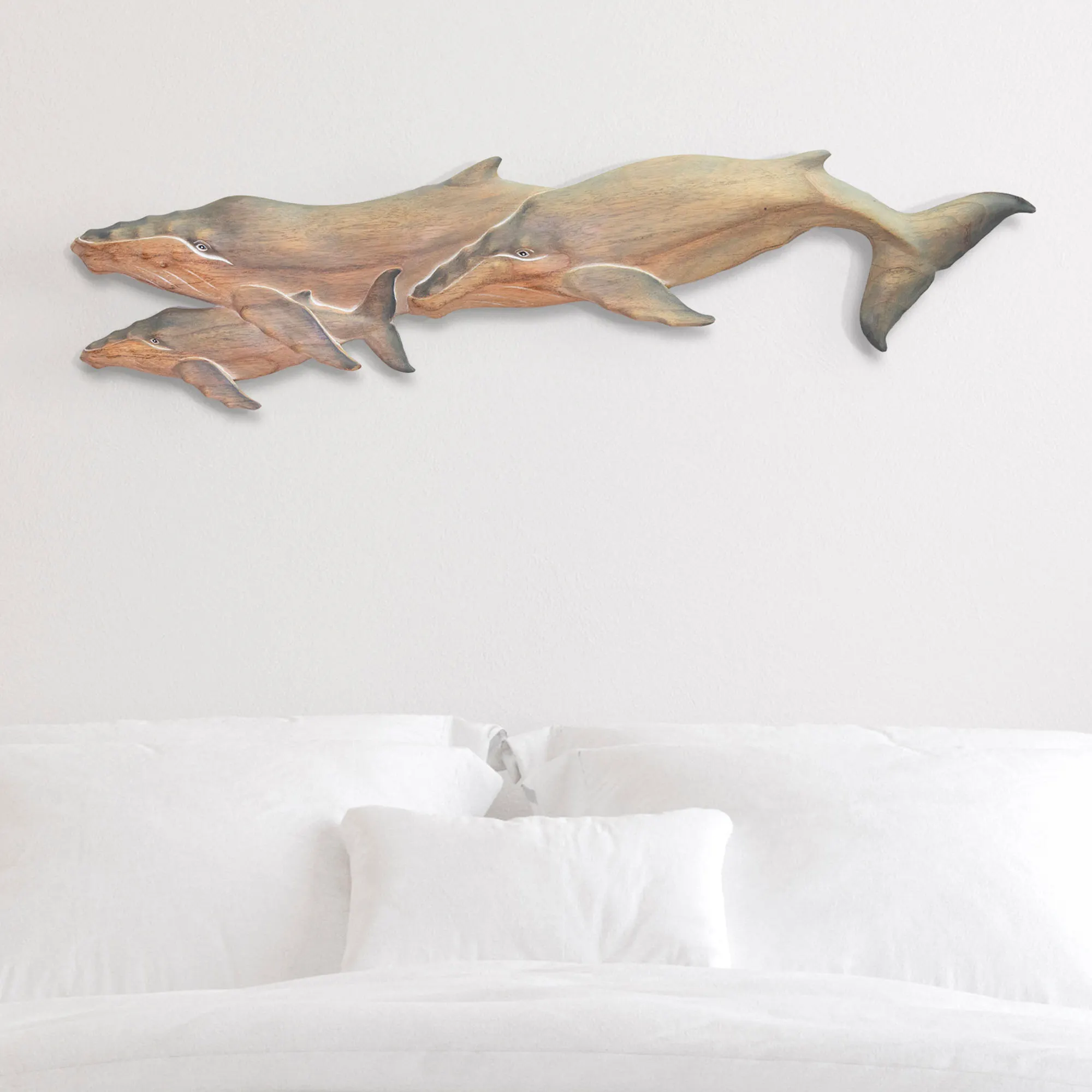 Whale Family Indoor Outdoor Handcarved Wood Wall Sculpture