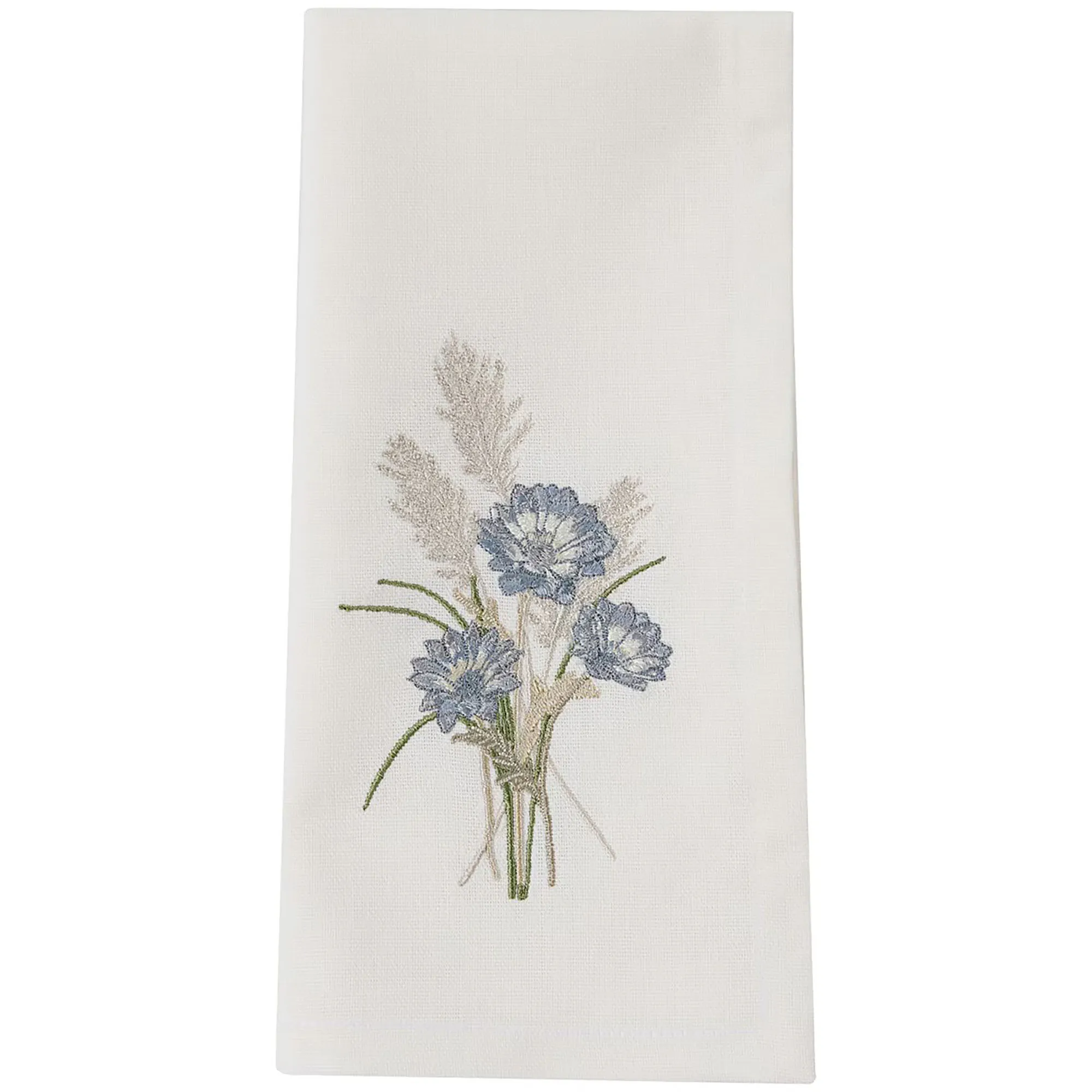 Delicate floral designs elegantly grace the Whispering Grove Table Linens. These cotton table accessories have cornflower blue flower designs, green leaves, and sage leaf silhouettes on a natural background. The napkins have embroidery. The Table Runner is available in two sizes. Placemats are each 19"x13" and sold in a set of four. Napkins are each 18" sq. and sold in a set of four. Machine washable. Imported.