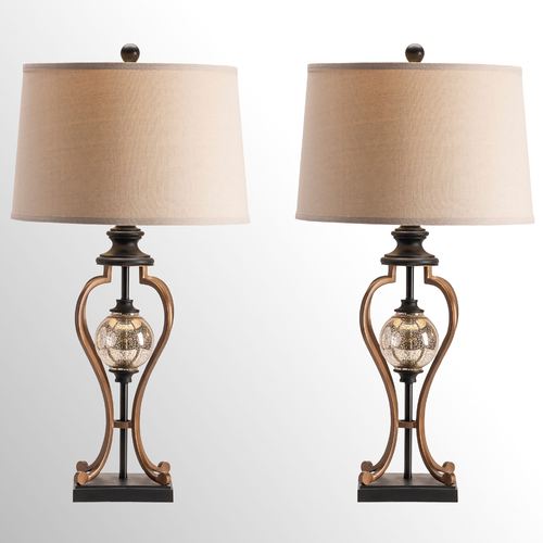 Traditional style graces the Whitby Table Lamp Pair in an elegant allure. With a stepped square base, each openwork metal font rises with four gold curved legs in a stylish shape with a center mercury glass accent orb. A natural linen tapered drum shade and 2" dia. bronze orb finial top each lamp with an understated touch. UL listed. Each lamp requires one 150W max. bulb and measures 18.5"dia.x36.5"H. Set weighs approx. 18 lbs.