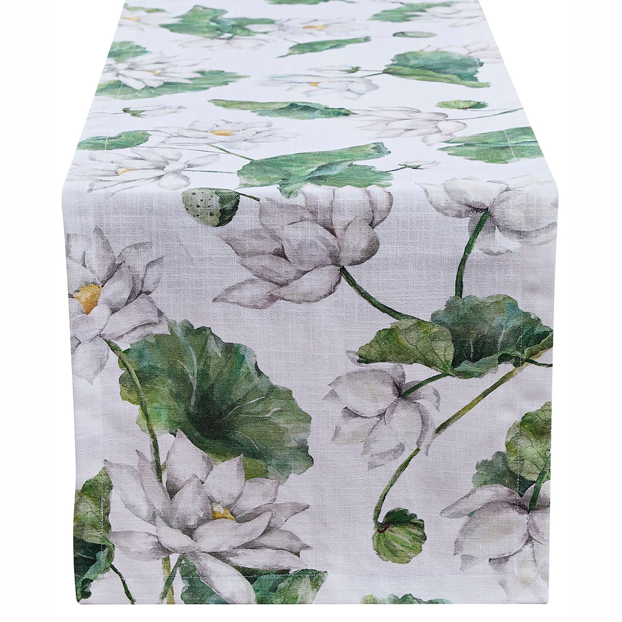Entertain your guests among the natural vibrancy of the White Lotus Table Linens. Crafted from cotton, each crisp white table accent features white lotus flower blossoms and green lilypad-like leaves on long green stems. Some flowers bloom to showcase their bright yellow centers. Tailored edges finish all elements. Specify Table Runner, Placemat Set of 4, or Napkin Set of 4. Placemats are 19"x13" each. Napkins are 20" sq. each. Machine washable. Imported.