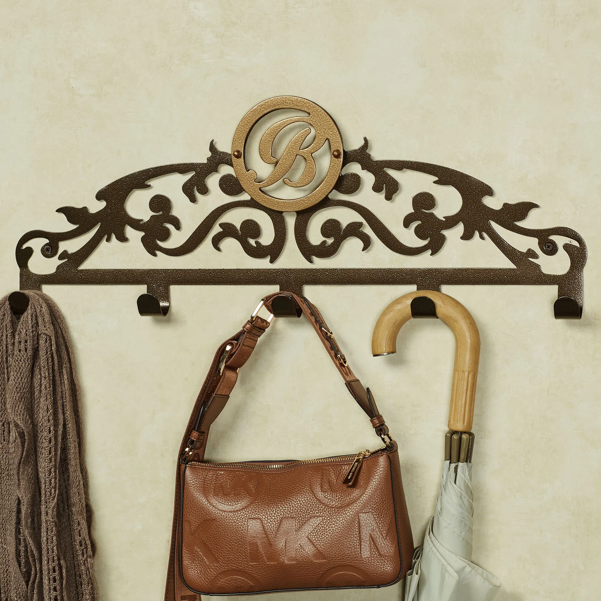 The Wilburn Monogram Five-Hook Wall Rack, designed by JasonW Studios(R), personalizes your daily routine. Proudly handcrafted in the USA by American craftsmen, the precision-cut, 14-gauge steel design features lovely traditional scrollwork and a bronze powder-coat finish. Personalize the wall rack with your initial in a gold round medallion design. Measures 25"Wx1.5"Dx8"H. (C)2023 Touch of Class(R).