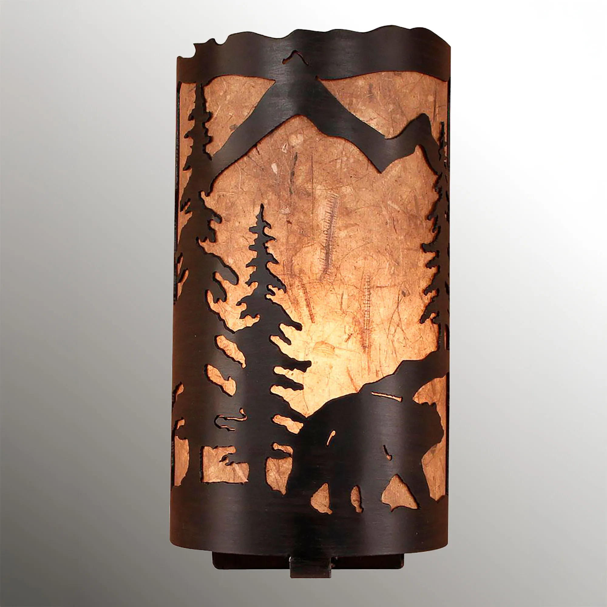 Enjoy the rustic Wilderness scene depicted on this nature-inspired wall sconce. Handcrafted of metal, this wall sconce has a dark brown silhouette design along with a brown parchment backing that allows light to softly shine through. UL listed. Requires one 60W max. bulb. The wall sconce has a two-way in-line switch. Measures approx. 7.5"Wx6"Dx13"H.