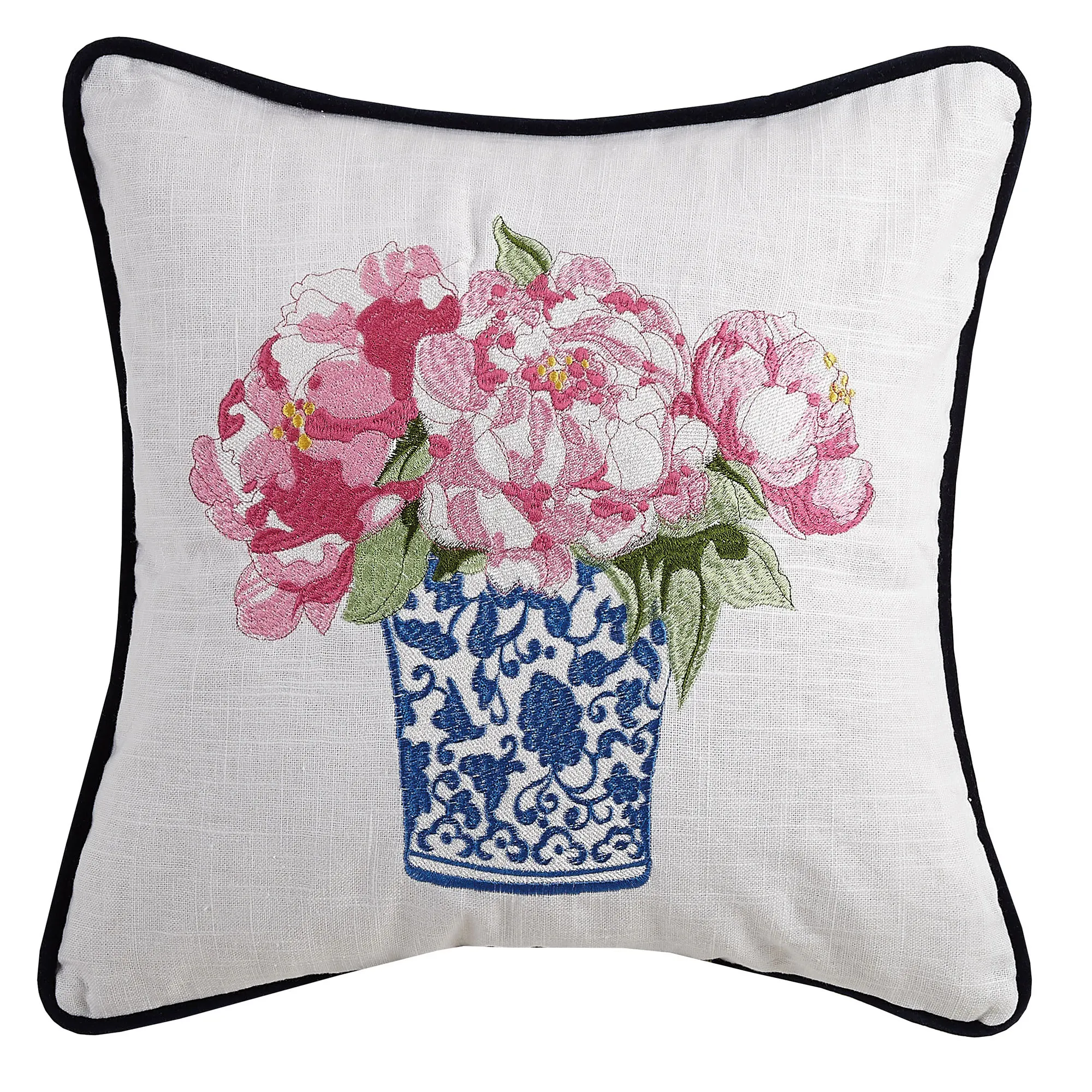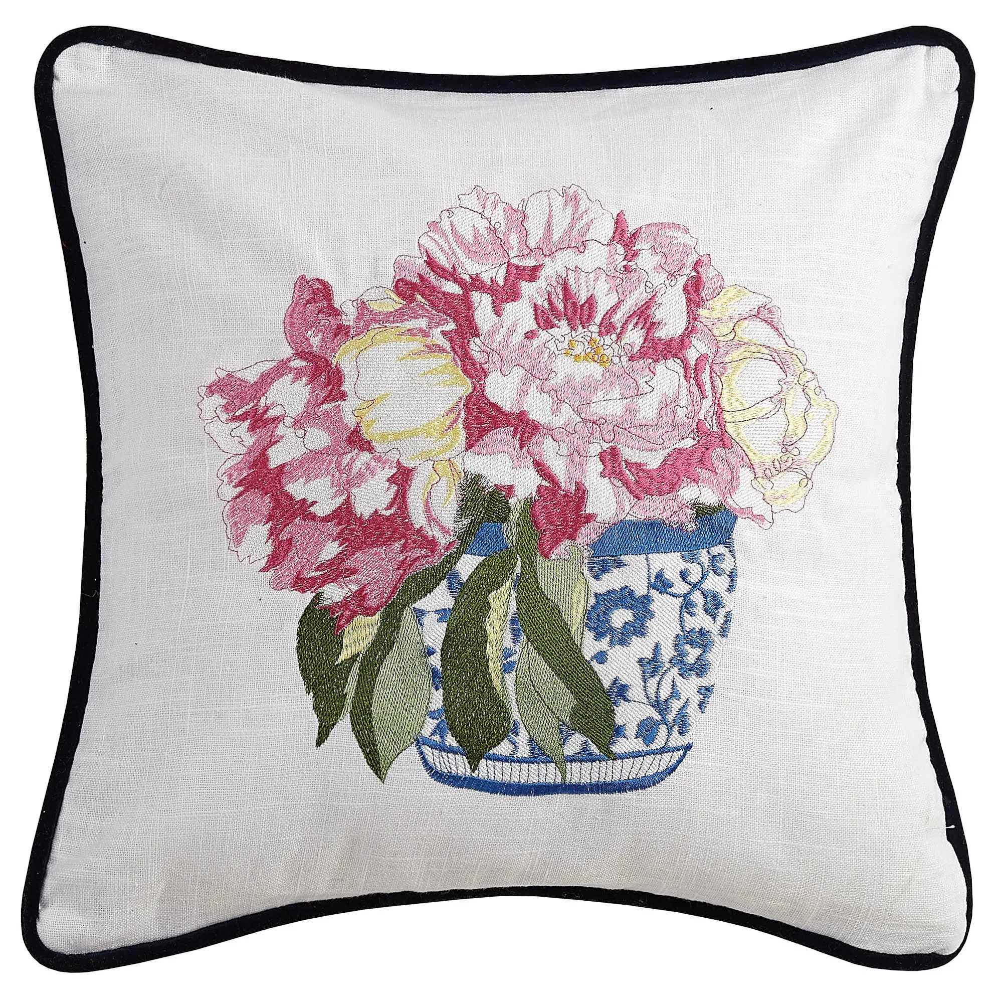 The Square Pillows have embroidery on a slubbed white background, polyester fill, and piped edges. Spot clean. The Tall Vase Square has floral bouquets in shades of pink and white in a tall blue and white vase. The Short Vase Square has floral bouquets in pink, white, and golden yellow in a short blue and white vase.