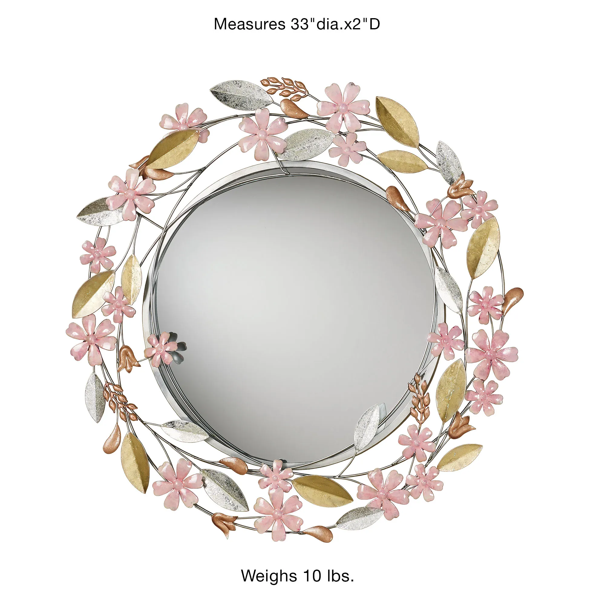 Wildflower Reflections transport you to the beautiful meadow of your dreams. Hand-dyed in lovely hues, flowering silver metal vines surround the 21" dia. glass mirror with pastel pink, blush, and satin gold shades with silver foil accents. Overall, the floral wall mirror measures 33"dia.x2"D and weighs 10 lbs.