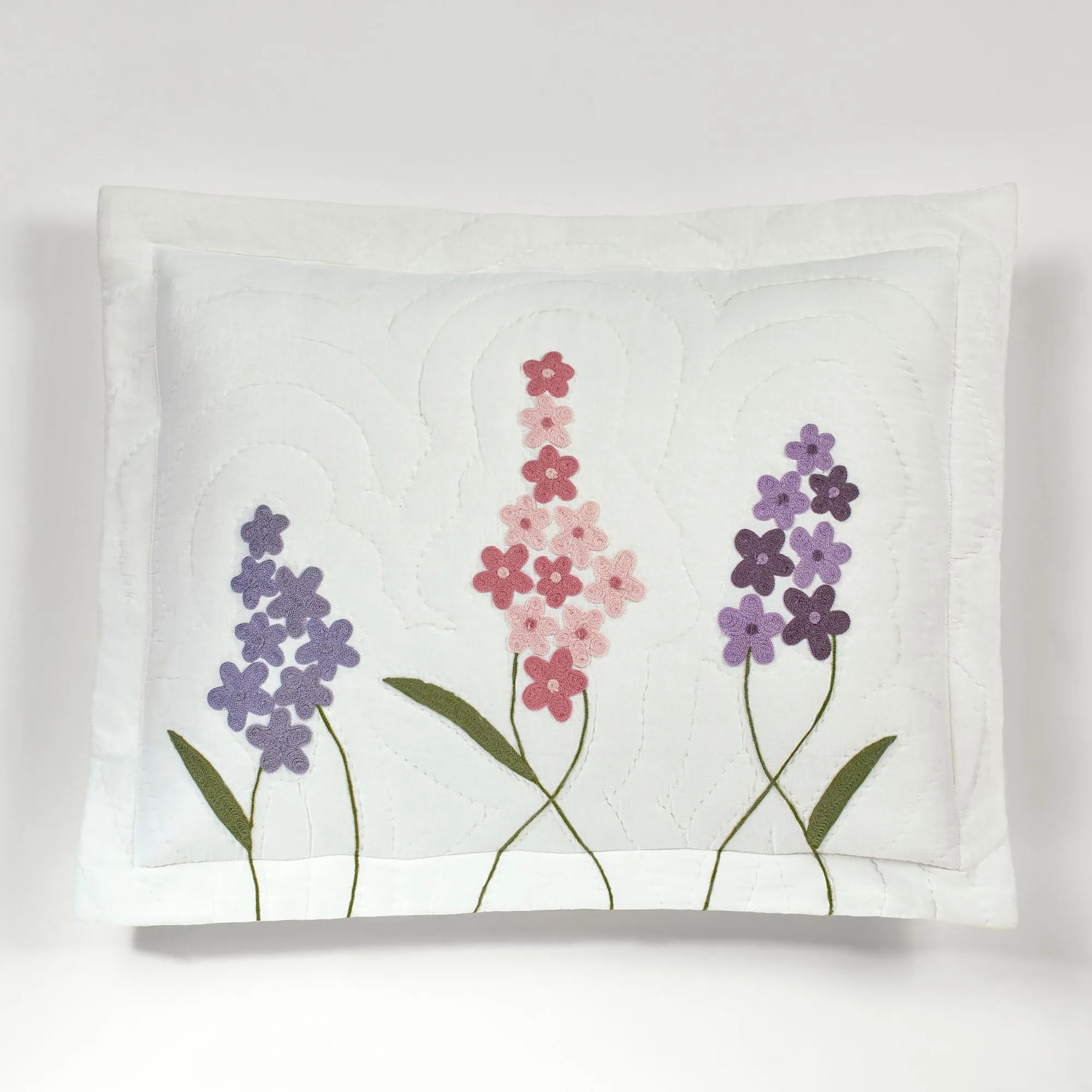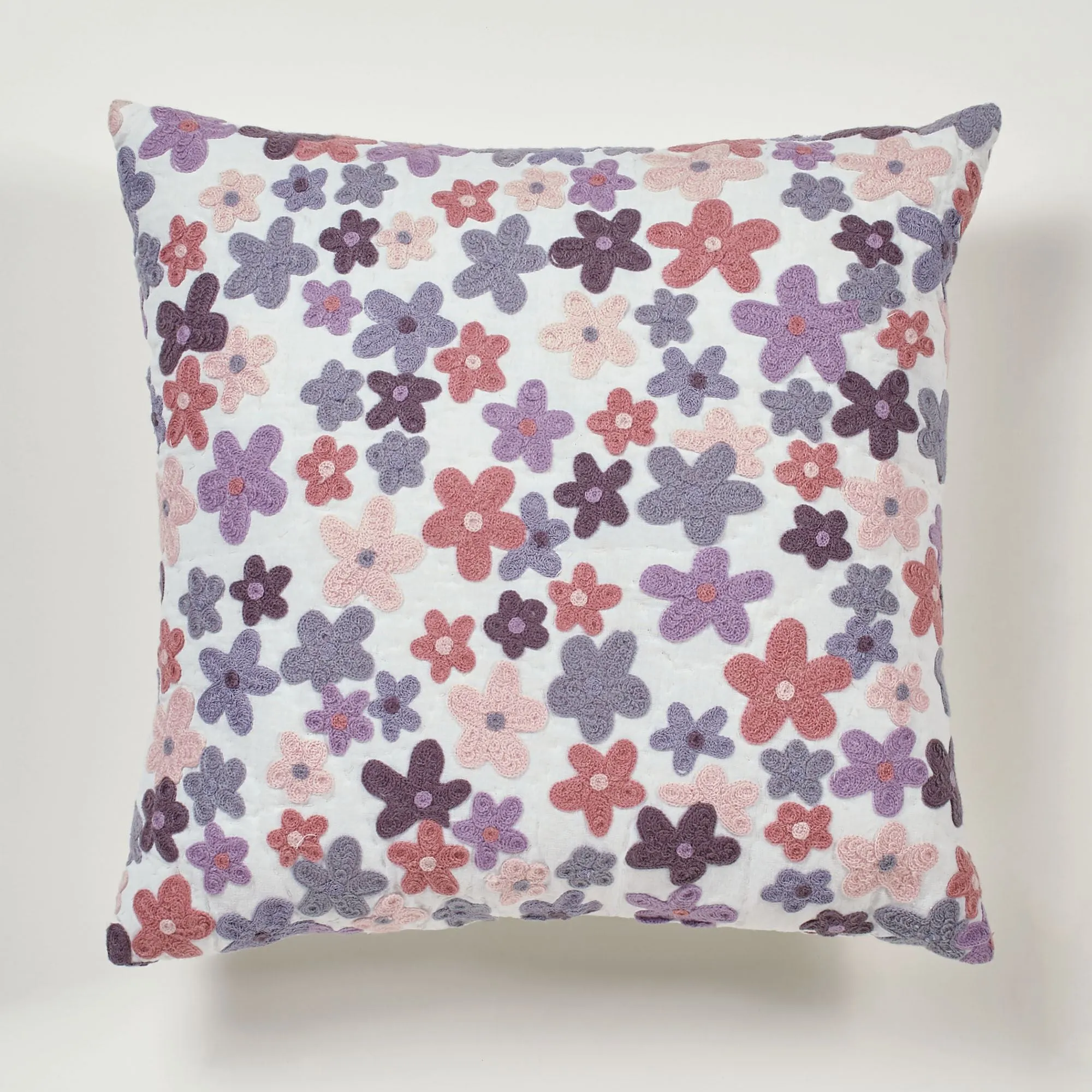 Flourishing with sweet Wildflowers, this blossoming bedding ensemble showcases a lovely spectacle of beautiful flowers. This pre-washed cotton ensemble has floral chainstitch embroidery in delicate shades of pink, rose pink, wisteria, amethyst, plum, periwinkle, and green.