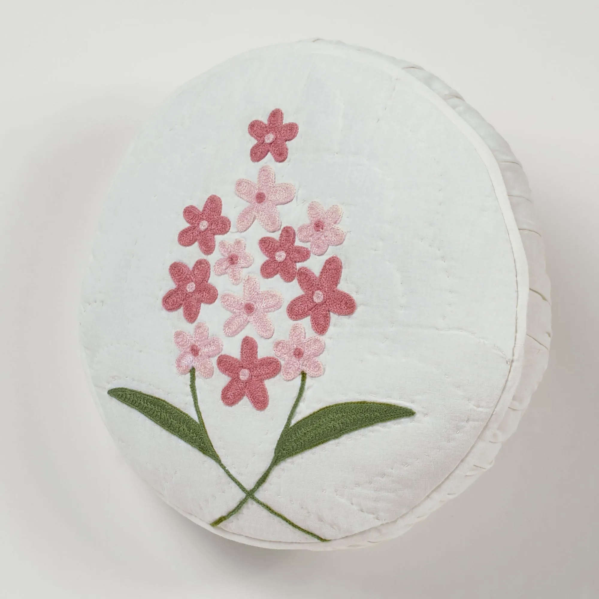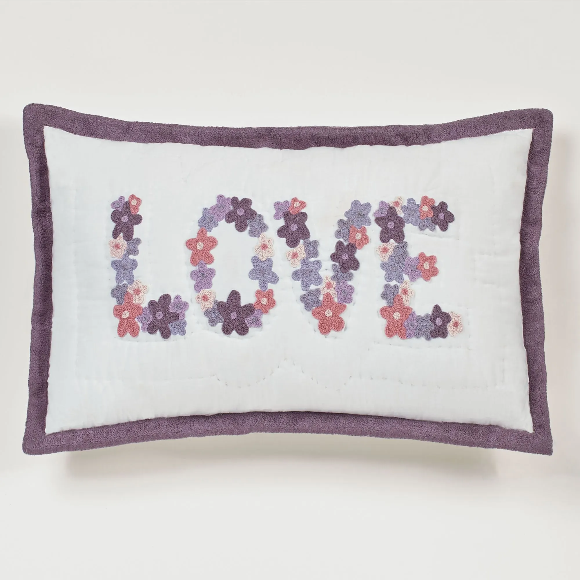 Pillows have floral chainstitch embroidery on ivory. Spot clean. Square is tailored. Rectangle has an embroidered flange and spells out "LOVE." Round has a 2" side gusset.