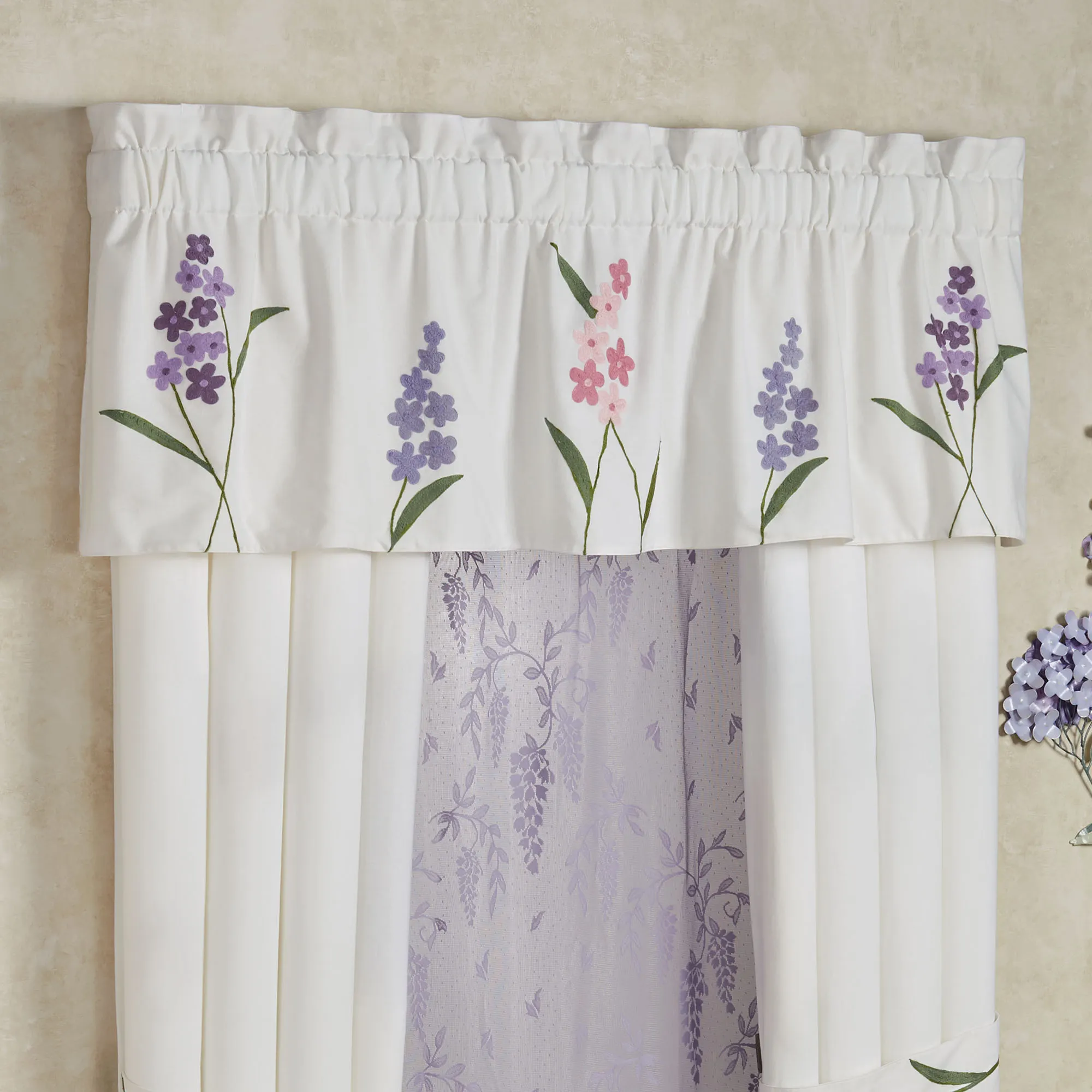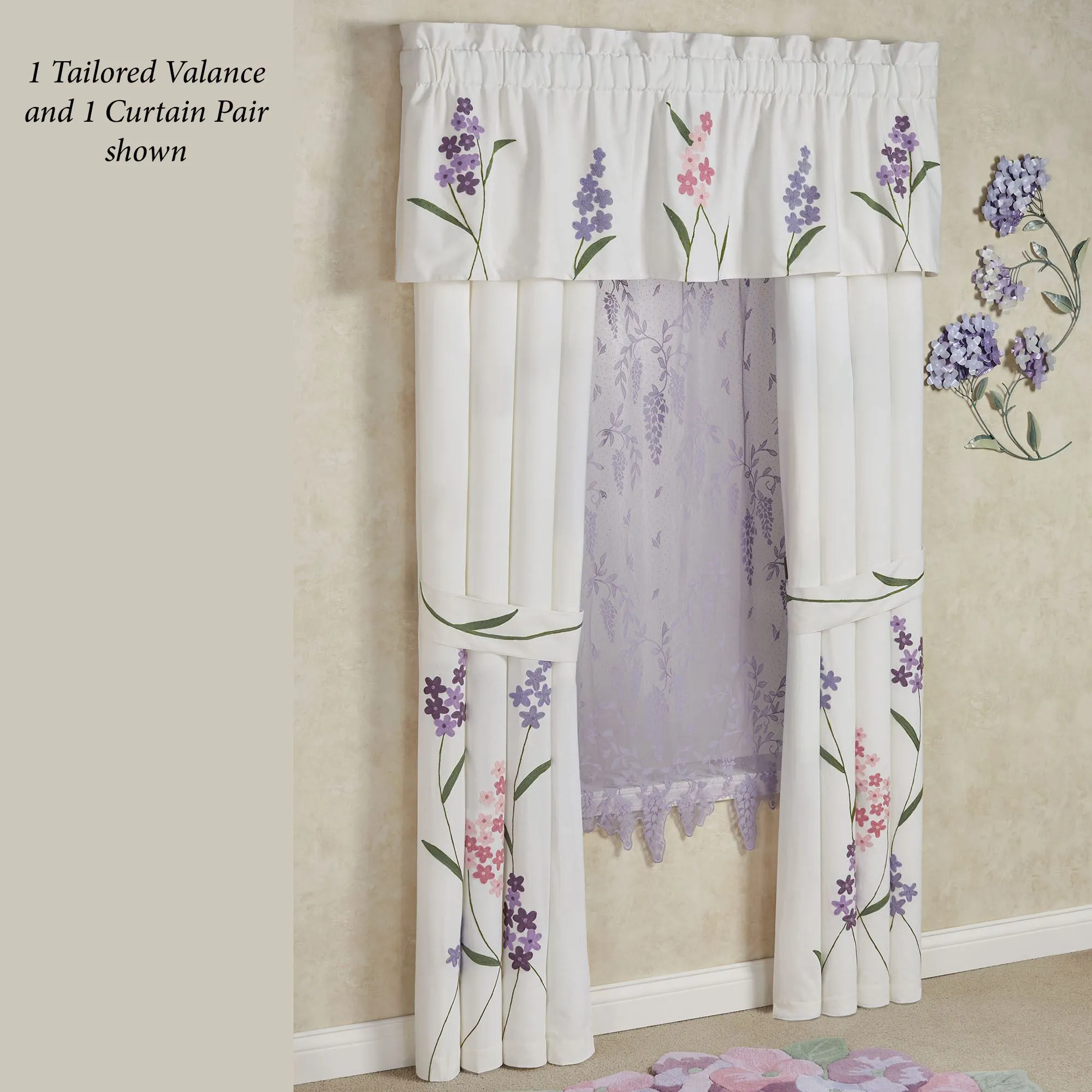 Flourishing with sweet Wildflowers, this blossoming window treatment showcases a lovely spectacle of beautiful flowers. This pre-washed cotton window treatment has floral chainstitch embroidery in delicate shades of pink, rose pink, wisteria, amethyst, plum, periwinkle, and green on solid ivory. Lined window treatment has a 3" rod pocket. Specify Tailored Valance or Tailored Curtain Pair. Tailored Curtains include tiebacks. Machine wash; dry clean for best results. Imported. The curtain pair width is the total width of two panels together.