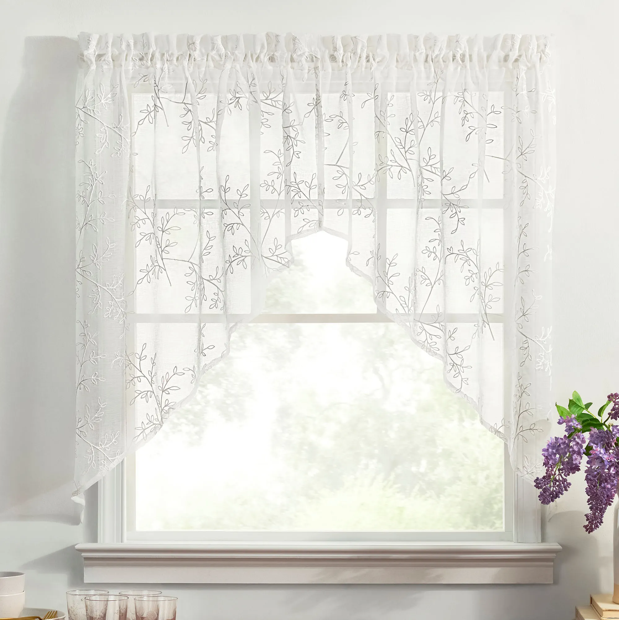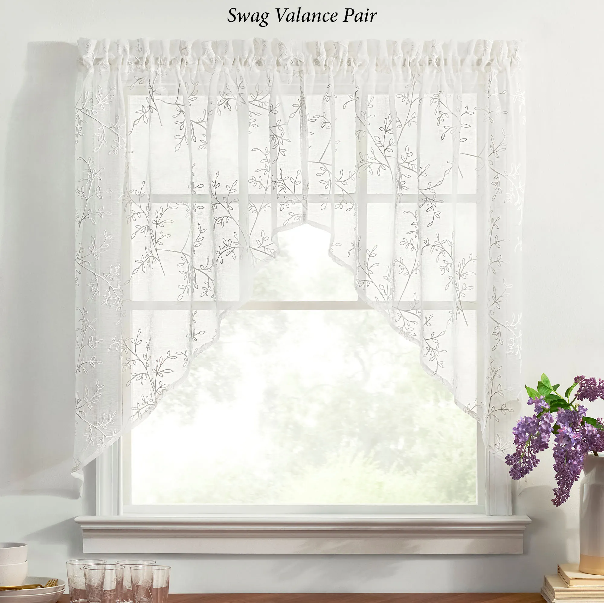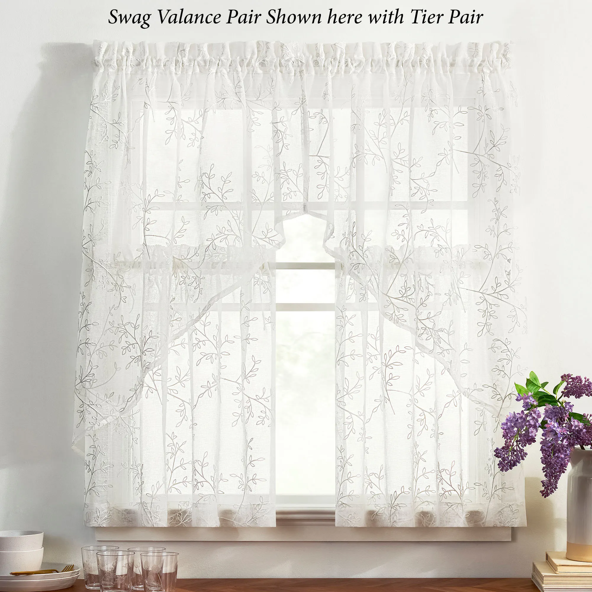 Vining leaf designs accentuate the Willow Bloom Window Treatment with a little bit of nature. This sheer polyester window treatment has embroidered motifs on white and a 1.5" rod pocket. Choose Curtain Panel, Swag Valance Pair, Tailored Valance, or Tier Pair. Machine washable. Imported.