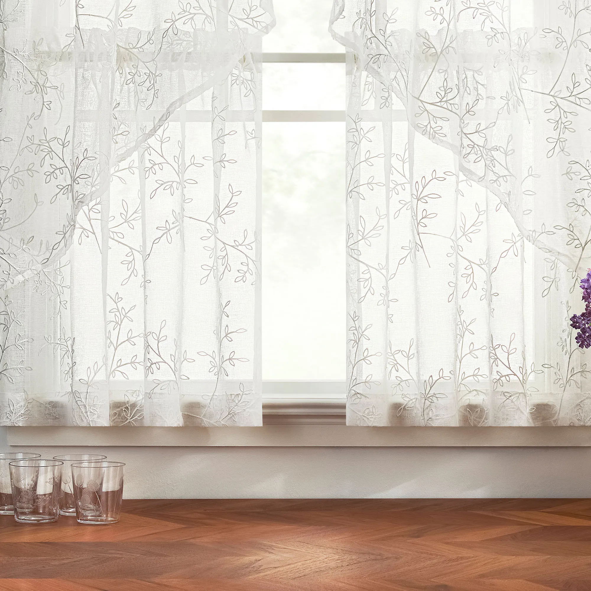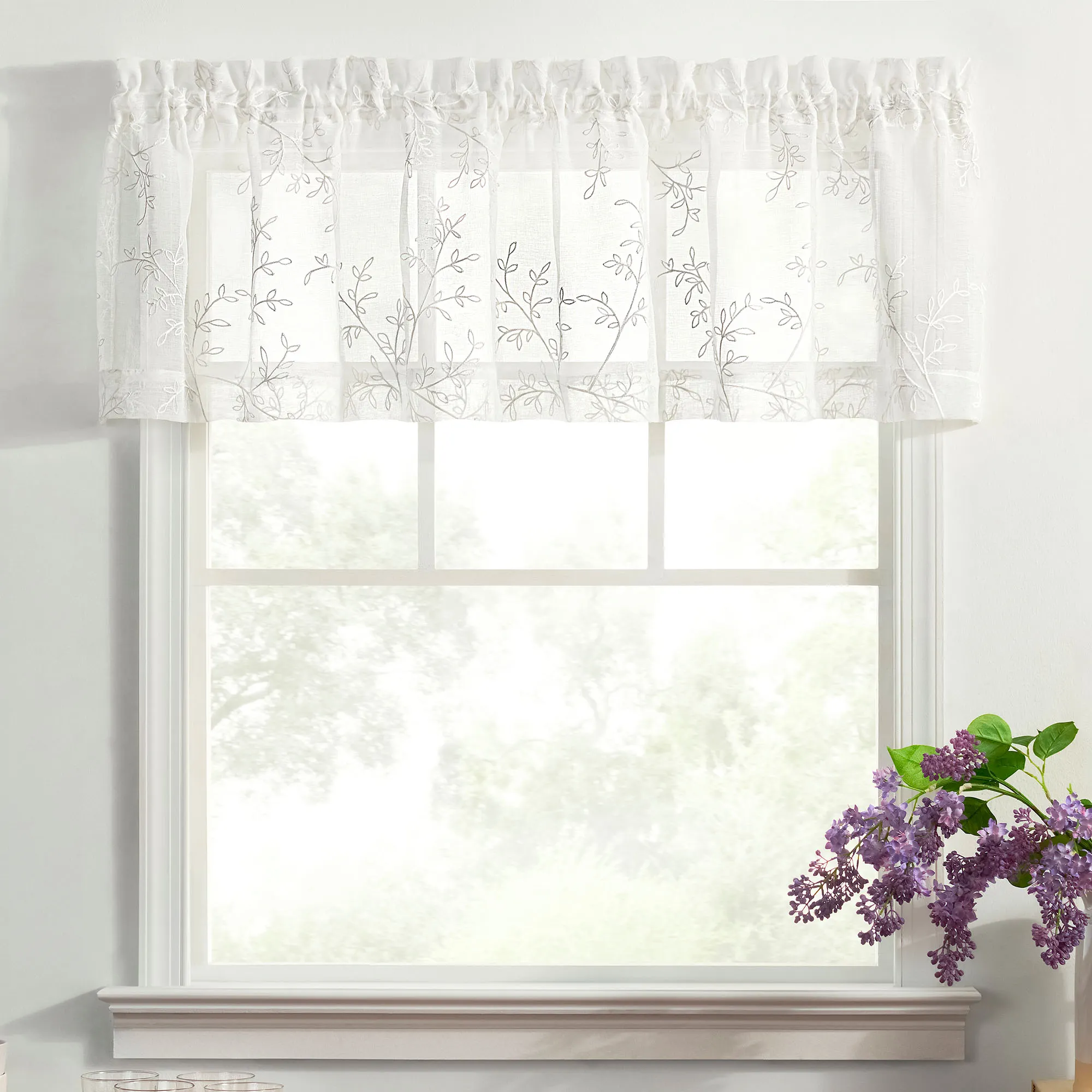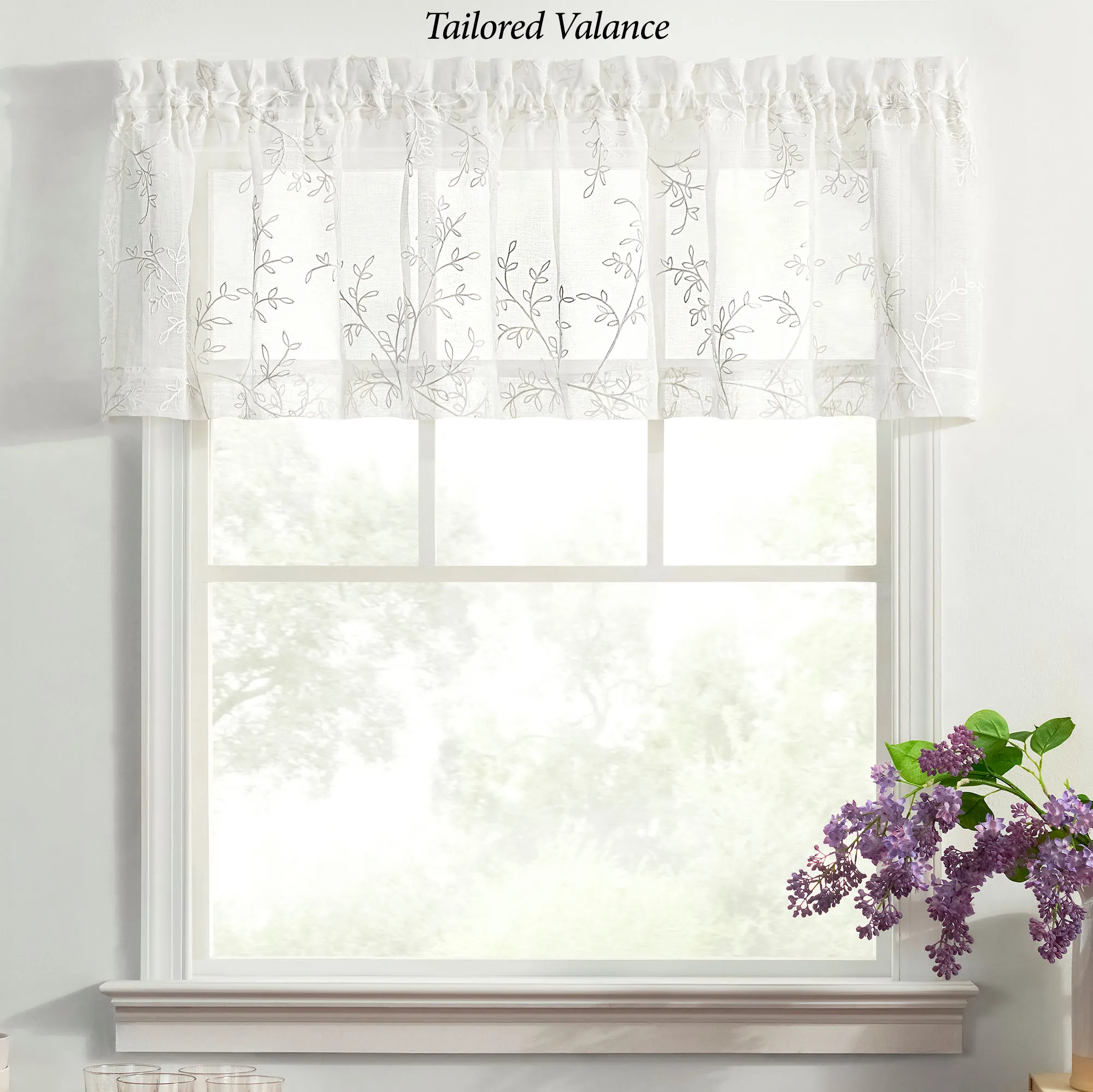 Vining leaf designs accentuate the Willow Bloom Window Treatment with a little bit of nature. This sheer polyester window treatment has embroidered motifs on white and a 1.5" rod pocket. Choose Curtain Panel, Swag Valance Pair, Tailored Valance, or Tier Pair. Machine washable. Imported.
