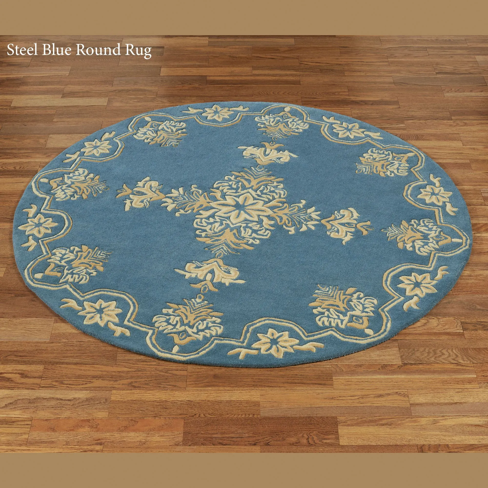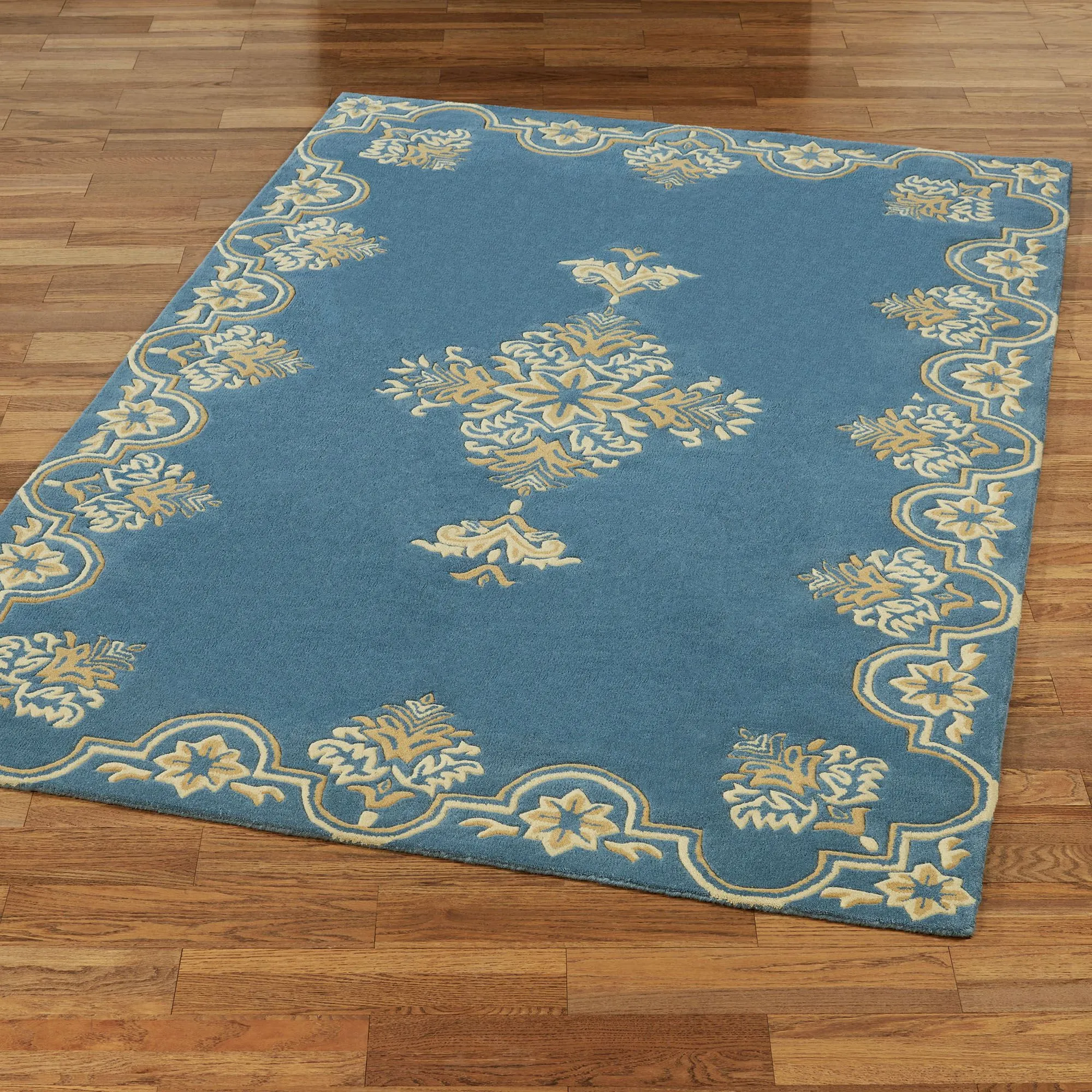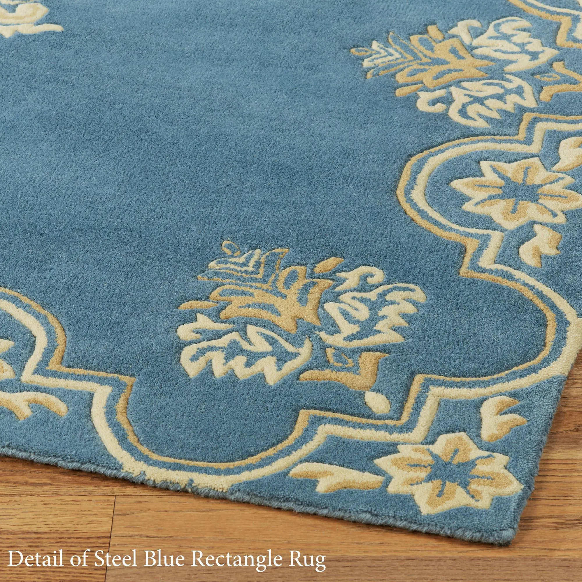 Elegantly display the medallion motifs on the Wilmington Rug. This hand-tufted wool area rug, .75" thick, has a solid steel blue field and handcarved ornate designs in hues of dark gold and cream. Backing is cloth-covered latex. We recommend professional cleaning by a rug cleaner. Imported.