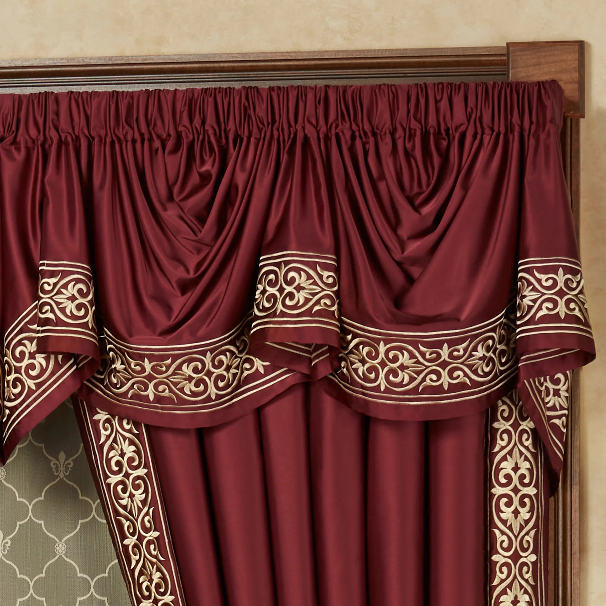 Lined Window Treatments have tailored framed bottom edges and 3" rod pockets. Curtain Pair also has framing on the inside edges and includes tiebacks. Curtains are available in two lengths. Each Ascot Valance has a swag accent. Empire Valance has an embroidered edge. Tailored Valance has a swag accent.