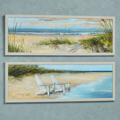 The Wind Water Framed Wall Art Set captures beautiful days along the shore. Presented by Paragon from original acrylic paintings by Sally Swatland, each wall art print has classic coastal hues of blue, green, tan, and white completed by a textured acrylic overlay done by hand. One print features an expansive sandy beach while seagulls fly overhead. The other print features two Adirondack chairs waiting on the surf's edge. A whitewashed polystyrene frame finishes each. Overall, each framed wall art measures 36"Wx1"Dx13"H.