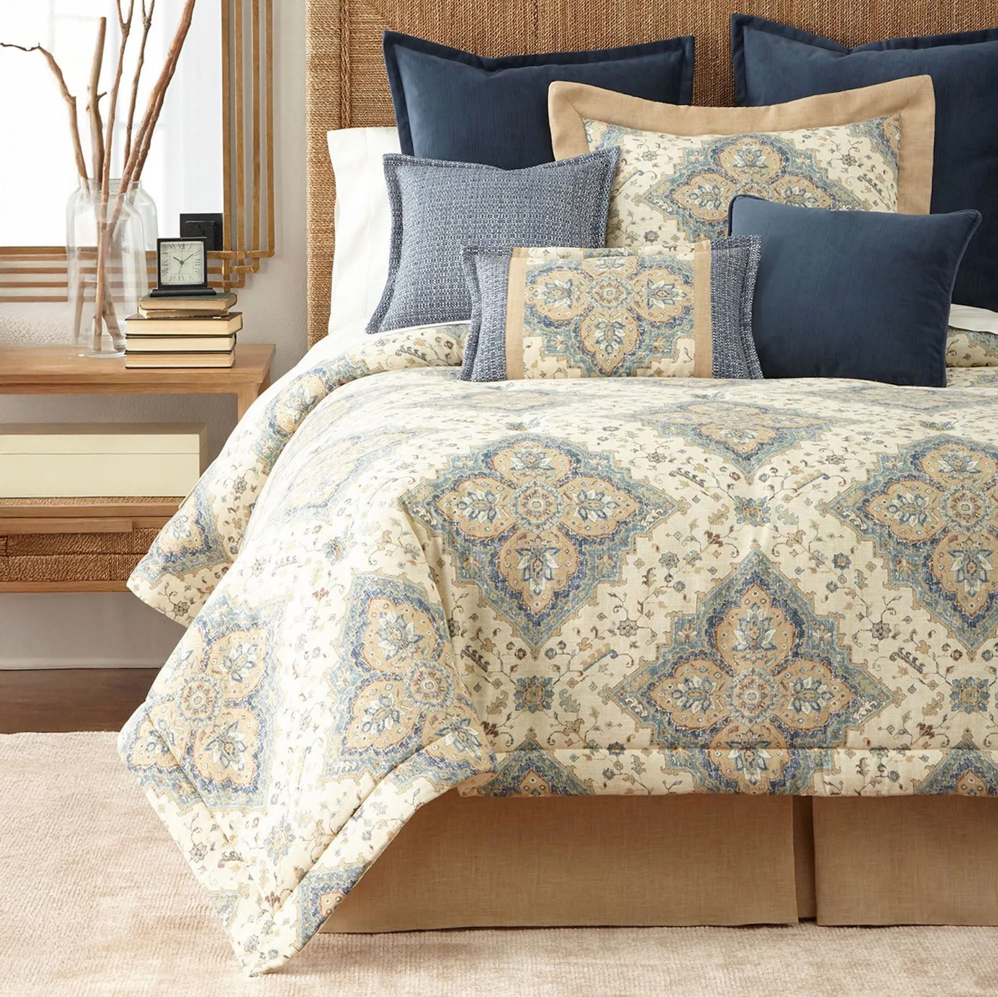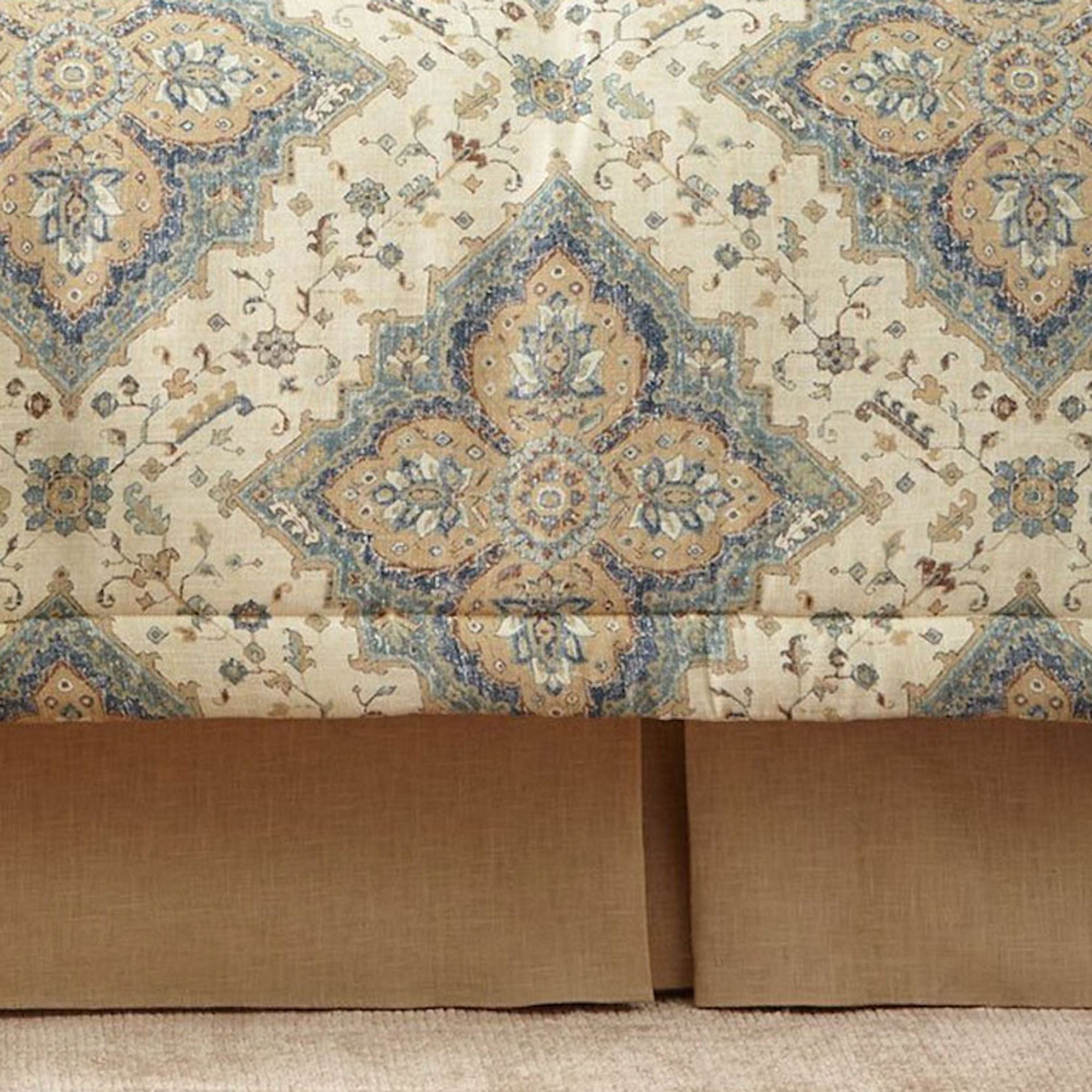 Invite good fortune and classic style into your space with the Windfall Bedding. From Sherry Kline, the linen/viscose-blend ensemble features elaborately detailed diamond-shaped medallion designs filled with timeless florals, leaves, and vines. Soft shades of blue, green, white, and honey color the motifs on the neutral ecru ground. Solid navy velvet polyester and woven mingled navy and white polyester/cotton/acrylic/rayon-blend elements complete the ensemble with an understated air.
