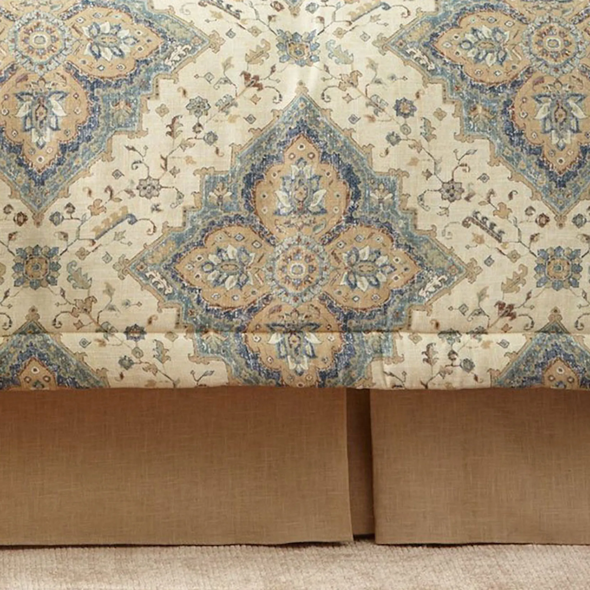 The 17" drop Bedskirt is honey-hued linen with kick pleats and split corners. Choose Queen or King.