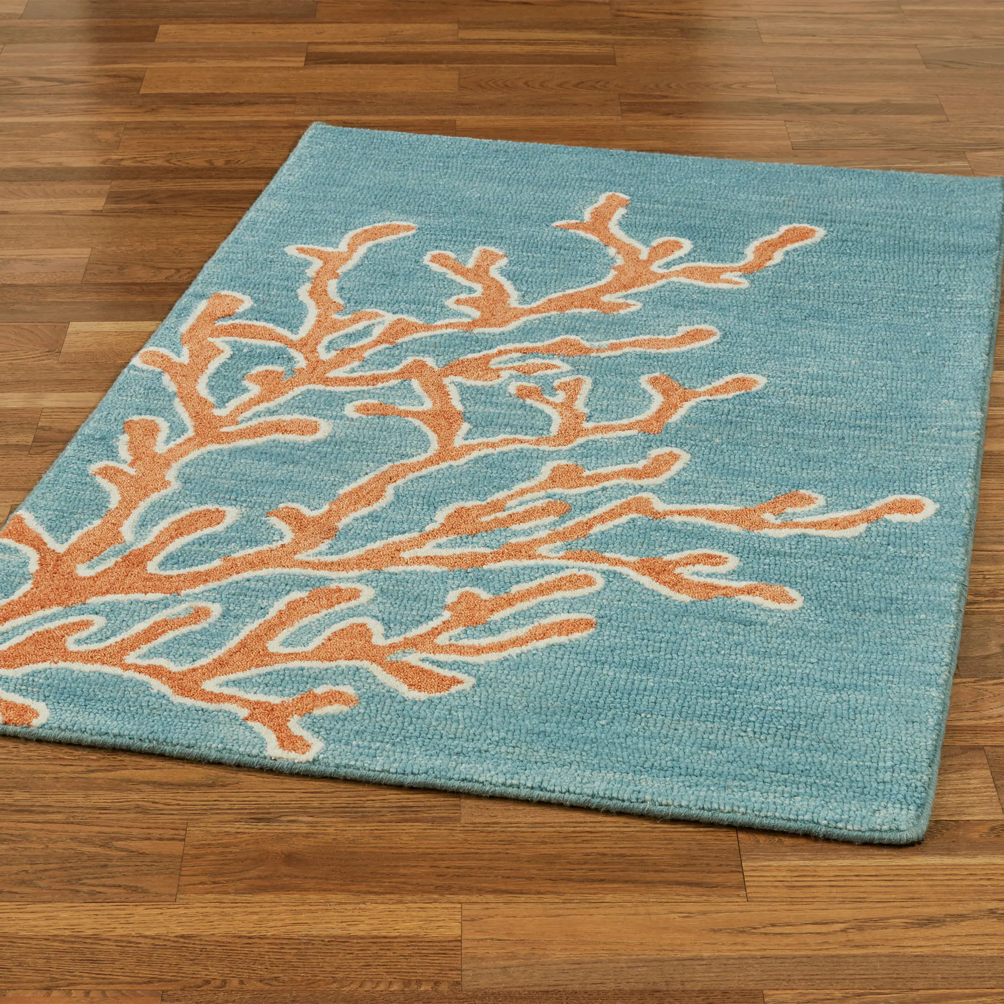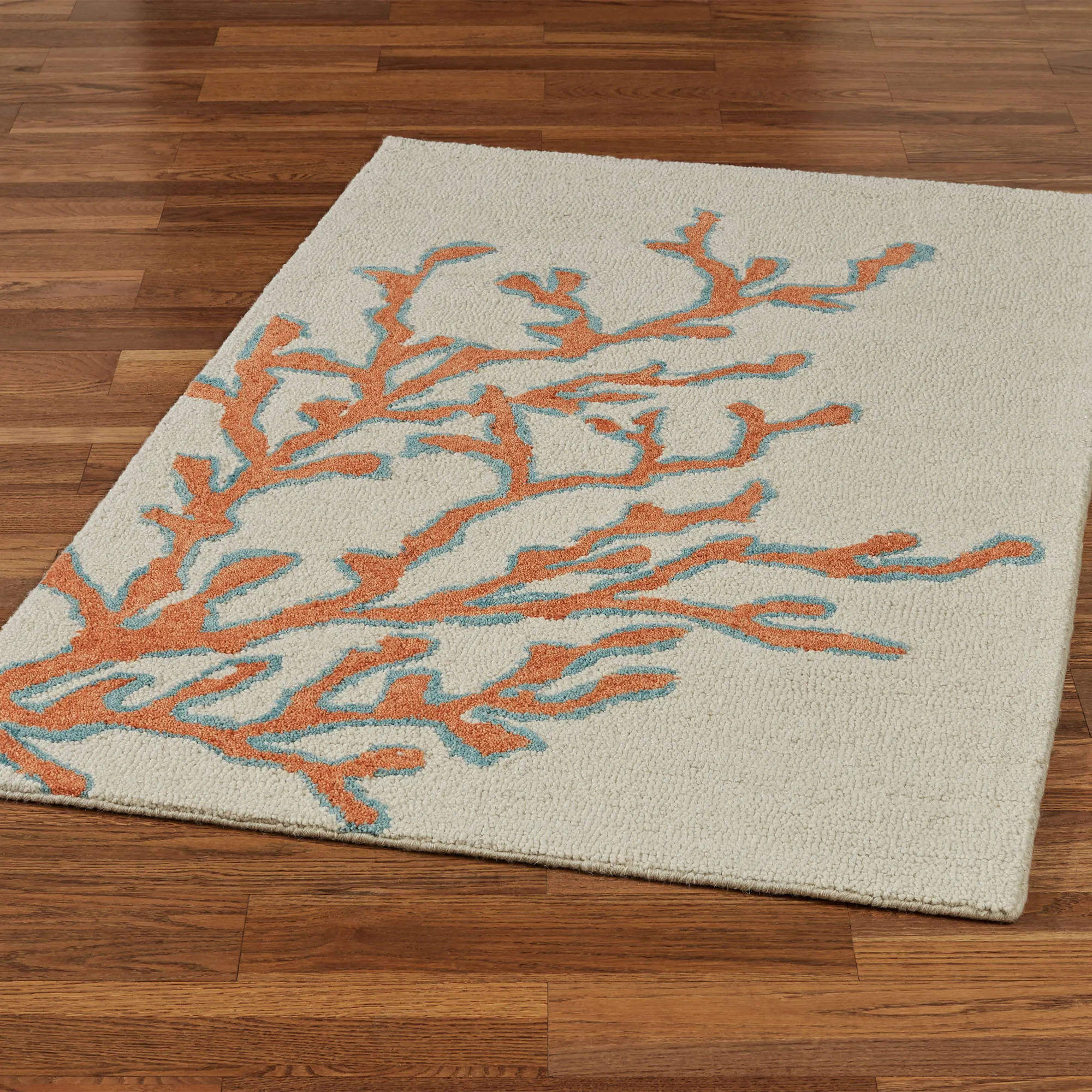 The Windham Coastal Area Rug transforms your home into the sea floor. Hand-tufted in India, the .5" thick, cut-and-loop wool rug features a reaching coral design on a variegated background, all in hues of aqua, melon, ivory, and teal. Hand-serged edges and a cotton canvas backing complete the rug. Indoor use only. We recommend professional cleaning by a rug cleaner.