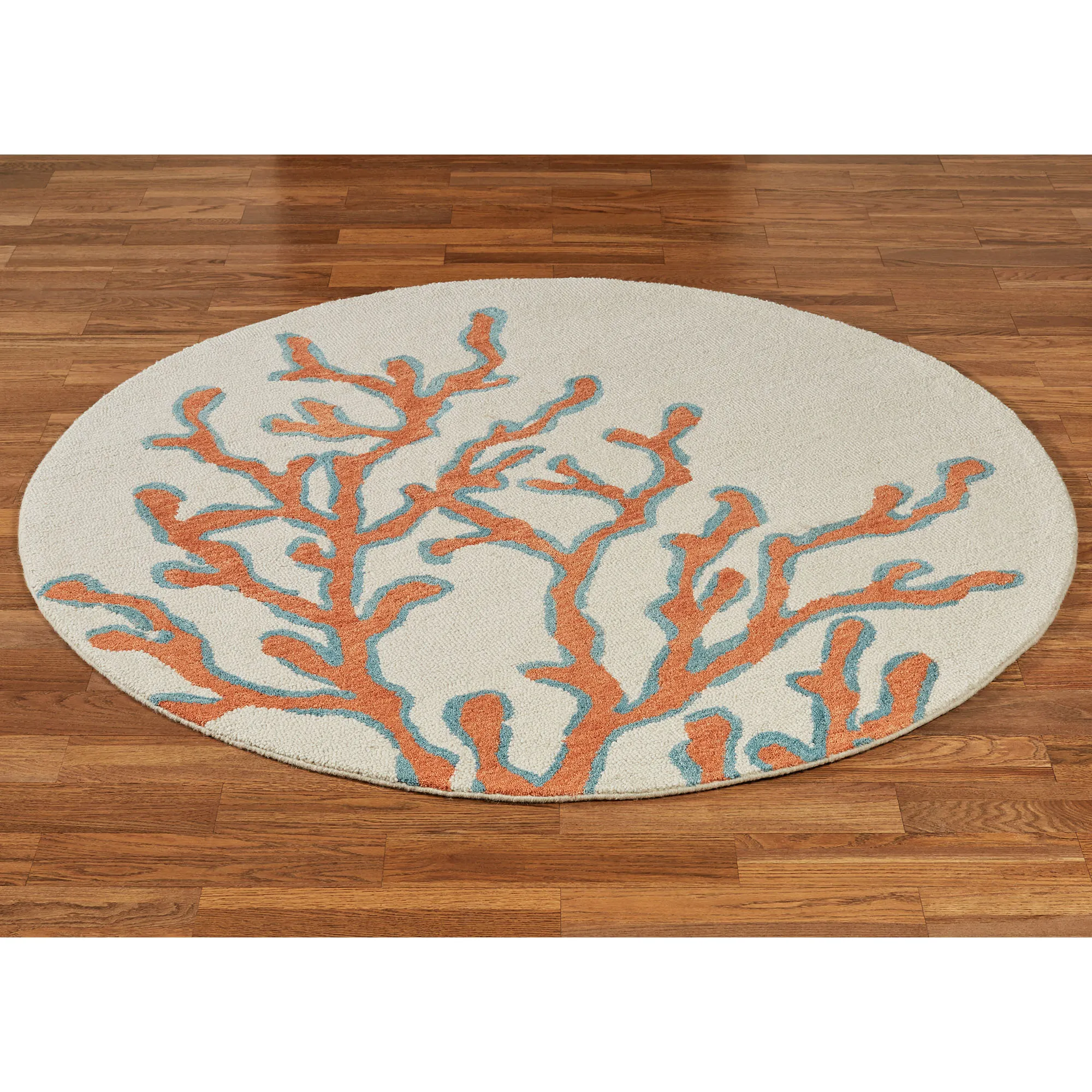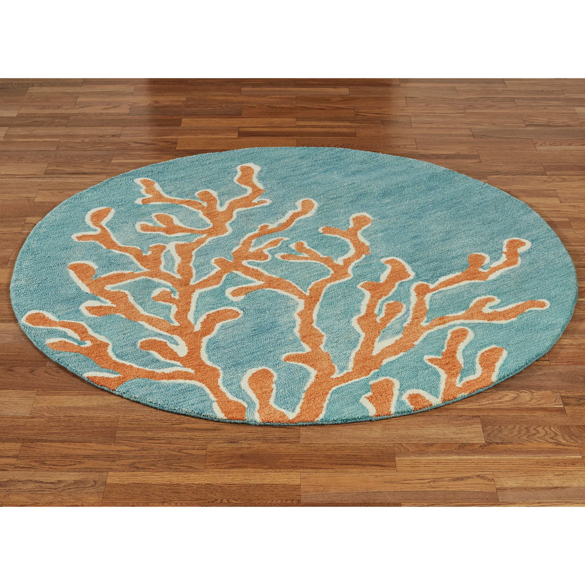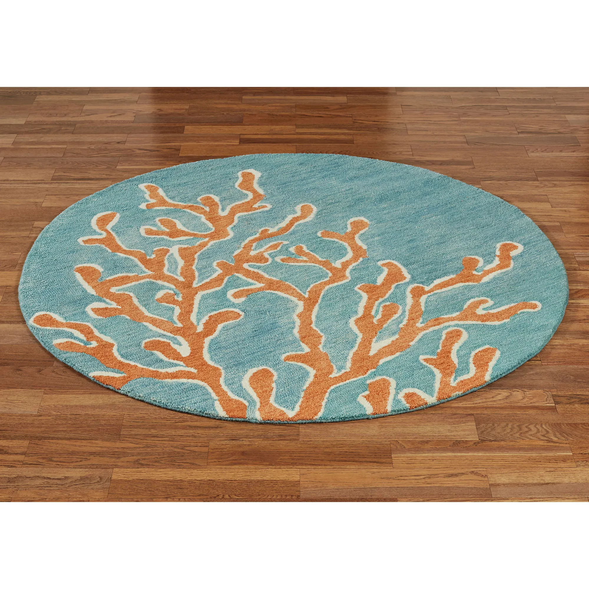 The Windham Coastal Round Rug transforms your home into the sea floor. Hand-tufted in India, the .5" thick, cut-and-loop wool round rug features a reaching coral design on a variegated background, all in hues of aqua, melon, ivory, and teal. Hand-serged edges and a cotton canvas backing complete the rug. Indoor use only. We recommend professional cleaning by a rug cleaner.