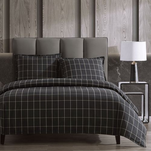 The Black Windowpane Plaid Bedding has a timeless look that will never go out of style. The Mini Comforter Set includes a comforter and sham(s). This polyester/cotton bedding has a gold design on a woven, solid black, yarn-dyed background. Oversized, tailored comforter has a beige cotton backing; fill is polyester. Reversible sham(s) has flanged ends and a zipper closure(s). Machine washable. Imported.