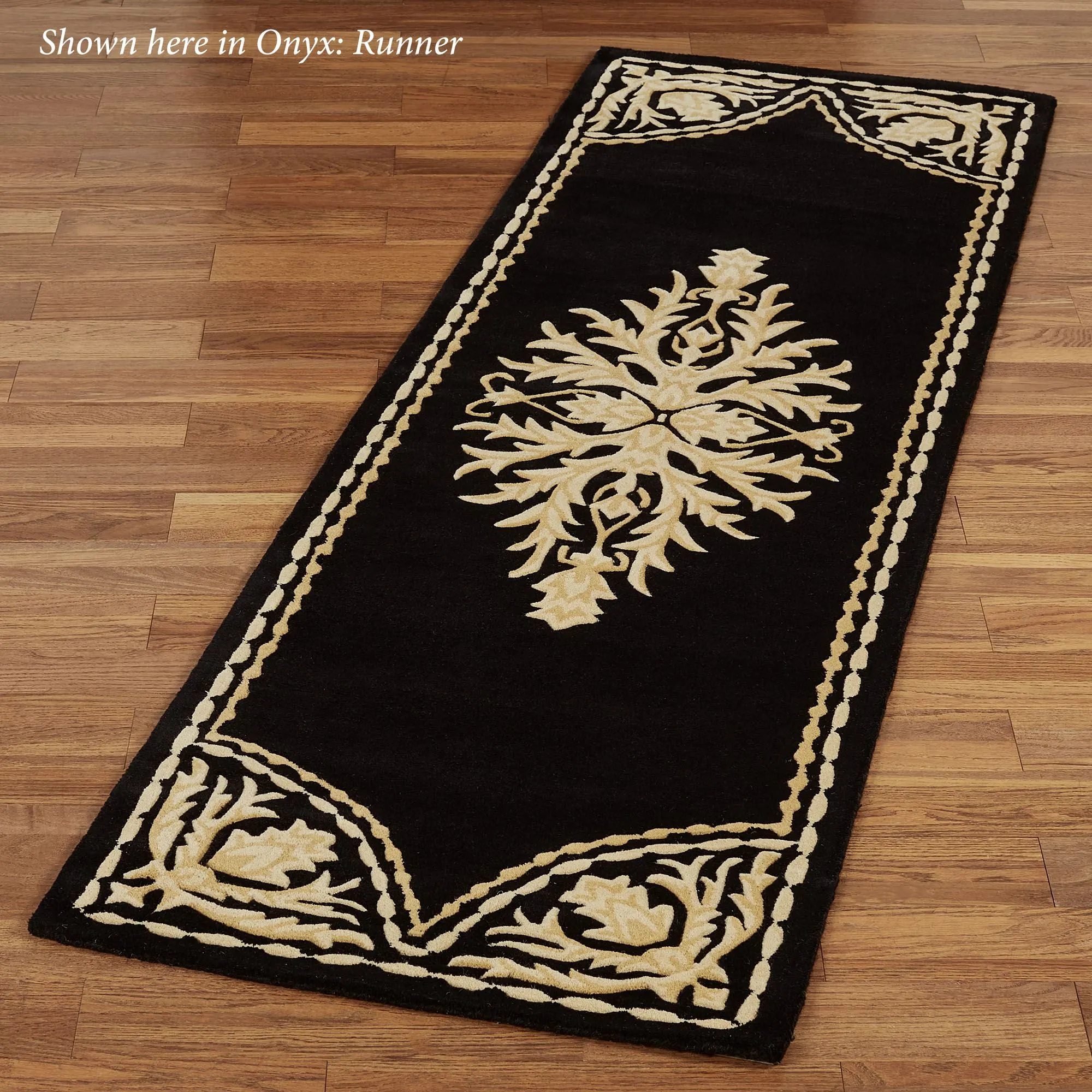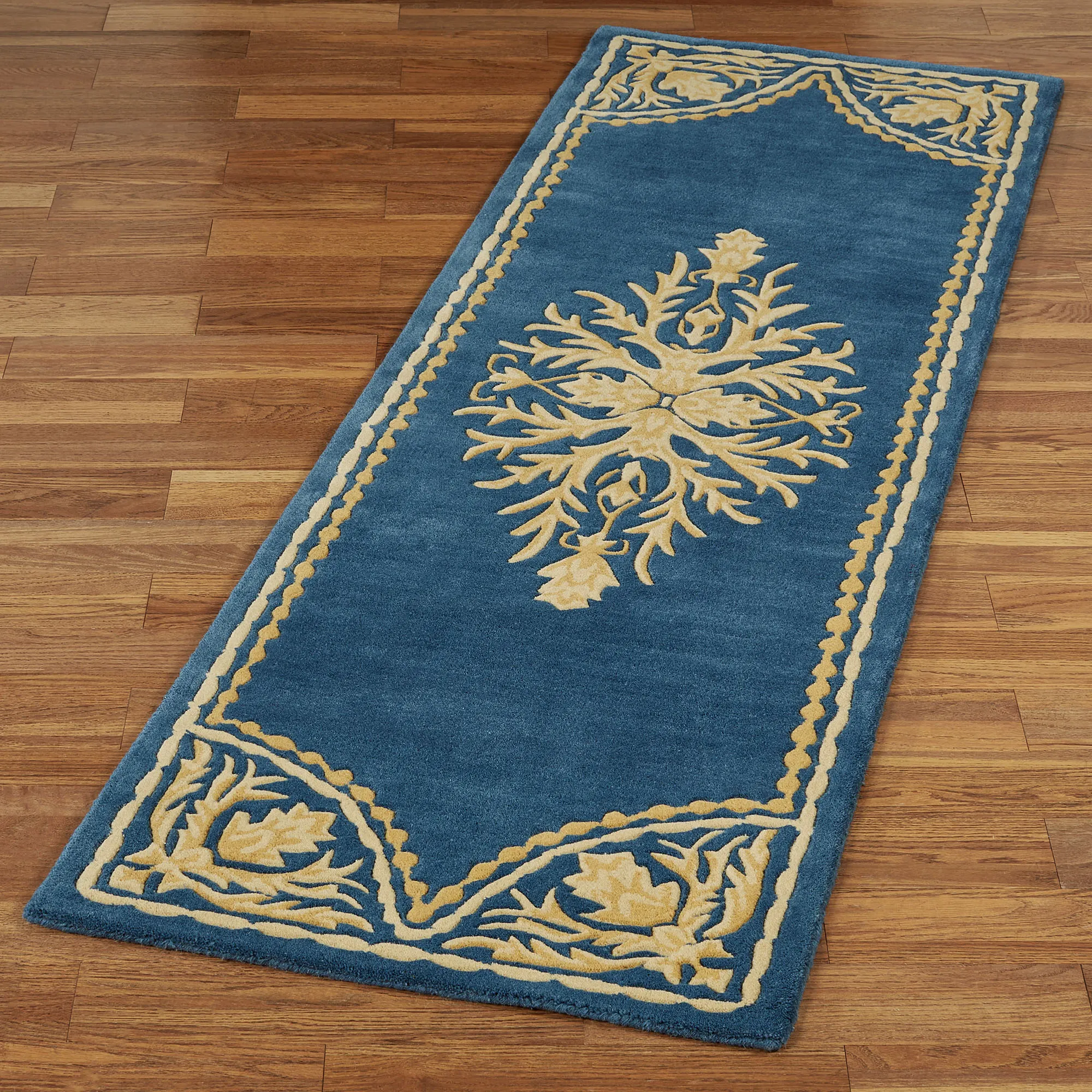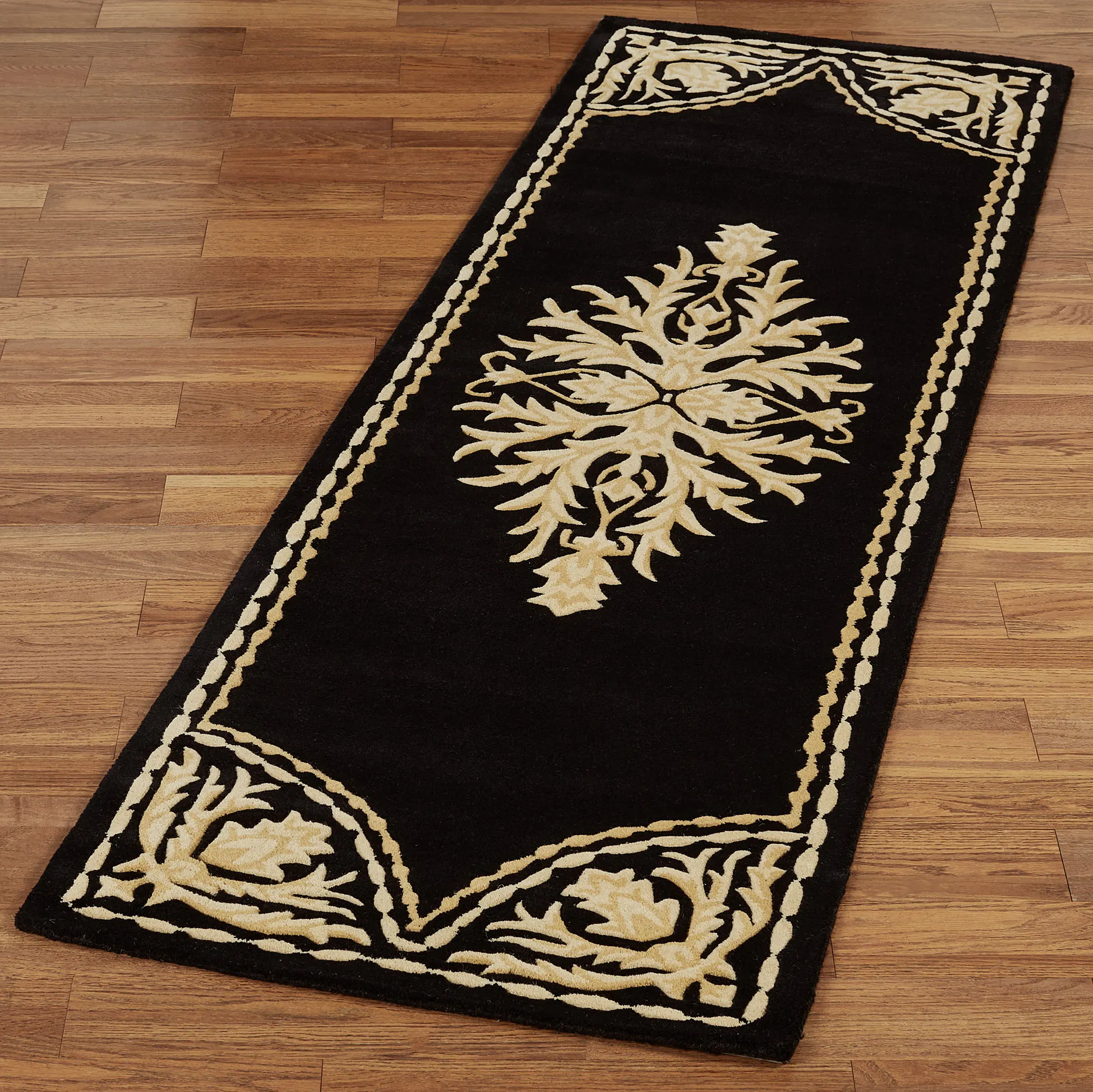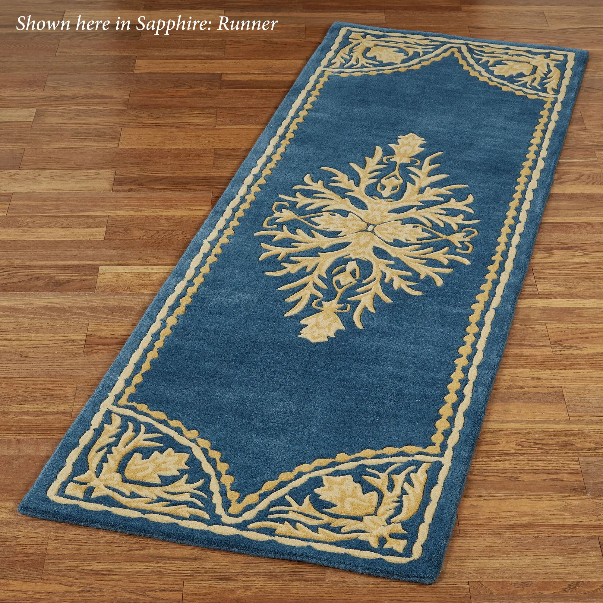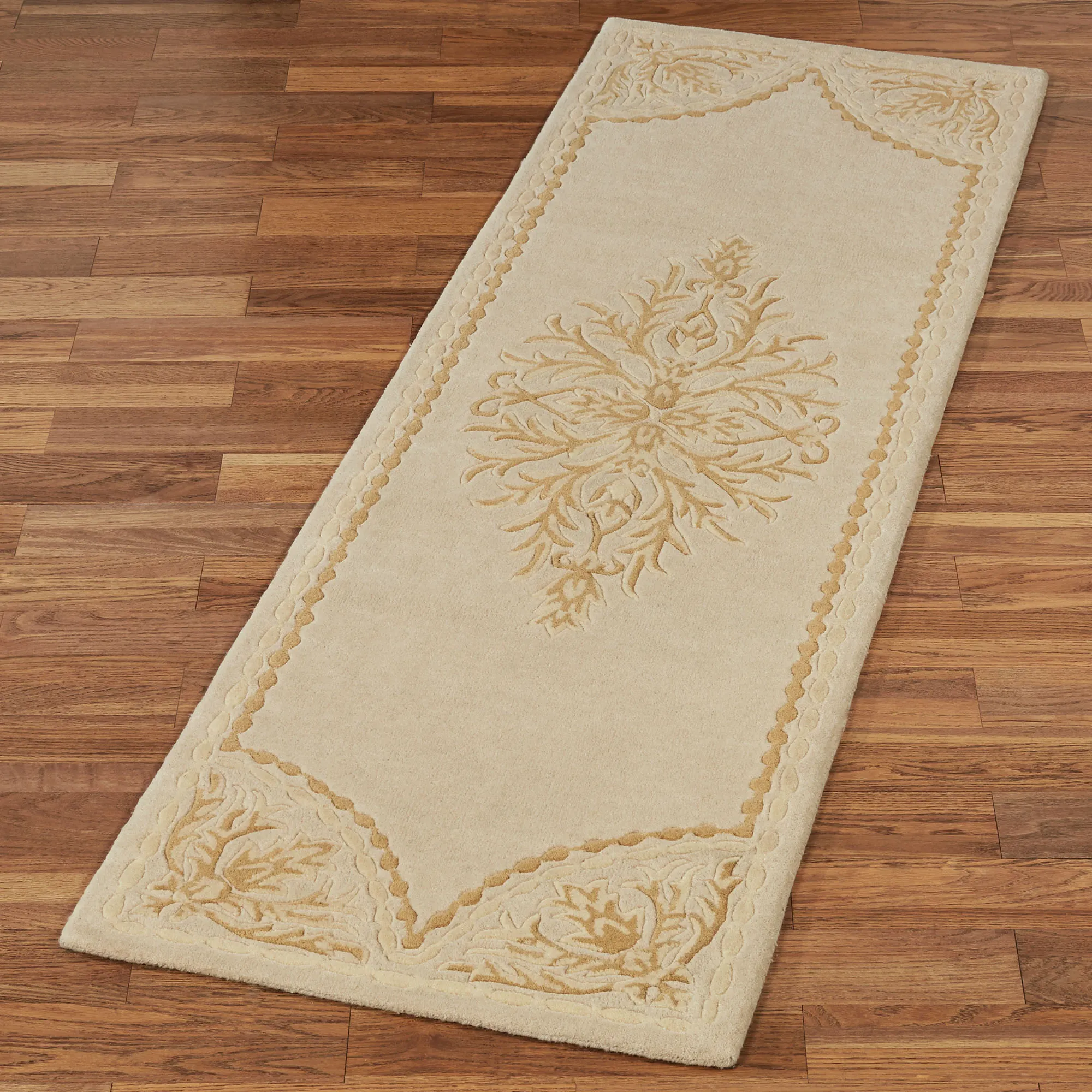 Scrolling acanthus leaves and ornate motifs give the Windsor Rug Runner its sophisticated look. This hand-tufted wool rug, .5" thick, has handcarved designs in ivory and light gold on a solid color background. Backing is cloth-covered latex. We recommend professional cleaning by a rug cleaner. Imported.